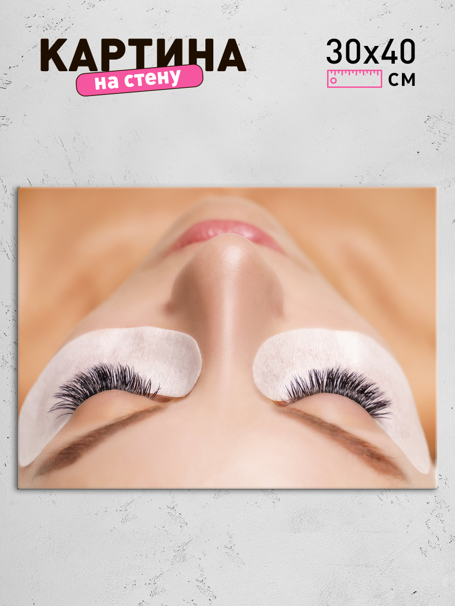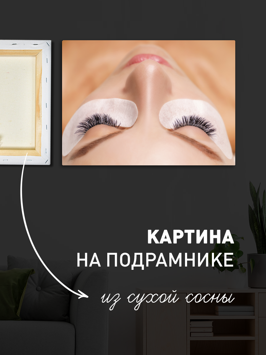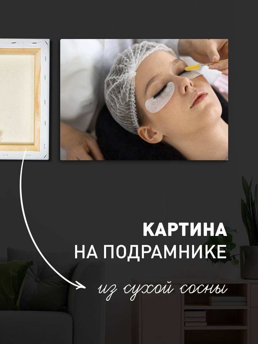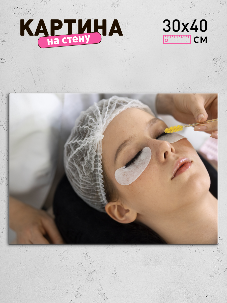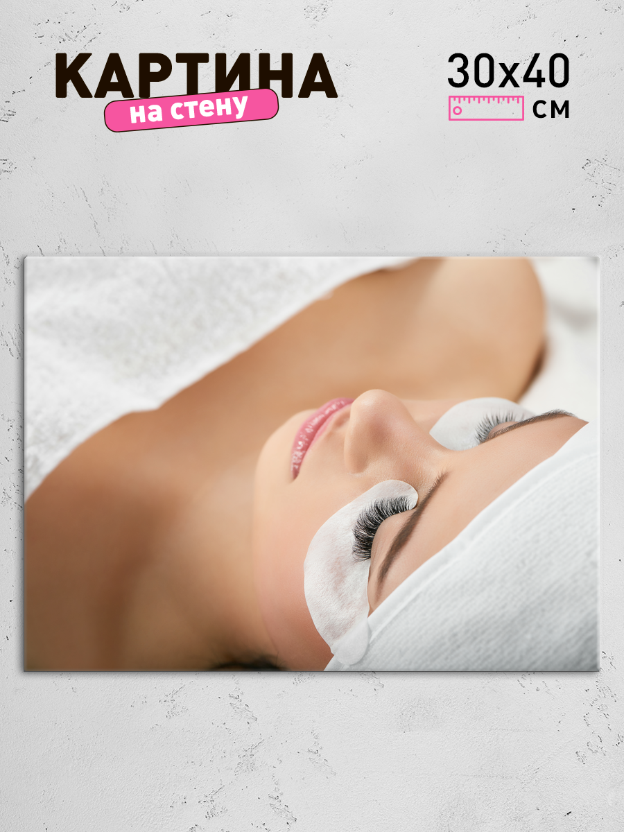 Описание: Картина 50 на 70 "Идеальный Взгляд: Наращивание Ресниц". **Описание и Уникальность:** Эта картина запечатлела момент преображения и ухода за собой: крупный план лица женщины, лежащей на процедуре наращивания ресниц. Основное внимание сосредоточено на глазах, обрамленных длинными, густыми и идеально изогнутыми искусственными ресницами, и закрытых специальными белыми патчами. Уникальность композиции заключается в контрасте между нежной белизной полотенца и патчей, и насыщенной чернотой роскошных ресниц, подчеркивающих красоту и тщательность процесса. Светлые бежевые и персиковые тона кожи создают ощущение тепла и расслабления, а легкий блеск на губах добавляет финальный штрих женственности. **Эмоции и Впечатления:** Картина излучает спокойствие, утонченность и заботу о себе. Она вызывает чувство релаксации, ассоциирующееся с салоном красоты или спа-процедурами. Зритель, глядя на этот образ, ощущает эстетическое удовольствие от совершенства работы мастера и предвкушение мгновенного, улучшенного образа. Это идеальный визуальный якорь для тех, кто ценит красоту, профессионализм и внимание к деталям. **Рекомендации по Интерьеру:** Данное полотно идеально впишется в интерьер салона красоты, особенно если он специализируется на лашмейкинге, косметологии или бьюти-услугах. Картина станет стильным и профессиональным акцентом в приемной зоне или кабинете мастера. Также она прекрасно дополнит современный домашний интерьер в стиле минимализм, сканди или гламур, особенно в женской спальне, гардеробной или ванной комнате, подчеркивая любовь хозяйки к уходу за собой и стилю. Светлая палитра (белый, бежевый) позволяет легко интегрировать картину в уже существующую цветовую схему.