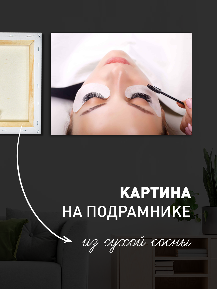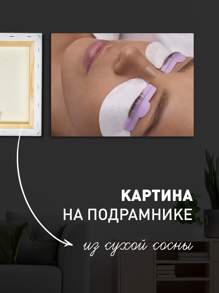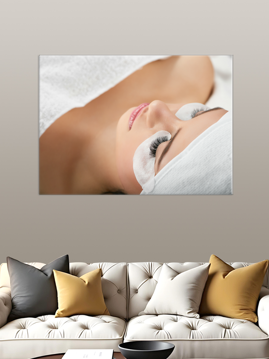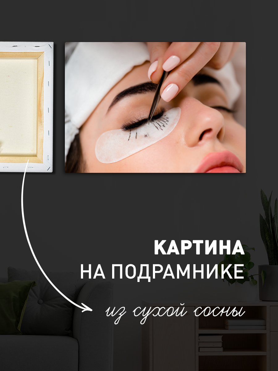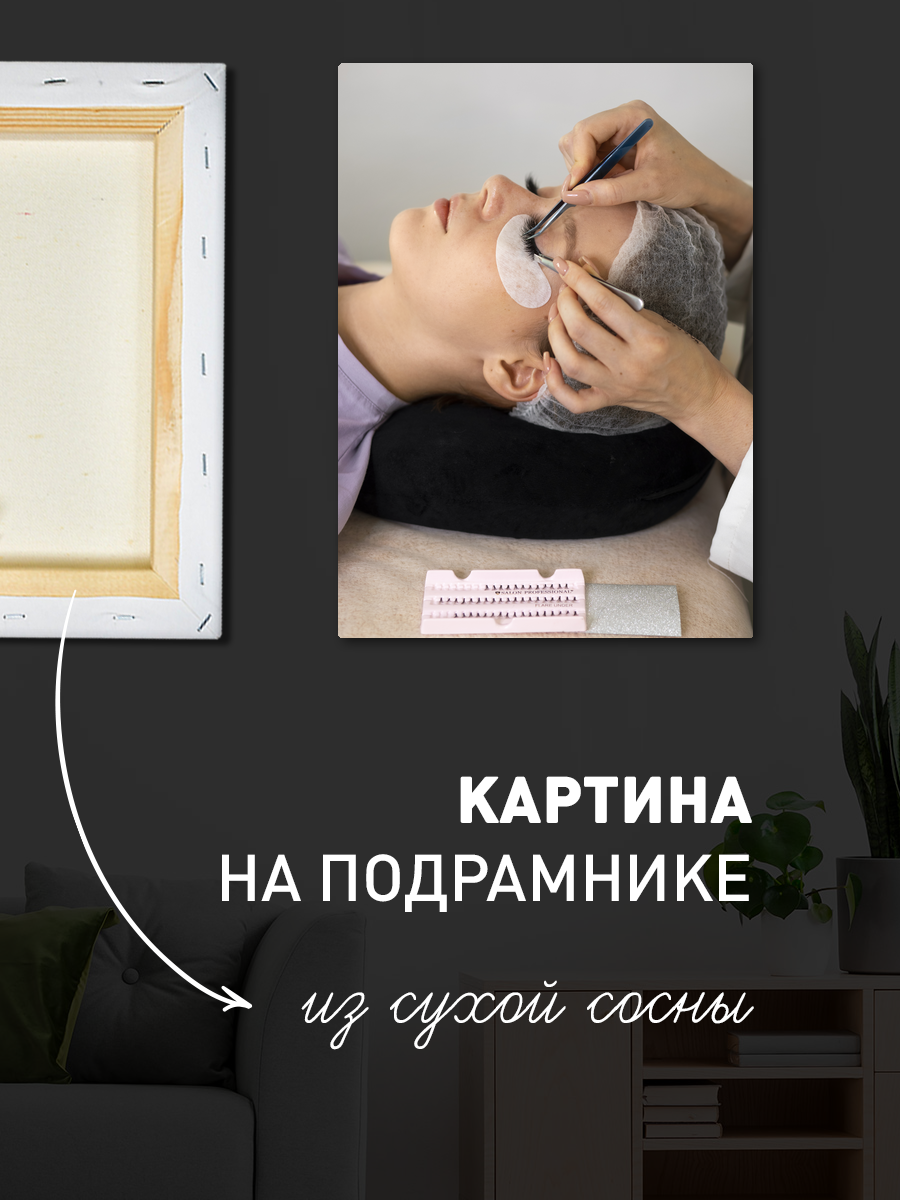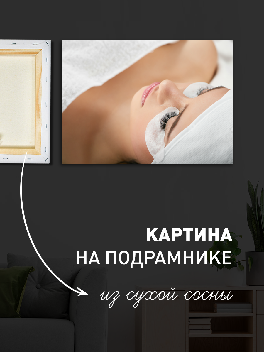 Описание: Картина 50 на 70 "Идеальный Взгляд: Наращивание Ресниц". **Описание и Уникальность:** Эта картина запечатлела момент преображения и ухода за собой: крупный план лица женщины, лежащей на процедуре наращивания ресниц. Основное внимание сосредоточено на глазах, обрамленных длинными, густыми и идеально изогнутыми искусственными ресницами, и закрытых специальными белыми патчами. Уникальность композиции заключается в контрасте между нежной белизной полотенца и патчей, и насыщенной чернотой роскошных ресниц, подчеркивающих красоту и тщательность процесса. Светлые бежевые и персиковые тона кожи создают ощущение тепла и расслабления, а легкий блеск на губах добавляет финальный штрих женственности. **Эмоции и Впечатления:** Картина излучает спокойствие, утонченность и заботу о себе. Она вызывает чувство релаксации, ассоциирующееся с салоном красоты или спа-процедурами. Зритель, глядя на этот образ, ощущает эстетическое удовольствие от совершенства работы мастера и предвкушение мгновенного, улучшенного образа. Это идеальный визуальный якорь для тех, кто ценит красоту, профессионализм и внимание к деталям. **Рекомендации по Интерьеру:** Данное полотно идеально впишется в интерьер салона красоты, особенно если он специализируется на лашмейкинге, косметологии или бьюти-услугах. Картина станет стильным и профессиональным акцентом в приемной зоне или кабинете мастера. Также она прекрасно дополнит современный домашний интерьер в стиле минимализм, сканди или гламур, особенно в женской спальне, гардеробной или ванной комнате, подчеркивая любовь хозяйки к уходу за собой и стилю. Светлая палитра (белый, бежевый) позволяет легко интегрировать картину в уже существующую цветовую схему.