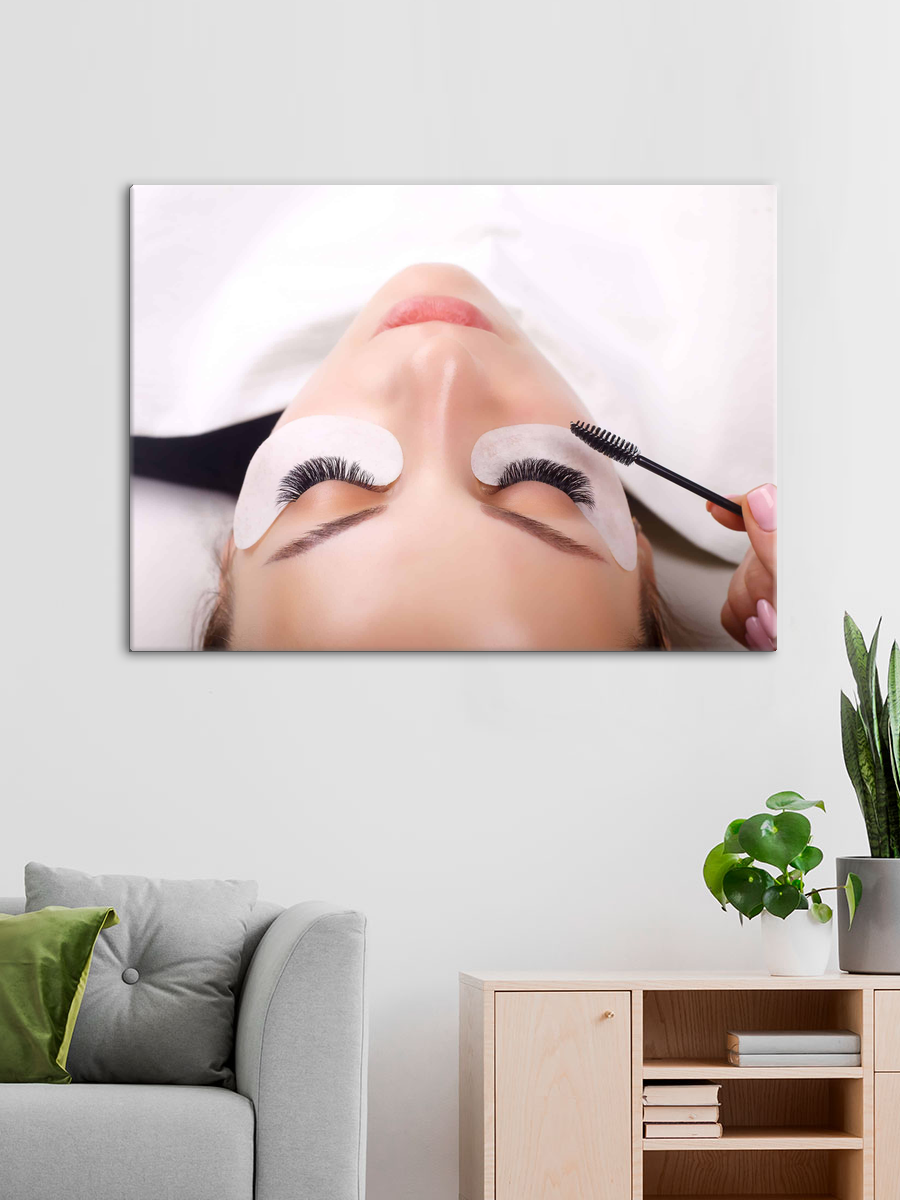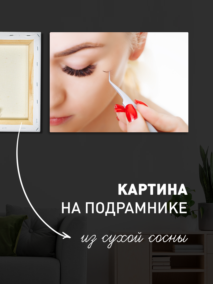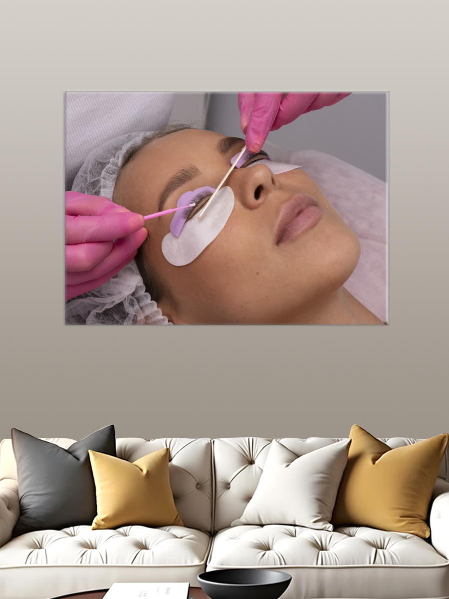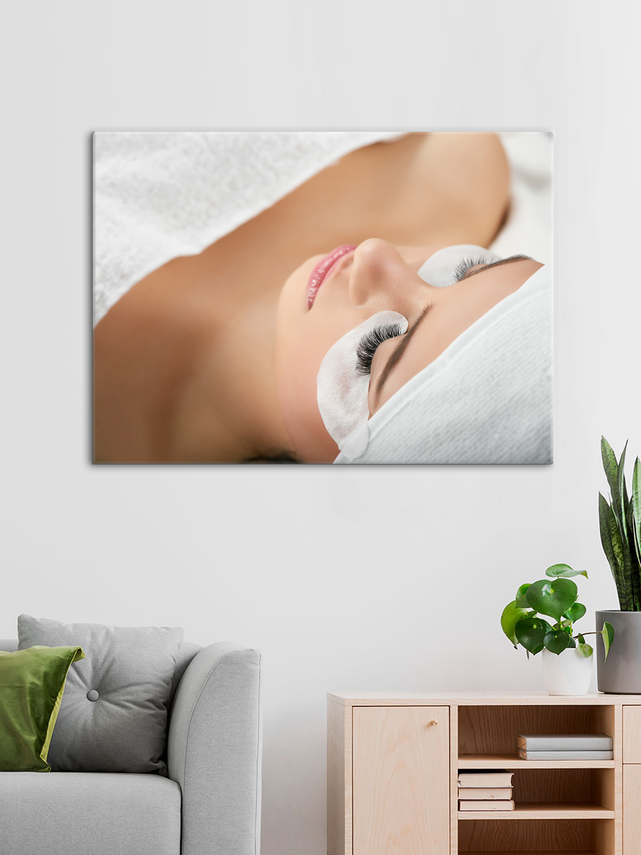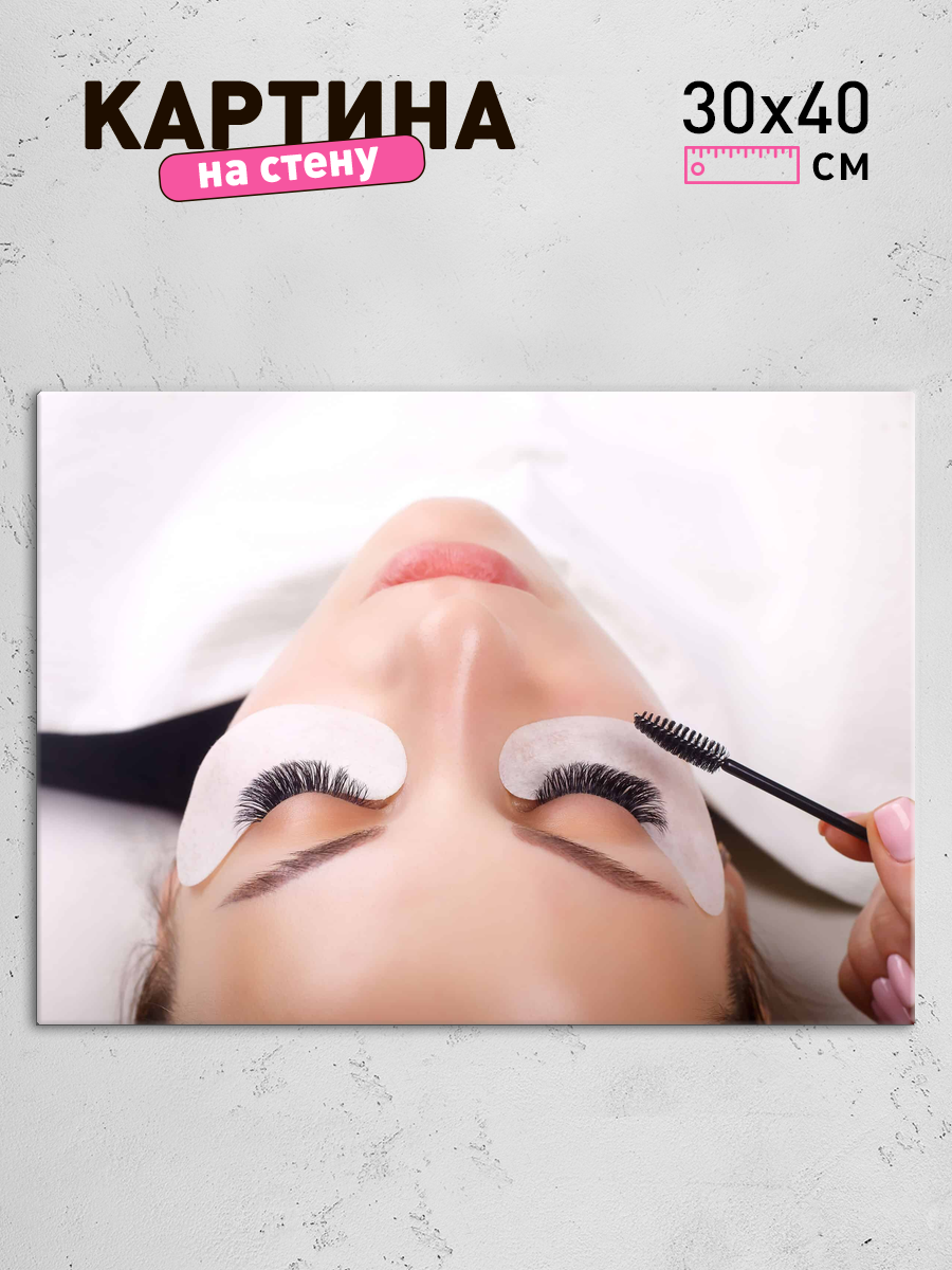 Описание: Картина 50 на 70 "Идеальный Взгляд: Наращивание Ресниц". **Описание и Уникальность:** Эта картина запечатлела момент преображения и ухода за собой: крупный план лица женщины, лежащей на процедуре наращивания ресниц. Основное внимание сосредоточено на глазах, обрамленных длинными, густыми и идеально изогнутыми искусственными ресницами, и закрытых специальными белыми патчами. Уникальность композиции заключается в контрасте между нежной белизной полотенца и патчей, и насыщенной чернотой роскошных ресниц, подчеркивающих красоту и тщательность процесса. Светлые бежевые и персиковые тона кожи создают ощущение тепла и расслабления, а легкий блеск на губах добавляет финальный штрих женственности. **Эмоции и Впечатления:** Картина излучает спокойствие, утонченность и заботу о себе. Она вызывает чувство релаксации, ассоциирующееся с салоном красоты или спа-процедурами. Зритель, глядя на этот образ, ощущает эстетическое удовольствие от совершенства работы мастера и предвкушение мгновенного, улучшенного образа. Это идеальный визуальный якорь для тех, кто ценит красоту, профессионализм и внимание к деталям. **Рекомендации по Интерьеру:** Данное полотно идеально впишется в интерьер салона красоты, особенно если он специализируется на лашмейкинге, косметологии или бьюти-услугах. Картина станет стильным и профессиональным акцентом в приемной зоне или кабинете мастера. Также она прекрасно дополнит современный домашний интерьер в стиле минимализм, сканди или гламур, особенно в женской спальне, гардеробной или ванной комнате, подчеркивая любовь хозяйки к уходу за собой и стилю. Светлая палитра (белый, бежевый) позволяет легко интегрировать картину в уже существующую цветовую схему.