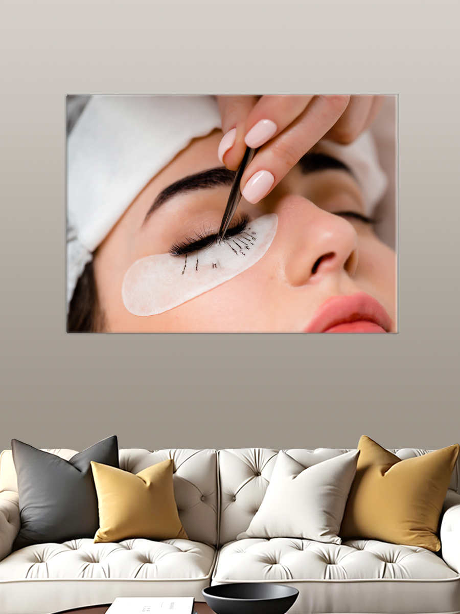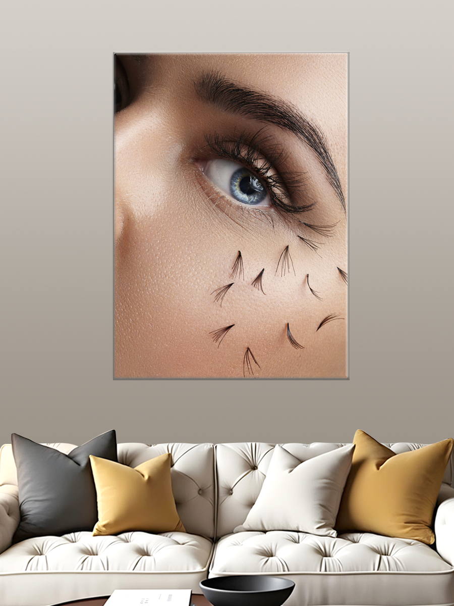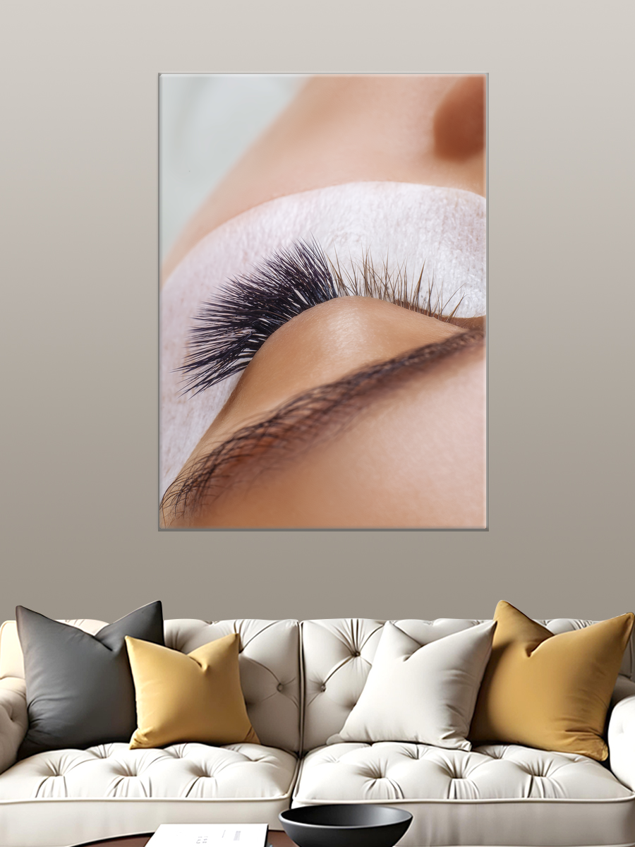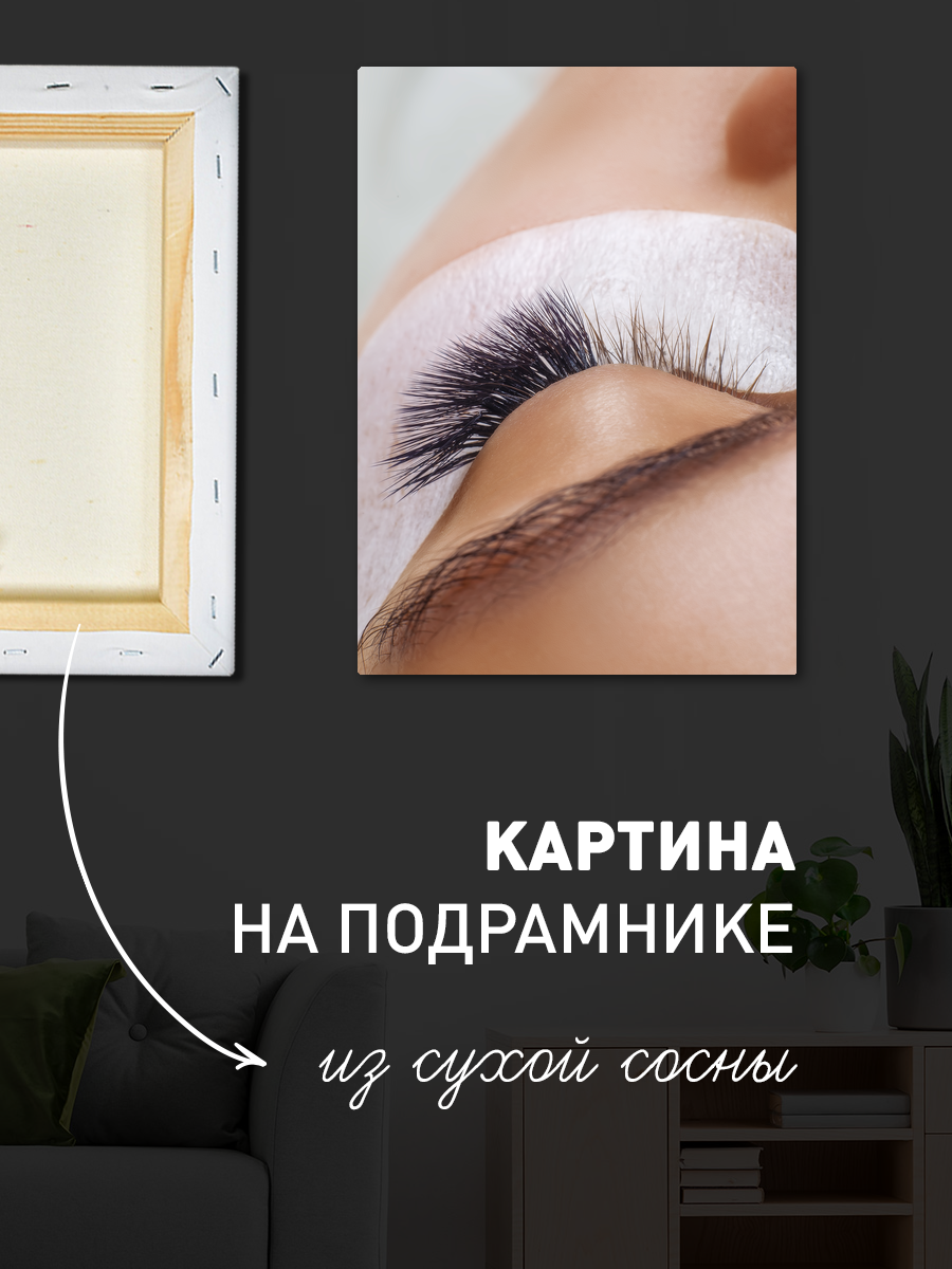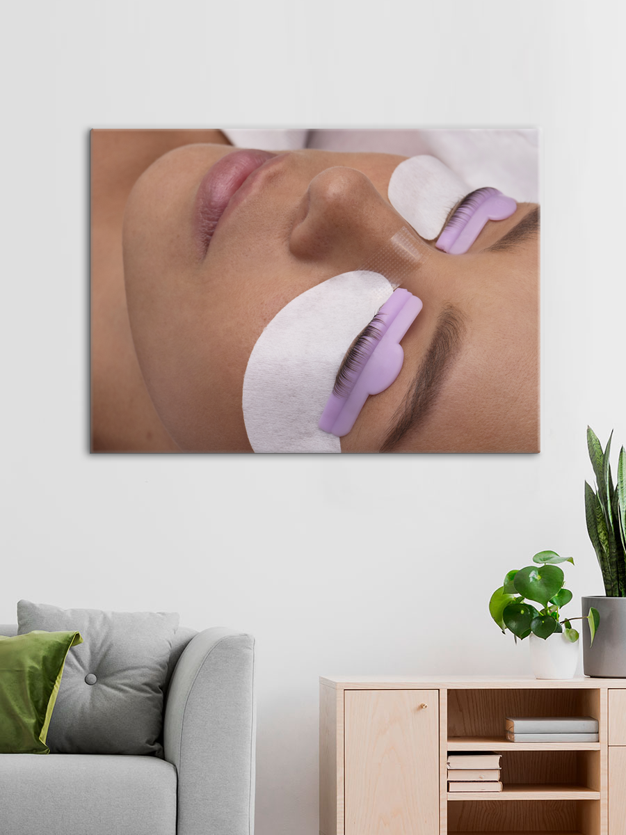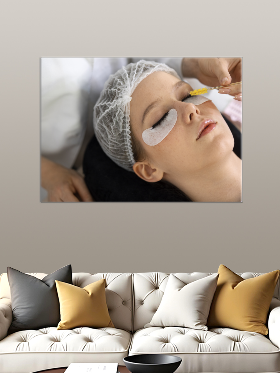 Описание: Картина 50 на 70 "Идеальный Взгляд: Наращивание Ресниц". **Описание и Уникальность:** Эта картина запечатлела момент преображения и ухода за собой: крупный план лица женщины, лежащей на процедуре наращивания ресниц. Основное внимание сосредоточено на глазах, обрамленных длинными, густыми и идеально изогнутыми искусственными ресницами, и закрытых специальными белыми патчами. Уникальность композиции заключается в контрасте между нежной белизной полотенца и патчей, и насыщенной чернотой роскошных ресниц, подчеркивающих красоту и тщательность процесса. Светлые бежевые и персиковые тона кожи создают ощущение тепла и расслабления, а легкий блеск на губах добавляет финальный штрих женственности. **Эмоции и Впечатления:** Картина излучает спокойствие, утонченность и заботу о себе. Она вызывает чувство релаксации, ассоциирующееся с салоном красоты или спа-процедурами. Зритель, глядя на этот образ, ощущает эстетическое удовольствие от совершенства работы мастера и предвкушение мгновенного, улучшенного образа. Это идеальный визуальный якорь для тех, кто ценит красоту, профессионализм и внимание к деталям. **Рекомендации по Интерьеру:** Данное полотно идеально впишется в интерьер салона красоты, особенно если он специализируется на лашмейкинге, косметологии или бьюти-услугах. Картина станет стильным и профессиональным акцентом в приемной зоне или кабинете мастера. Также она прекрасно дополнит современный домашний интерьер в стиле минимализм, сканди или гламур, особенно в женской спальне, гардеробной или ванной комнате, подчеркивая любовь хозяйки к уходу за собой и стилю. Светлая палитра (белый, бежевый) позволяет легко интегрировать картину в уже существующую цветовую схему.