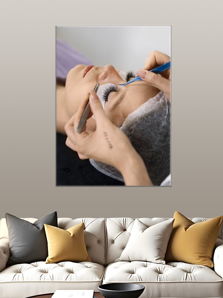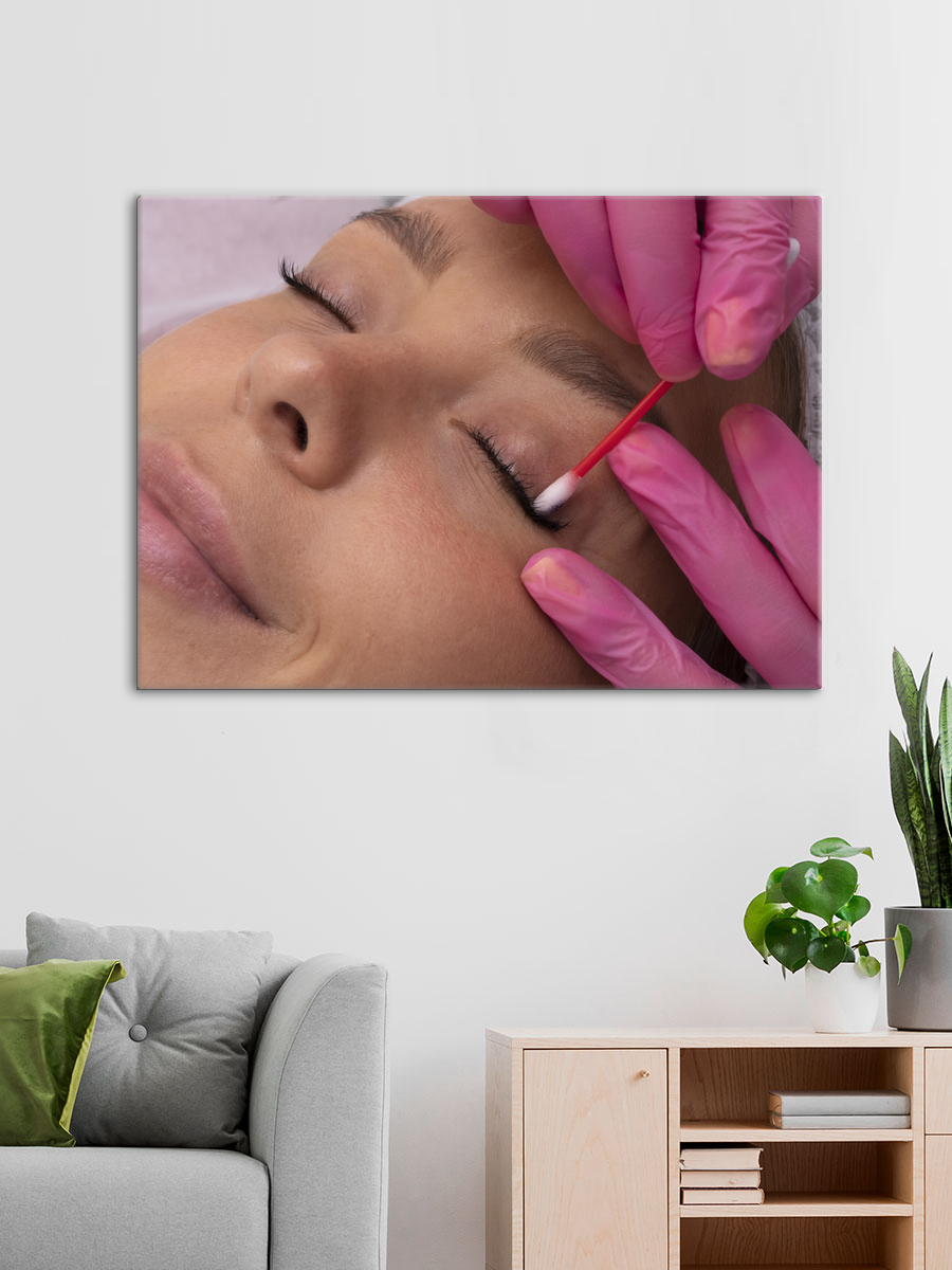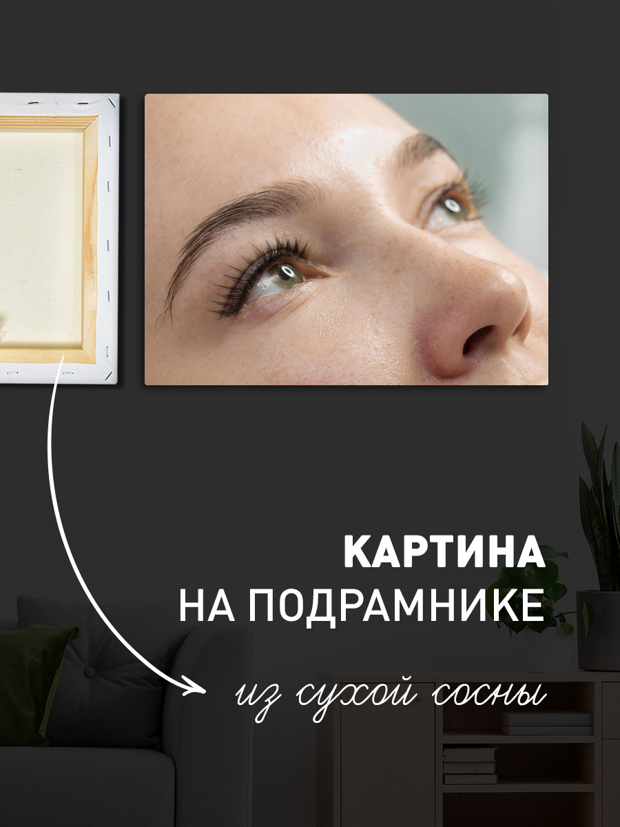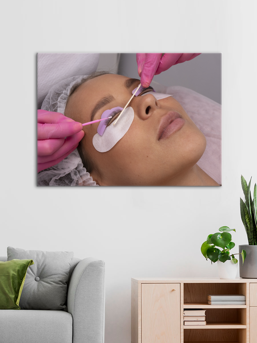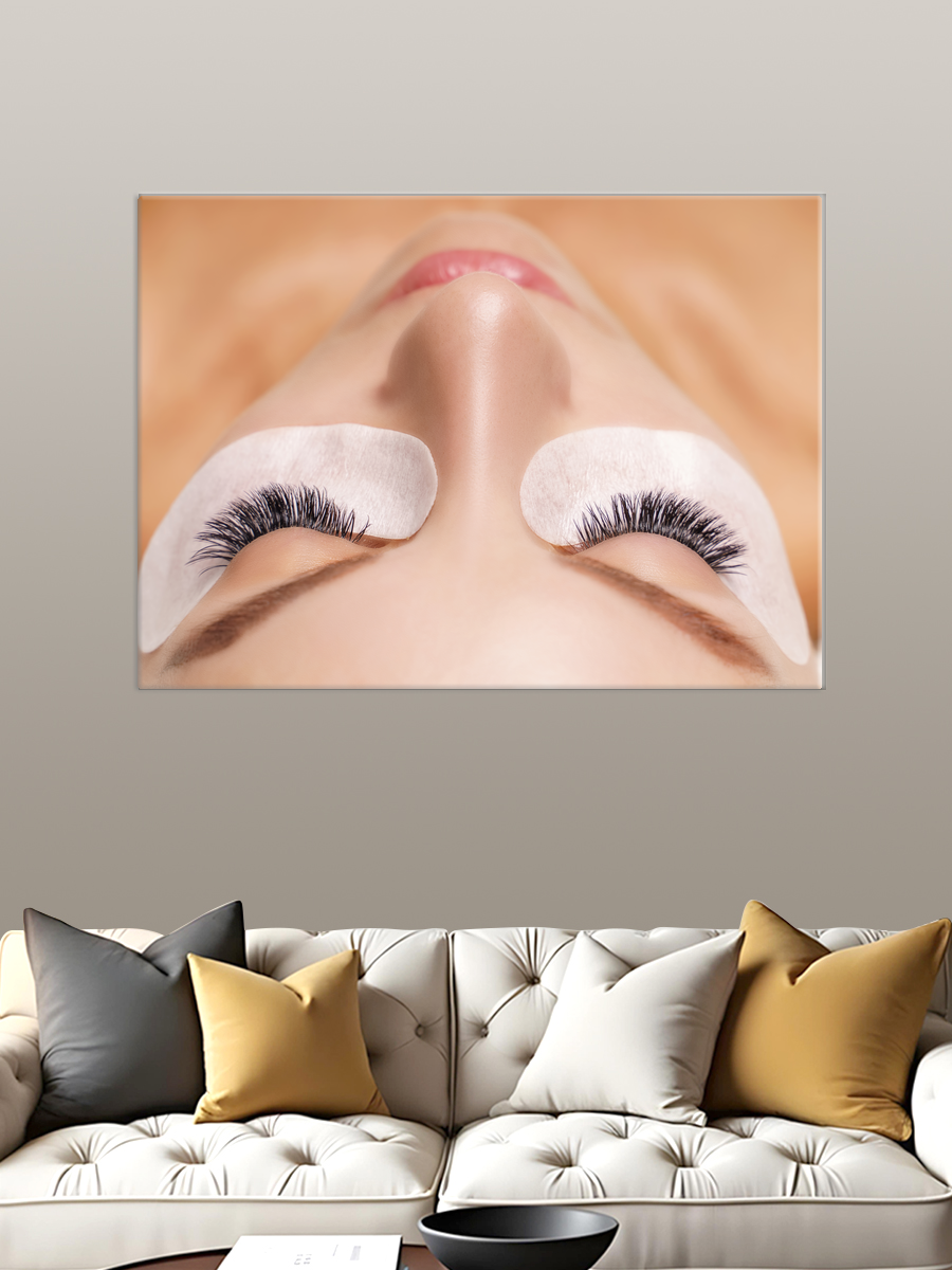 Описание: Картина 50 на 70 "Идеальный Взгляд: Наращивание Ресниц". **Описание и Уникальность:** Эта картина запечатлела момент преображения и ухода за собой: крупный план лица женщины, лежащей на процедуре наращивания ресниц. Основное внимание сосредоточено на глазах, обрамленных длинными, густыми и идеально изогнутыми искусственными ресницами, и закрытых специальными белыми патчами. Уникальность композиции заключается в контрасте между нежной белизной полотенца и патчей, и насыщенной чернотой роскошных ресниц, подчеркивающих красоту и тщательность процесса. Светлые бежевые и персиковые тона кожи создают ощущение тепла и расслабления, а легкий блеск на губах добавляет финальный штрих женственности. **Эмоции и Впечатления:** Картина излучает спокойствие, утонченность и заботу о себе. Она вызывает чувство релаксации, ассоциирующееся с салоном красоты или спа-процедурами. Зритель, глядя на этот образ, ощущает эстетическое удовольствие от совершенства работы мастера и предвкушение мгновенного, улучшенного образа. Это идеальный визуальный якорь для тех, кто ценит красоту, профессионализм и внимание к деталям. **Рекомендации по Интерьеру:** Данное полотно идеально впишется в интерьер салона красоты, особенно если он специализируется на лашмейкинге, косметологии или бьюти-услугах. Картина станет стильным и профессиональным акцентом в приемной зоне или кабинете мастера. Также она прекрасно дополнит современный домашний интерьер в стиле минимализм, сканди или гламур, особенно в женской спальне, гардеробной или ванной комнате, подчеркивая любовь хозяйки к уходу за собой и стилю. Светлая палитра (белый, бежевый) позволяет легко интегрировать картину в уже существующую цветовую схему.