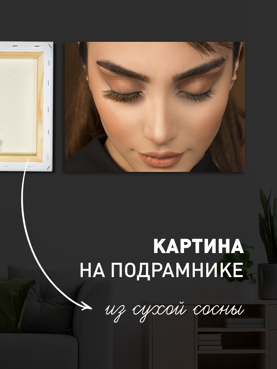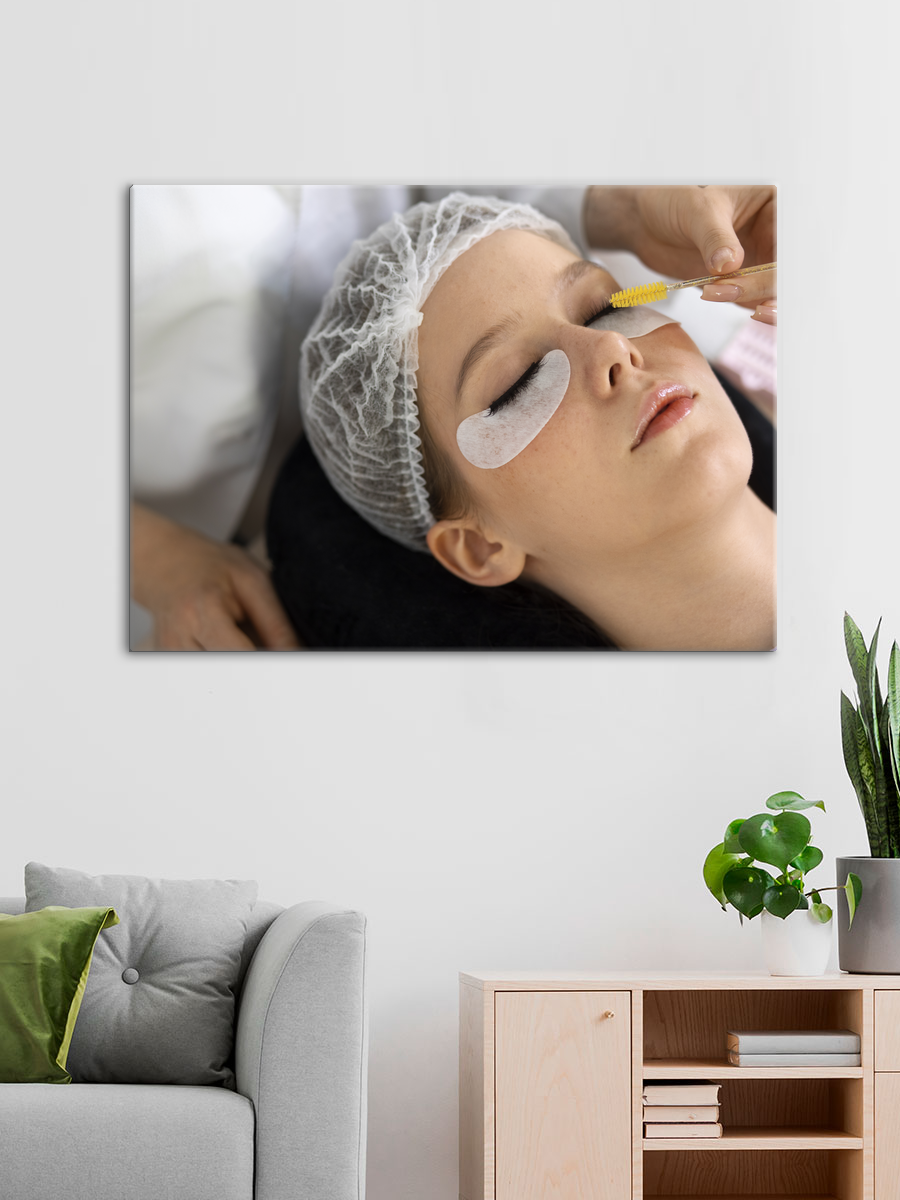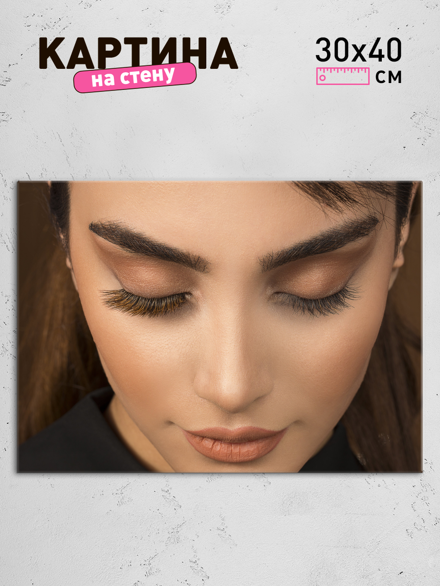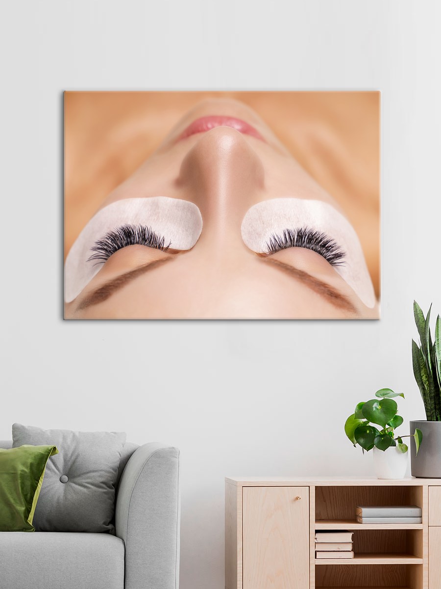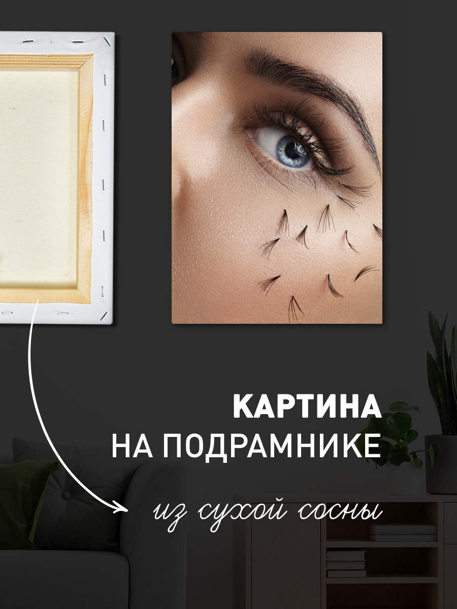 Описание: Картина 50 на 70 "Идеальный Взгляд: Наращивание Ресниц". **Описание и Уникальность:** Эта картина запечатлела момент преображения и ухода за собой: крупный план лица женщины, лежащей на процедуре наращивания ресниц. Основное внимание сосредоточено на глазах, обрамленных длинными, густыми и идеально изогнутыми искусственными ресницами, и закрытых специальными белыми патчами. Уникальность композиции заключается в контрасте между нежной белизной полотенца и патчей, и насыщенной чернотой роскошных ресниц, подчеркивающих красоту и тщательность процесса. Светлые бежевые и персиковые тона кожи создают ощущение тепла и расслабления, а легкий блеск на губах добавляет финальный штрих женственности. **Эмоции и Впечатления:** Картина излучает спокойствие, утонченность и заботу о себе. Она вызывает чувство релаксации, ассоциирующееся с салоном красоты или спа-процедурами. Зритель, глядя на этот образ, ощущает эстетическое удовольствие от совершенства работы мастера и предвкушение мгновенного, улучшенного образа. Это идеальный визуальный якорь для тех, кто ценит красоту, профессионализм и внимание к деталям. **Рекомендации по Интерьеру:** Данное полотно идеально впишется в интерьер салона красоты, особенно если он специализируется на лашмейкинге, косметологии или бьюти-услугах. Картина станет стильным и профессиональным акцентом в приемной зоне или кабинете мастера. Также она прекрасно дополнит современный домашний интерьер в стиле минимализм, сканди или гламур, особенно в женской спальне, гардеробной или ванной комнате, подчеркивая любовь хозяйки к уходу за собой и стилю. Светлая палитра (белый, бежевый) позволяет легко интегрировать картину в уже существующую цветовую схему.