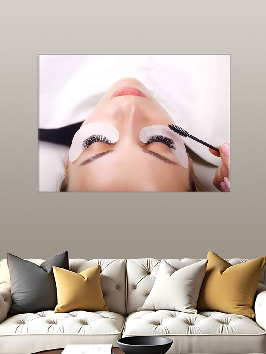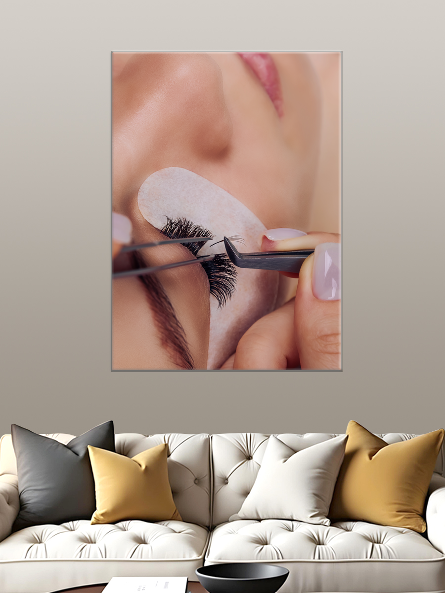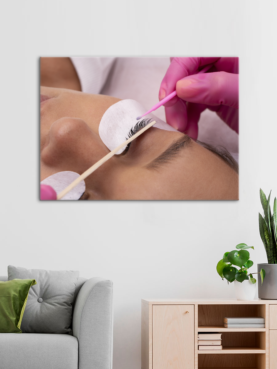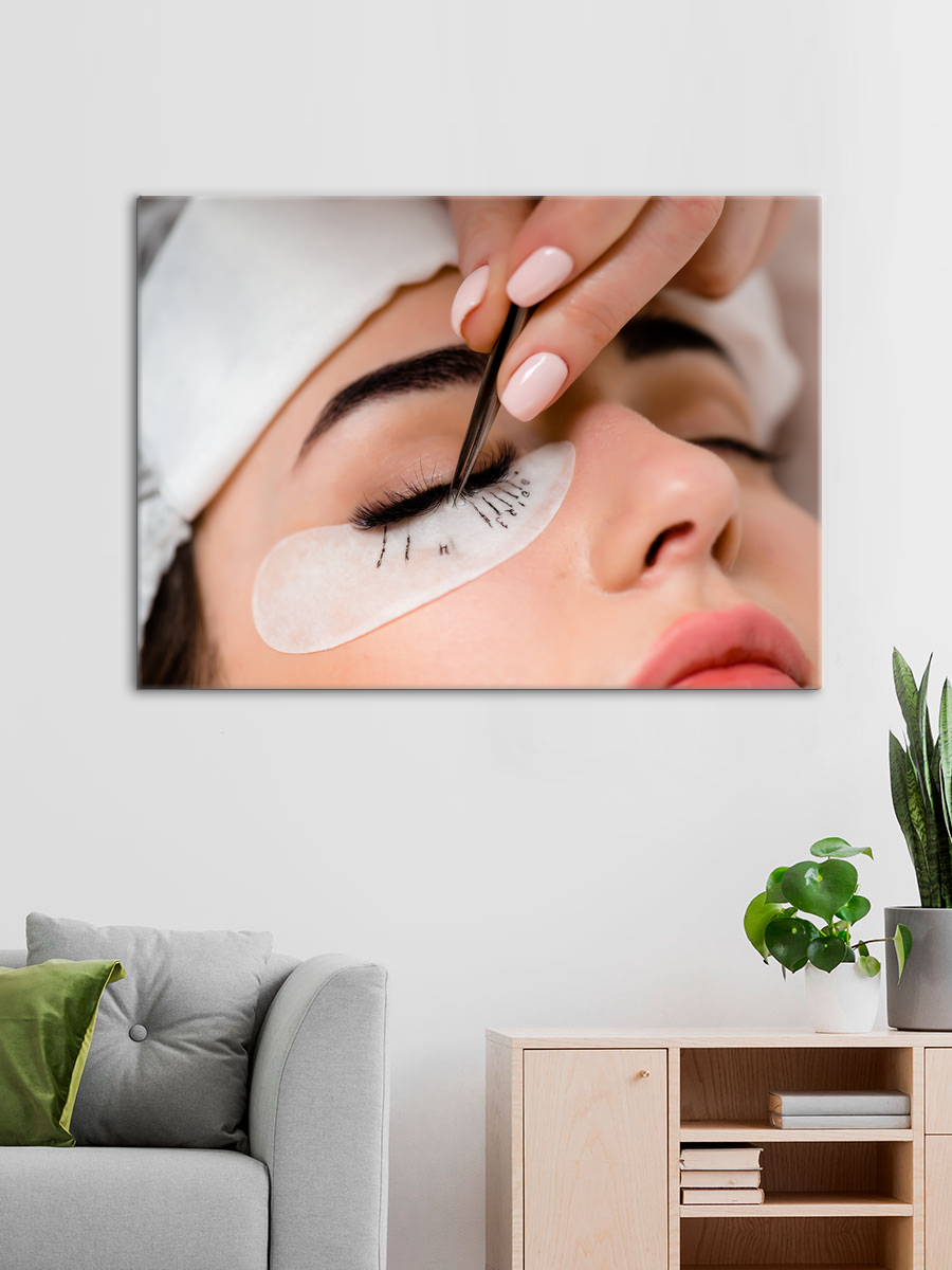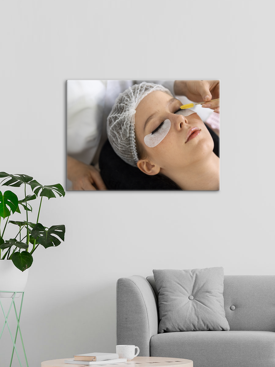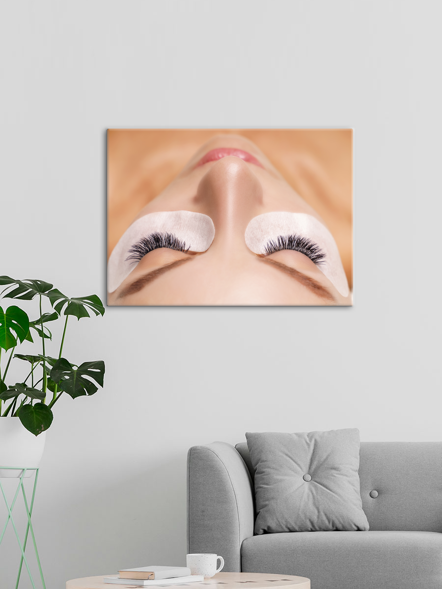 Описание: Картина 50 на 70 "Идеальный Взгляд: Наращивание Ресниц". **Описание и Уникальность:** Эта картина запечатлела момент преображения и ухода за собой: крупный план лица женщины, лежащей на процедуре наращивания ресниц. Основное внимание сосредоточено на глазах, обрамленных длинными, густыми и идеально изогнутыми искусственными ресницами, и закрытых специальными белыми патчами. Уникальность композиции заключается в контрасте между нежной белизной полотенца и патчей, и насыщенной чернотой роскошных ресниц, подчеркивающих красоту и тщательность процесса. Светлые бежевые и персиковые тона кожи создают ощущение тепла и расслабления, а легкий блеск на губах добавляет финальный штрих женственности. **Эмоции и Впечатления:** Картина излучает спокойствие, утонченность и заботу о себе. Она вызывает чувство релаксации, ассоциирующееся с салоном красоты или спа-процедурами. Зритель, глядя на этот образ, ощущает эстетическое удовольствие от совершенства работы мастера и предвкушение мгновенного, улучшенного образа. Это идеальный визуальный якорь для тех, кто ценит красоту, профессионализм и внимание к деталям. **Рекомендации по Интерьеру:** Данное полотно идеально впишется в интерьер салона красоты, особенно если он специализируется на лашмейкинге, косметологии или бьюти-услугах. Картина станет стильным и профессиональным акцентом в приемной зоне или кабинете мастера. Также она прекрасно дополнит современный домашний интерьер в стиле минимализм, сканди или гламур, особенно в женской спальне, гардеробной или ванной комнате, подчеркивая любовь хозяйки к уходу за собой и стилю. Светлая палитра (белый, бежевый) позволяет легко интегрировать картину в уже существующую цветовую схему.