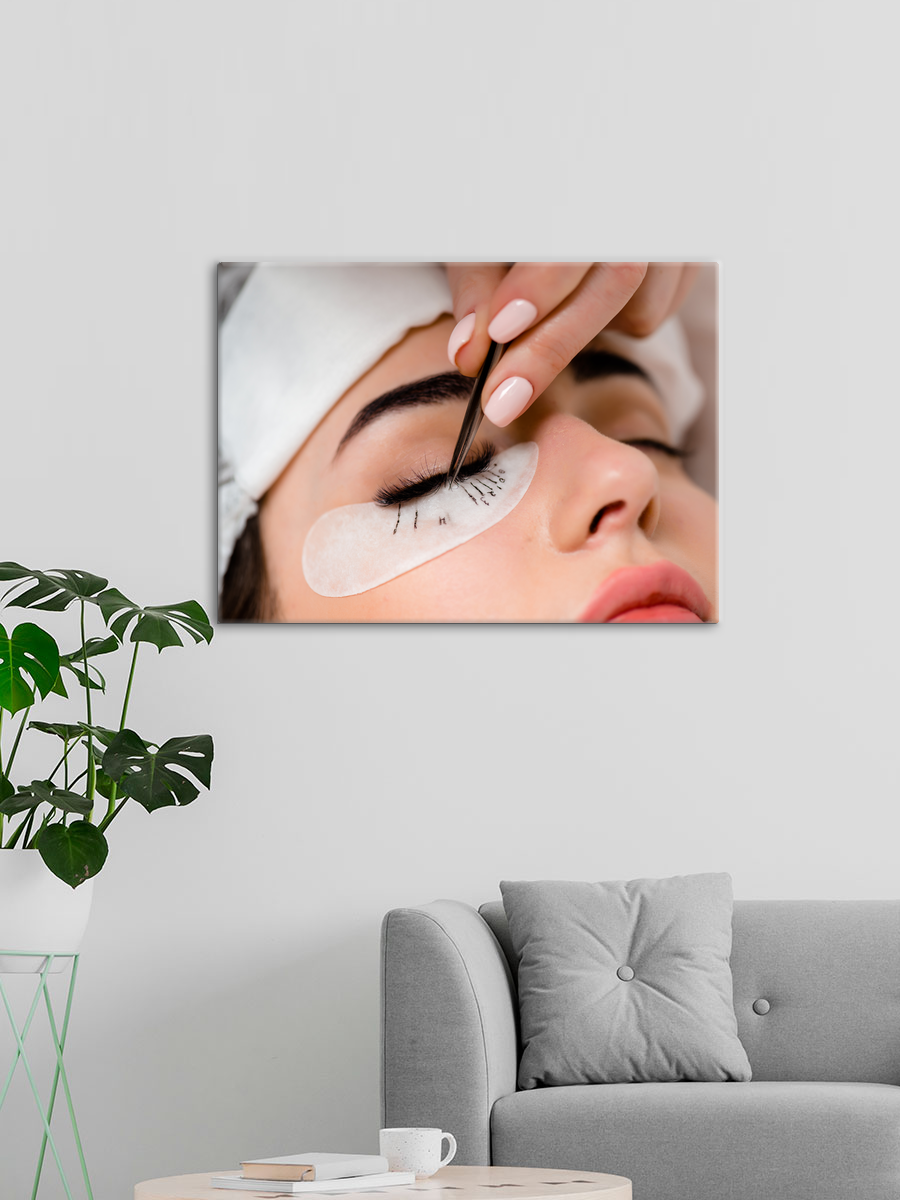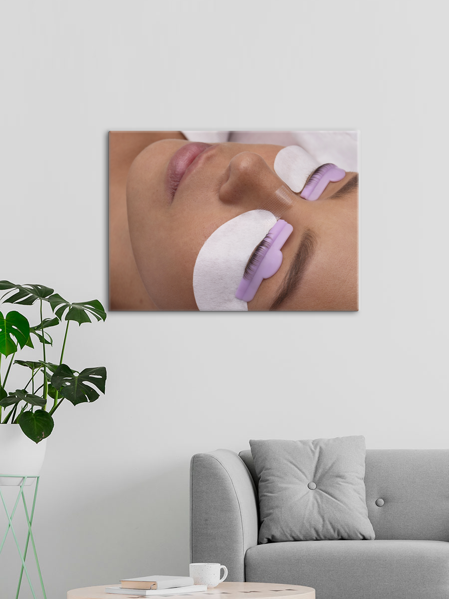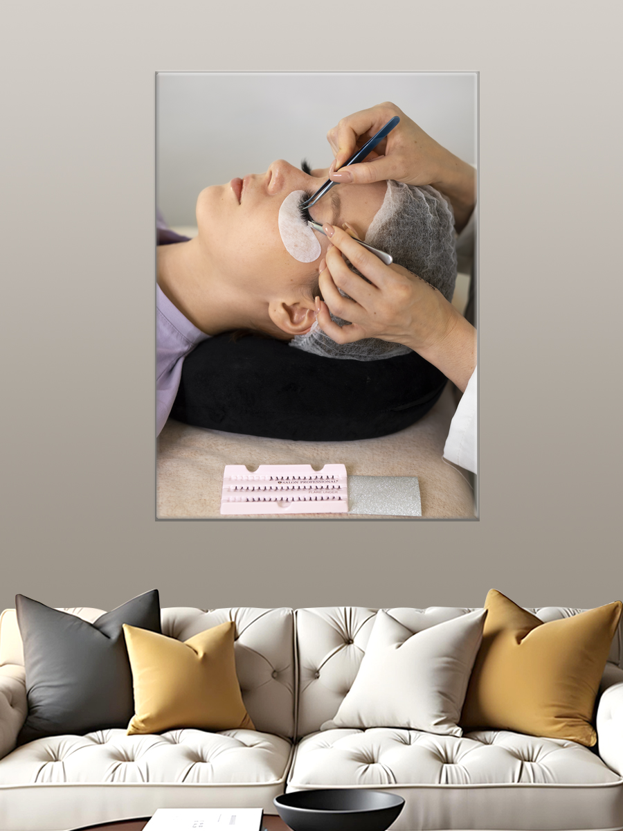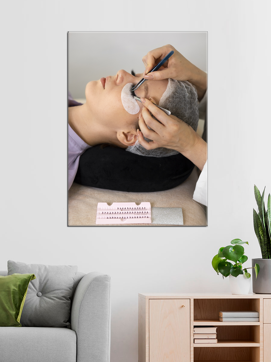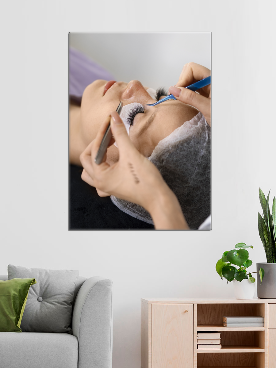 Описание: Картина 50 на 70 "Идеальный Взгляд: Наращивание Ресниц". **Описание и Уникальность:** Эта картина запечатлела момент преображения и ухода за собой: крупный план лица женщины, лежащей на процедуре наращивания ресниц. Основное внимание сосредоточено на глазах, обрамленных длинными, густыми и идеально изогнутыми искусственными ресницами, и закрытых специальными белыми патчами. Уникальность композиции заключается в контрасте между нежной белизной полотенца и патчей, и насыщенной чернотой роскошных ресниц, подчеркивающих красоту и тщательность процесса. Светлые бежевые и персиковые тона кожи создают ощущение тепла и расслабления, а легкий блеск на губах добавляет финальный штрих женственности. **Эмоции и Впечатления:** Картина излучает спокойствие, утонченность и заботу о себе. Она вызывает чувство релаксации, ассоциирующееся с салоном красоты или спа-процедурами. Зритель, глядя на этот образ, ощущает эстетическое удовольствие от совершенства работы мастера и предвкушение мгновенного, улучшенного образа. Это идеальный визуальный якорь для тех, кто ценит красоту, профессионализм и внимание к деталям. **Рекомендации по Интерьеру:** Данное полотно идеально впишется в интерьер салона красоты, особенно если он специализируется на лашмейкинге, косметологии или бьюти-услугах. Картина станет стильным и профессиональным акцентом в приемной зоне или кабинете мастера. Также она прекрасно дополнит современный домашний интерьер в стиле минимализм, сканди или гламур, особенно в женской спальне, гардеробной или ванной комнате, подчеркивая любовь хозяйки к уходу за собой и стилю. Светлая палитра (белый, бежевый) позволяет легко интегрировать картину в уже существующую цветовую схему.