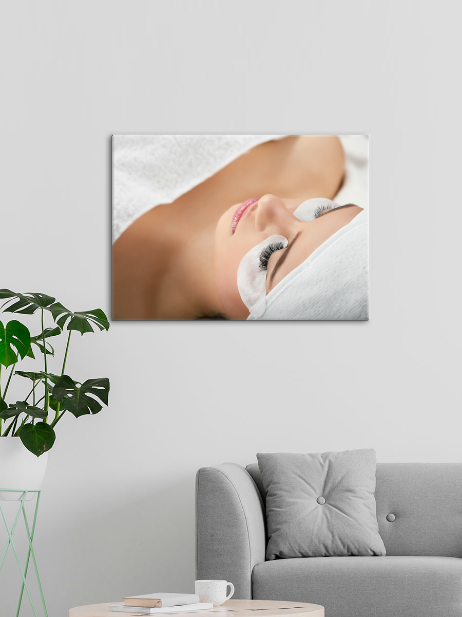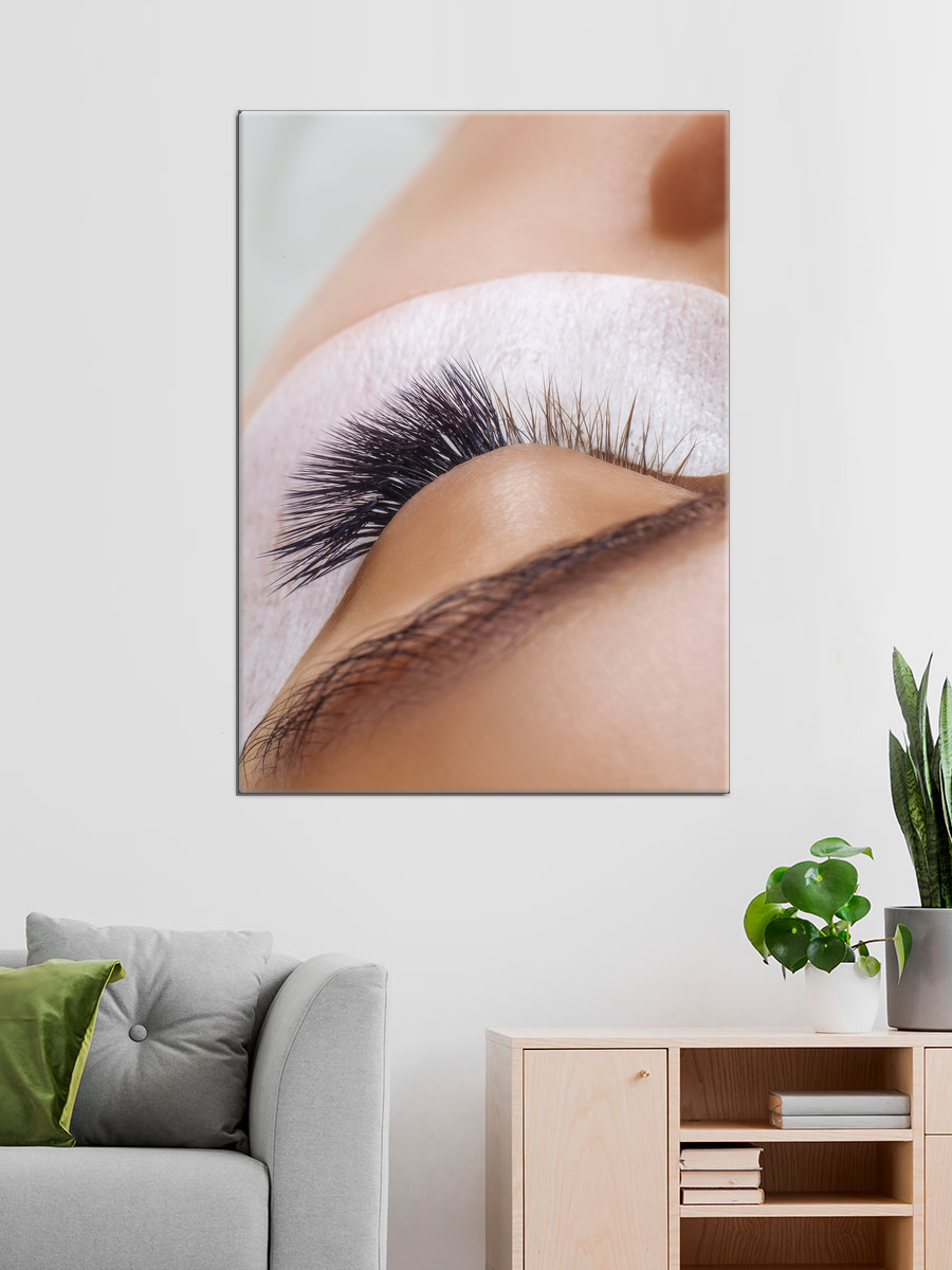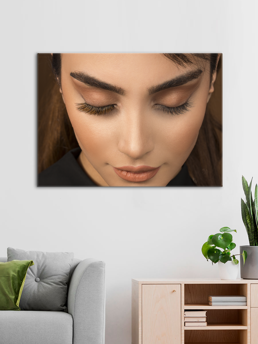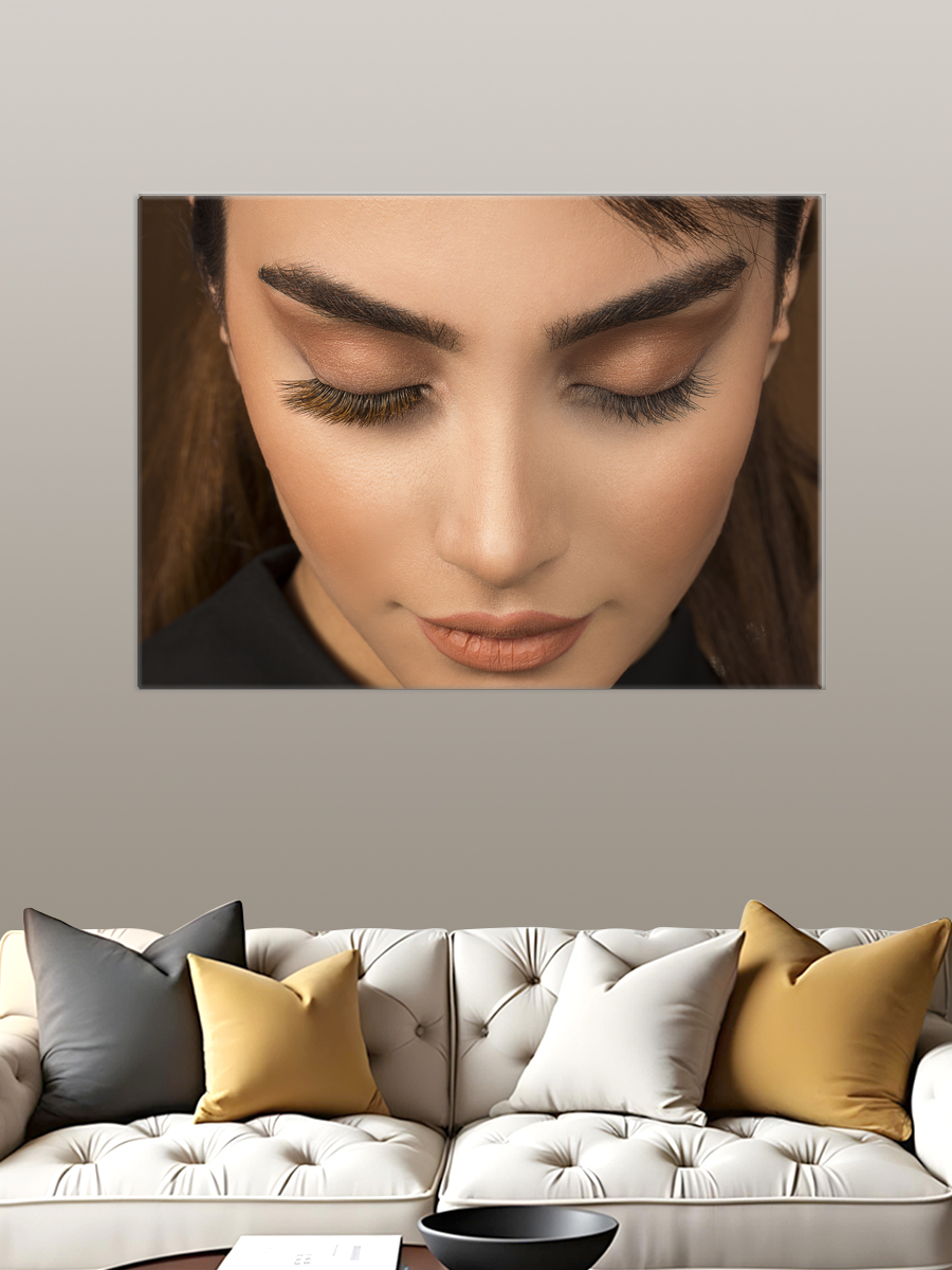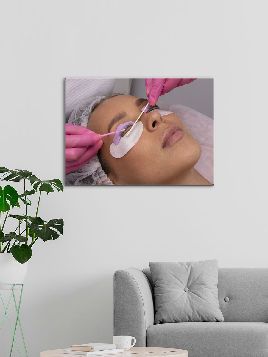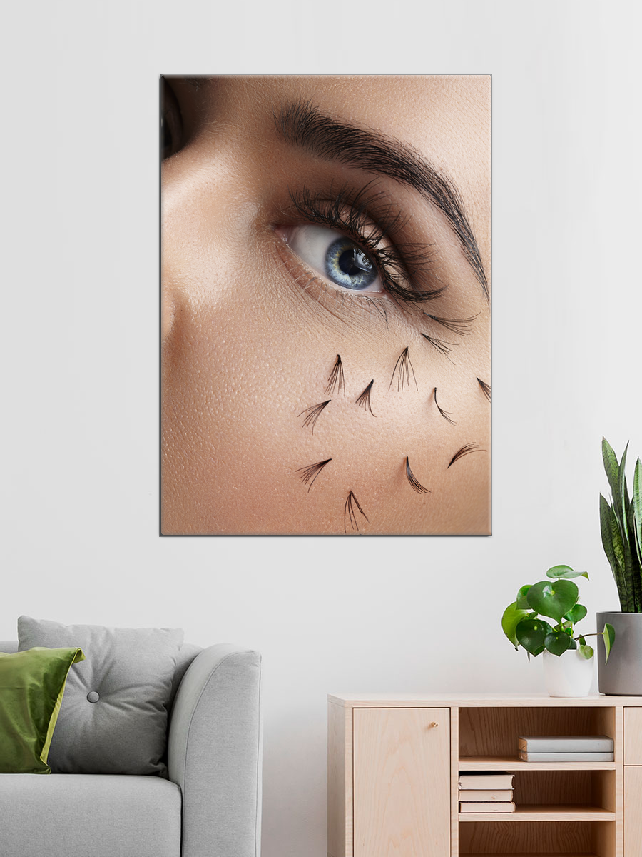 Описание: Картина 50 на 70 "Идеальный Взгляд: Наращивание Ресниц". **Описание и Уникальность:** Эта картина запечатлела момент преображения и ухода за собой: крупный план лица женщины, лежащей на процедуре наращивания ресниц. Основное внимание сосредоточено на глазах, обрамленных длинными, густыми и идеально изогнутыми искусственными ресницами, и закрытых специальными белыми патчами. Уникальность композиции заключается в контрасте между нежной белизной полотенца и патчей, и насыщенной чернотой роскошных ресниц, подчеркивающих красоту и тщательность процесса. Светлые бежевые и персиковые тона кожи создают ощущение тепла и расслабления, а легкий блеск на губах добавляет финальный штрих женственности. **Эмоции и Впечатления:** Картина излучает спокойствие, утонченность и заботу о себе. Она вызывает чувство релаксации, ассоциирующееся с салоном красоты или спа-процедурами. Зритель, глядя на этот образ, ощущает эстетическое удовольствие от совершенства работы мастера и предвкушение мгновенного, улучшенного образа. Это идеальный визуальный якорь для тех, кто ценит красоту, профессионализм и внимание к деталям. **Рекомендации по Интерьеру:** Данное полотно идеально впишется в интерьер салона красоты, особенно если он специализируется на лашмейкинге, косметологии или бьюти-услугах. Картина станет стильным и профессиональным акцентом в приемной зоне или кабинете мастера. Также она прекрасно дополнит современный домашний интерьер в стиле минимализм, сканди или гламур, особенно в женской спальне, гардеробной или ванной комнате, подчеркивая любовь хозяйки к уходу за собой и стилю. Светлая палитра (белый, бежевый) позволяет легко интегрировать картину в уже существующую цветовую схему.