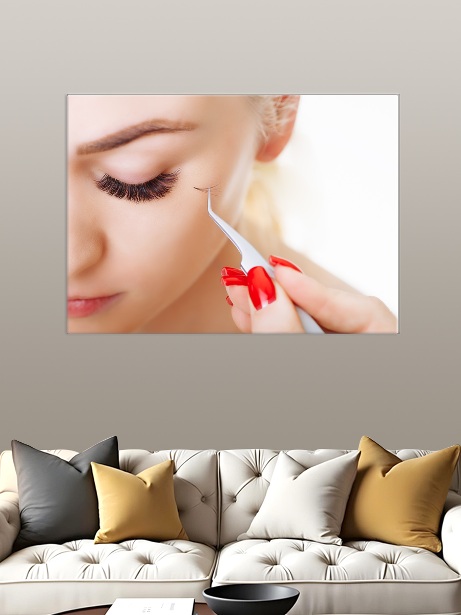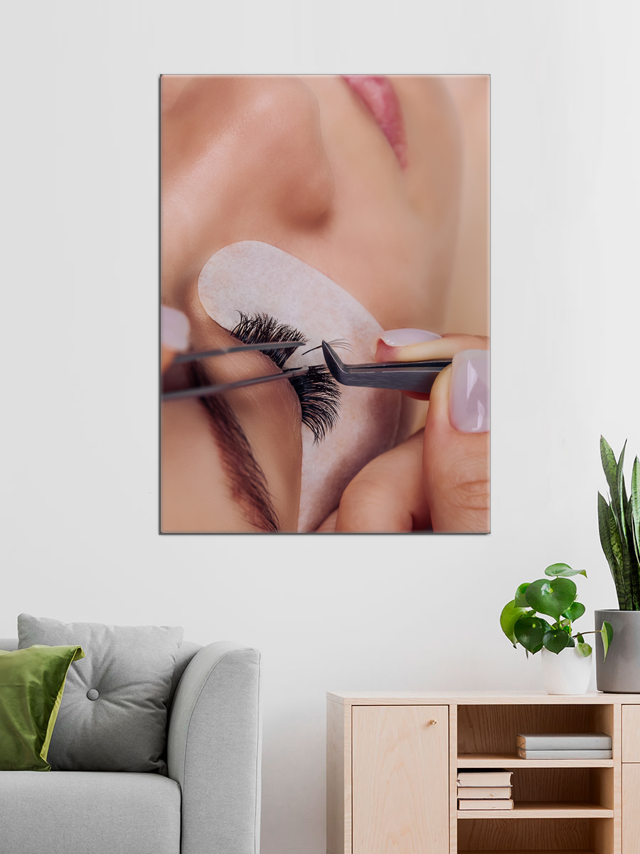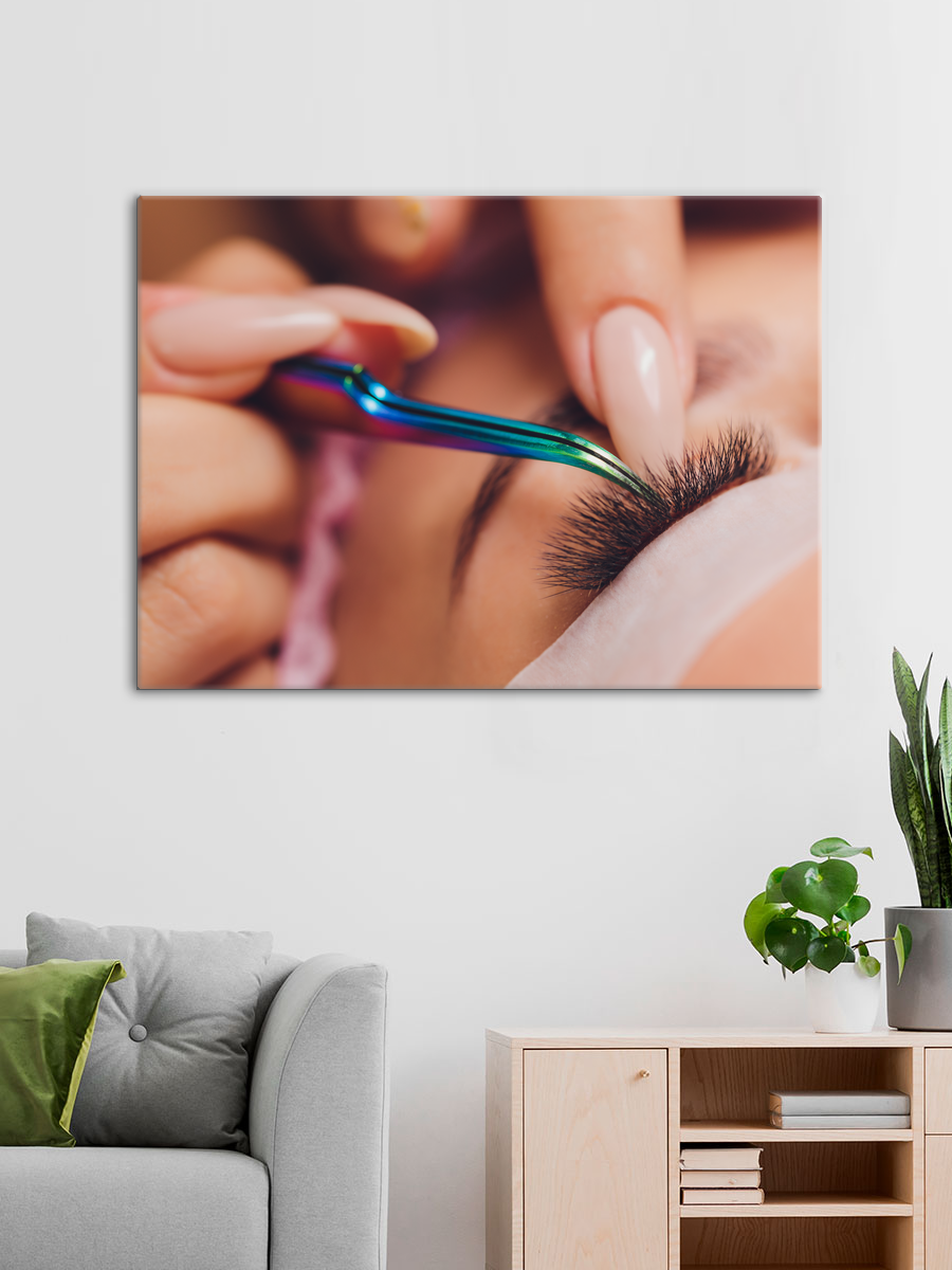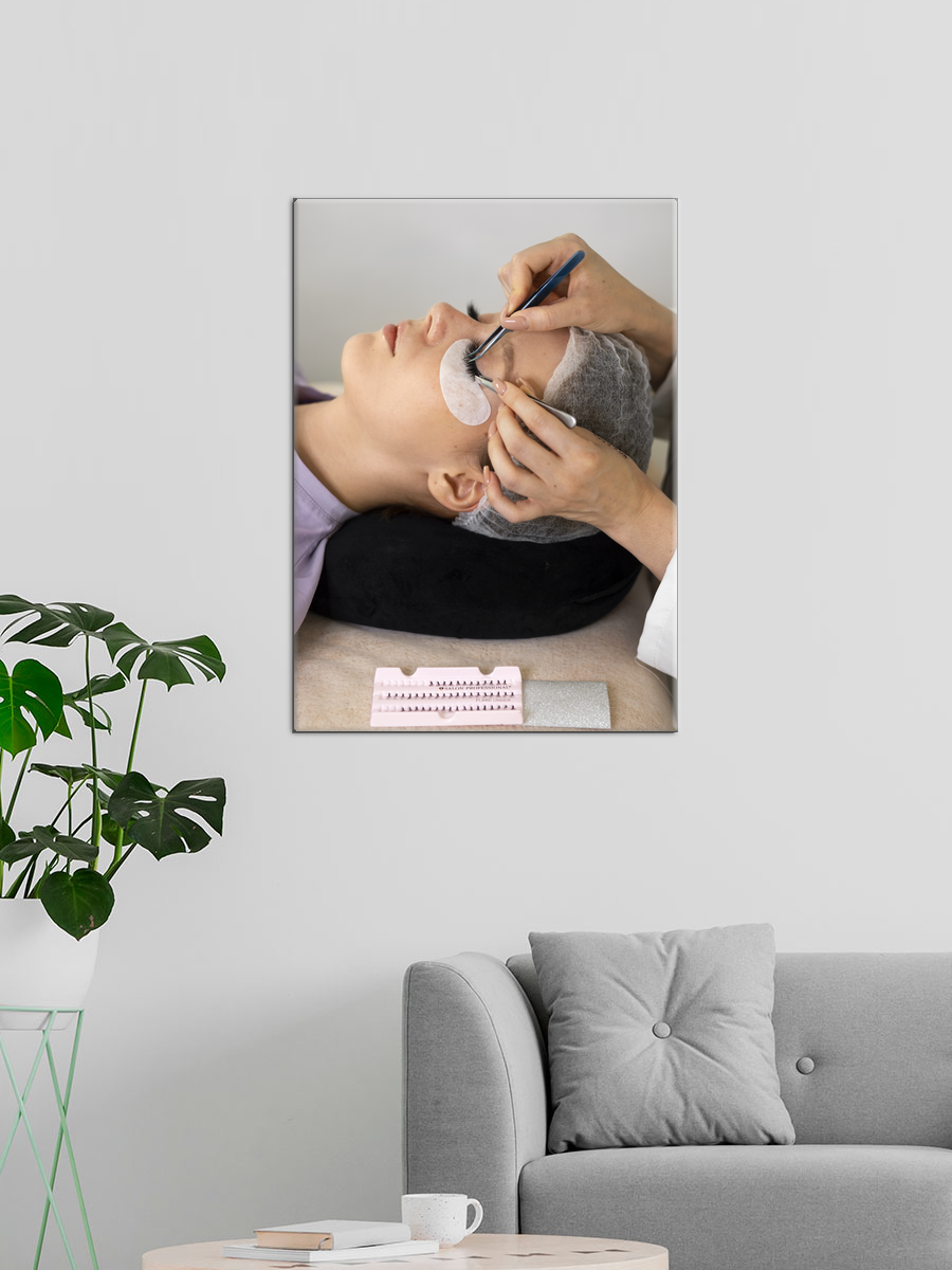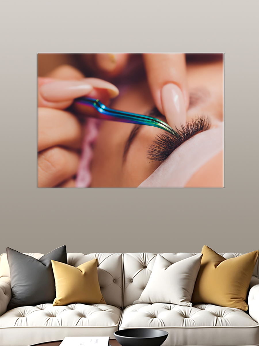 Описание: Картина 50 на 70 "Идеальный Взгляд: Наращивание Ресниц". **Описание и Уникальность:** Эта картина запечатлела момент преображения и ухода за собой: крупный план лица женщины, лежащей на процедуре наращивания ресниц. Основное внимание сосредоточено на глазах, обрамленных длинными, густыми и идеально изогнутыми искусственными ресницами, и закрытых специальными белыми патчами. Уникальность композиции заключается в контрасте между нежной белизной полотенца и патчей, и насыщенной чернотой роскошных ресниц, подчеркивающих красоту и тщательность процесса. Светлые бежевые и персиковые тона кожи создают ощущение тепла и расслабления, а легкий блеск на губах добавляет финальный штрих женственности. **Эмоции и Впечатления:** Картина излучает спокойствие, утонченность и заботу о себе. Она вызывает чувство релаксации, ассоциирующееся с салоном красоты или спа-процедурами. Зритель, глядя на этот образ, ощущает эстетическое удовольствие от совершенства работы мастера и предвкушение мгновенного, улучшенного образа. Это идеальный визуальный якорь для тех, кто ценит красоту, профессионализм и внимание к деталям. **Рекомендации по Интерьеру:** Данное полотно идеально впишется в интерьер салона красоты, особенно если он специализируется на лашмейкинге, косметологии или бьюти-услугах. Картина станет стильным и профессиональным акцентом в приемной зоне или кабинете мастера. Также она прекрасно дополнит современный домашний интерьер в стиле минимализм, сканди или гламур, особенно в женской спальне, гардеробной или ванной комнате, подчеркивая любовь хозяйки к уходу за собой и стилю. Светлая палитра (белый, бежевый) позволяет легко интегрировать картину в уже существующую цветовую схему.