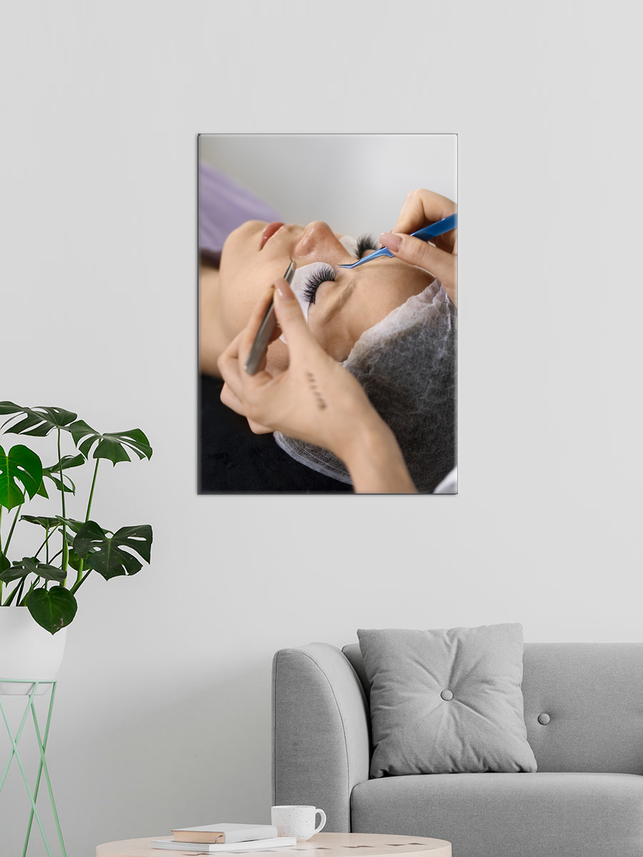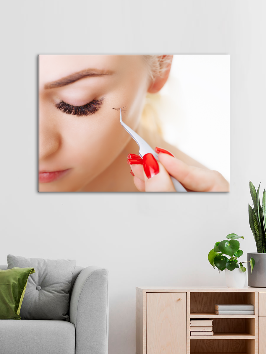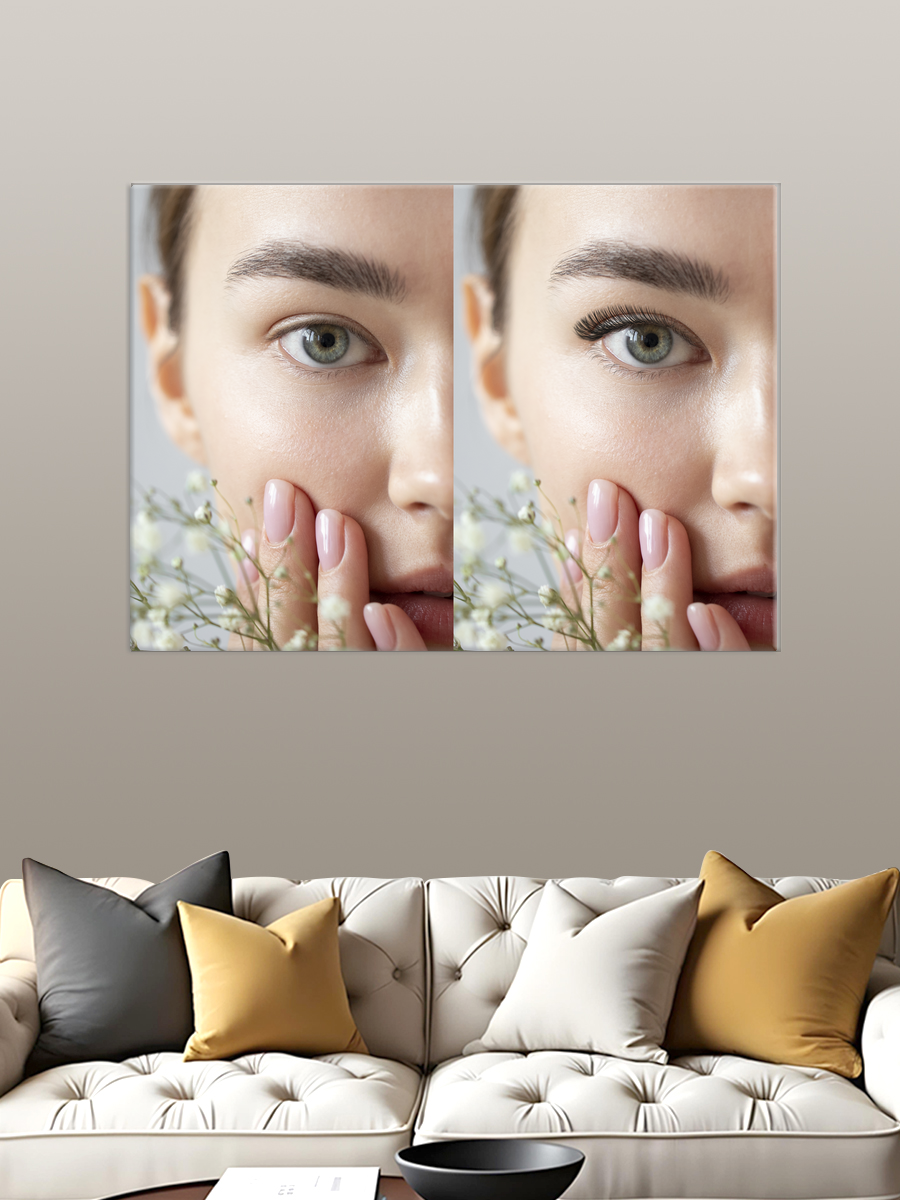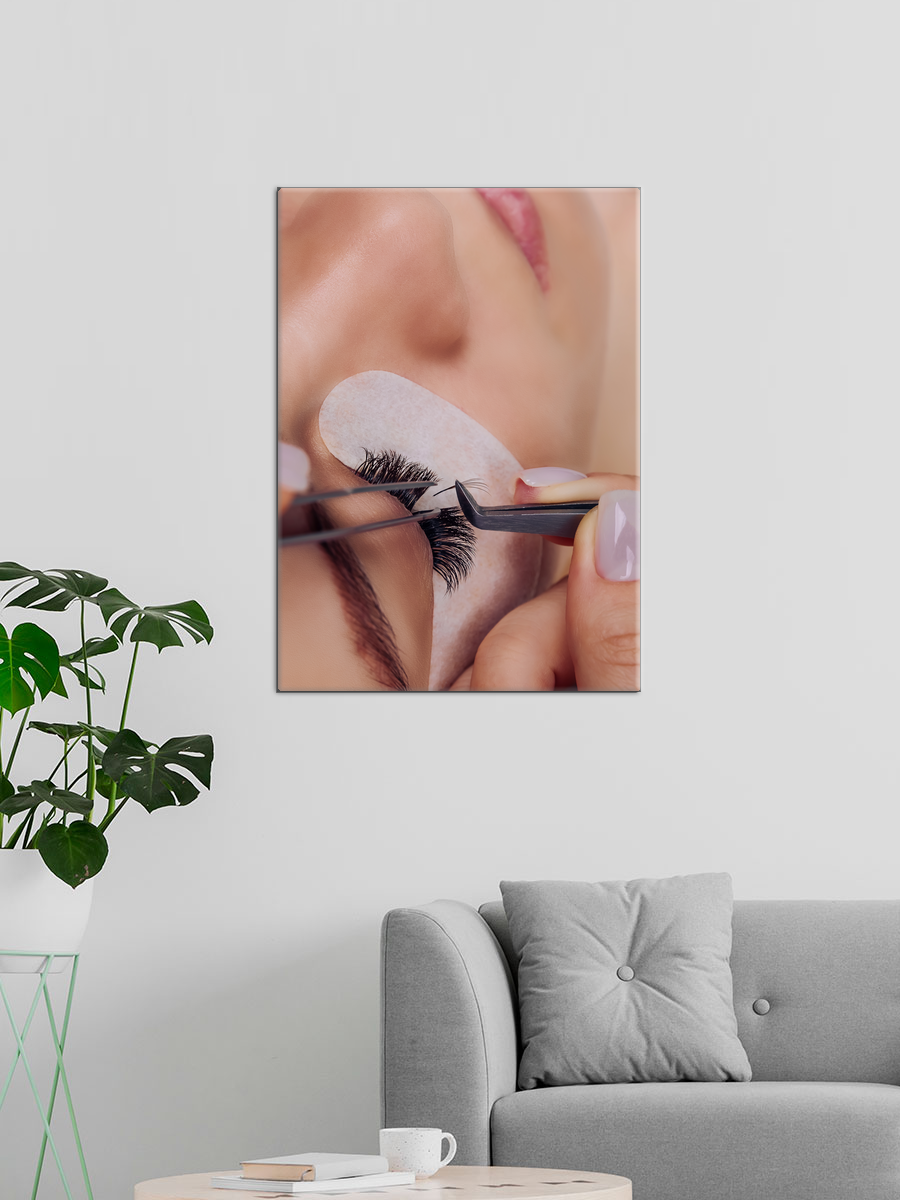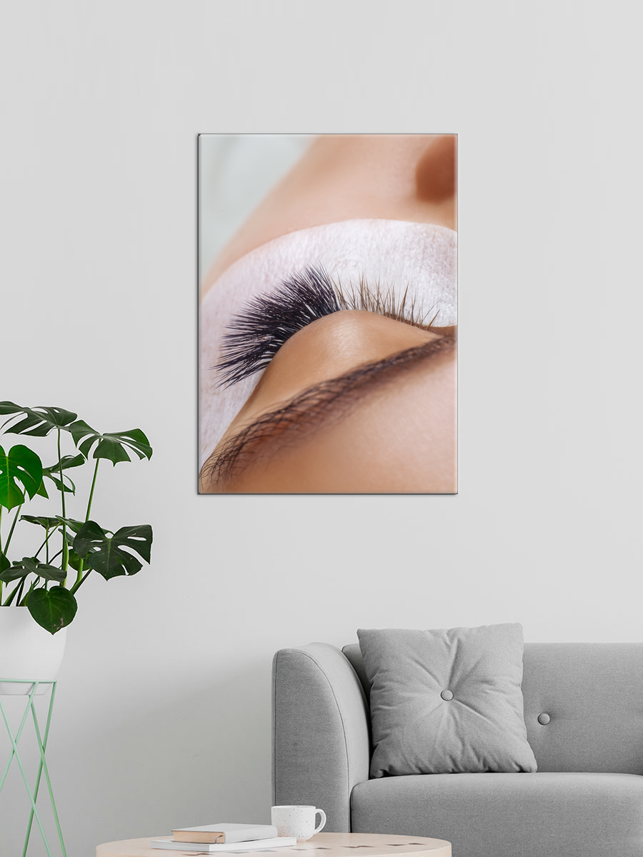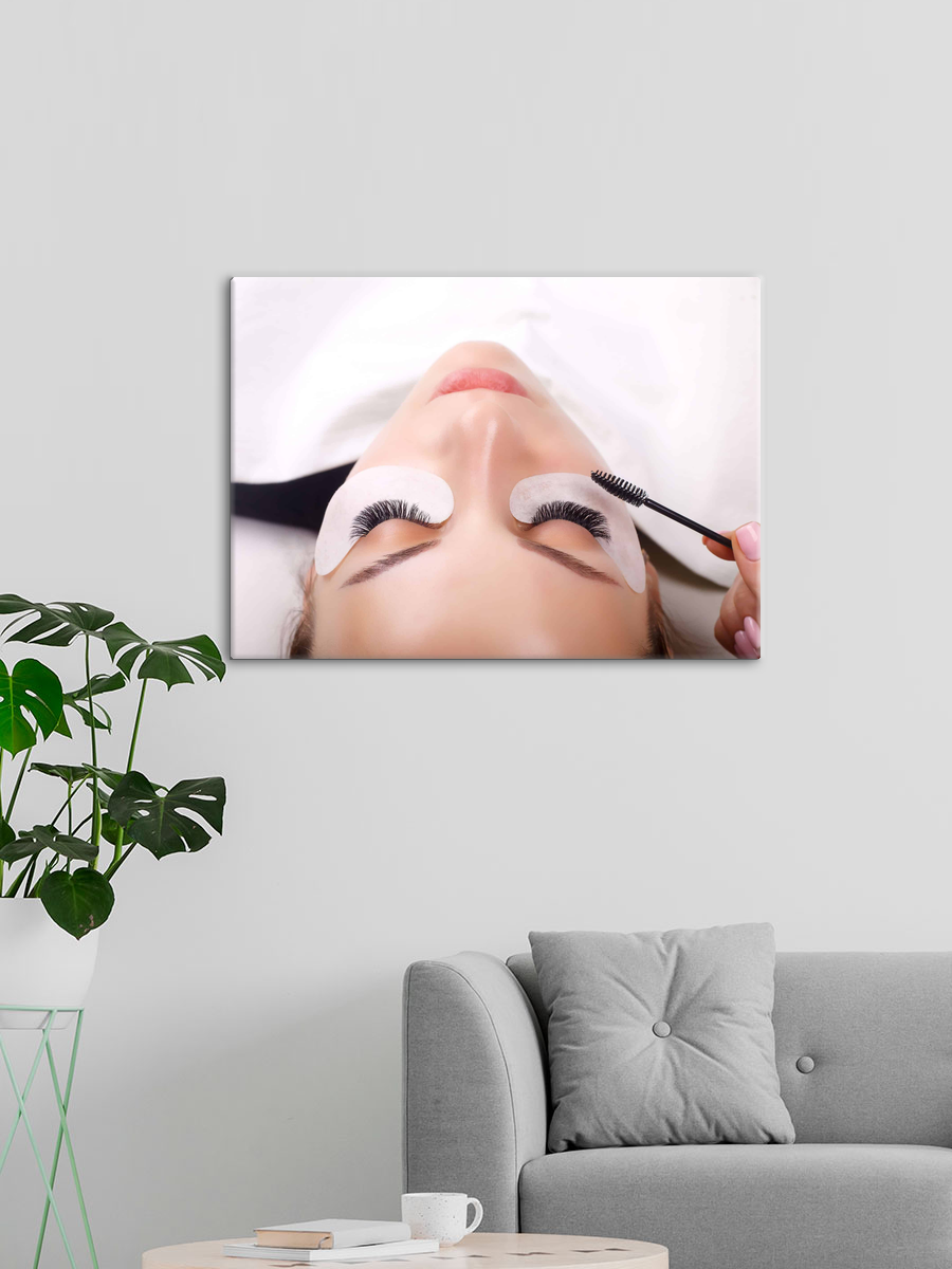 Описание: Картина 50 на 70 "Идеальный Взгляд: Наращивание Ресниц". **Описание и Уникальность:** Эта картина запечатлела момент преображения и ухода за собой: крупный план лица женщины, лежащей на процедуре наращивания ресниц. Основное внимание сосредоточено на глазах, обрамленных длинными, густыми и идеально изогнутыми искусственными ресницами, и закрытых специальными белыми патчами. Уникальность композиции заключается в контрасте между нежной белизной полотенца и патчей, и насыщенной чернотой роскошных ресниц, подчеркивающих красоту и тщательность процесса. Светлые бежевые и персиковые тона кожи создают ощущение тепла и расслабления, а легкий блеск на губах добавляет финальный штрих женственности. **Эмоции и Впечатления:** Картина излучает спокойствие, утонченность и заботу о себе. Она вызывает чувство релаксации, ассоциирующееся с салоном красоты или спа-процедурами. Зритель, глядя на этот образ, ощущает эстетическое удовольствие от совершенства работы мастера и предвкушение мгновенного, улучшенного образа. Это идеальный визуальный якорь для тех, кто ценит красоту, профессионализм и внимание к деталям. **Рекомендации по Интерьеру:** Данное полотно идеально впишется в интерьер салона красоты, особенно если он специализируется на лашмейкинге, косметологии или бьюти-услугах. Картина станет стильным и профессиональным акцентом в приемной зоне или кабинете мастера. Также она прекрасно дополнит современный домашний интерьер в стиле минимализм, сканди или гламур, особенно в женской спальне, гардеробной или ванной комнате, подчеркивая любовь хозяйки к уходу за собой и стилю. Светлая палитра (белый, бежевый) позволяет легко интегрировать картину в уже существующую цветовую схему.