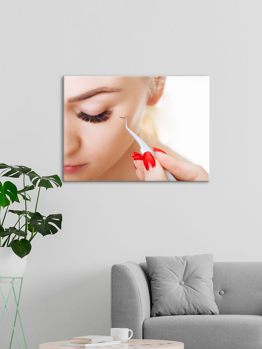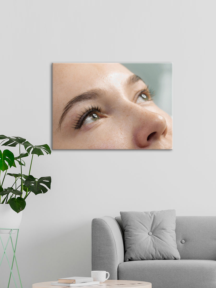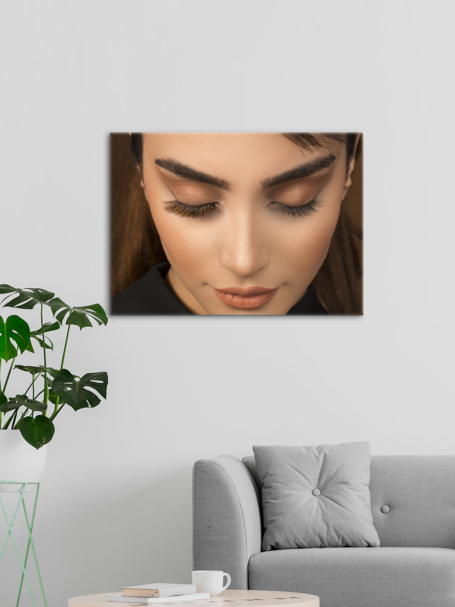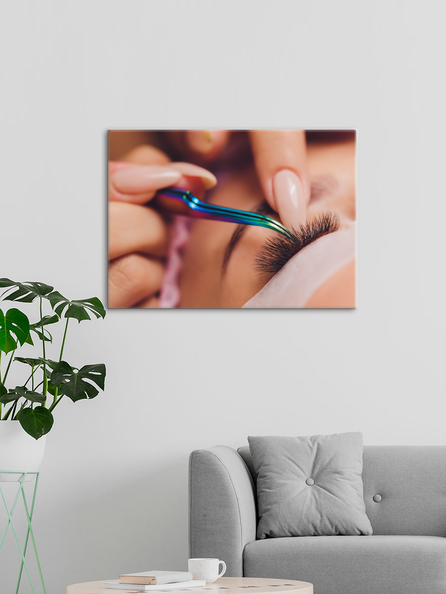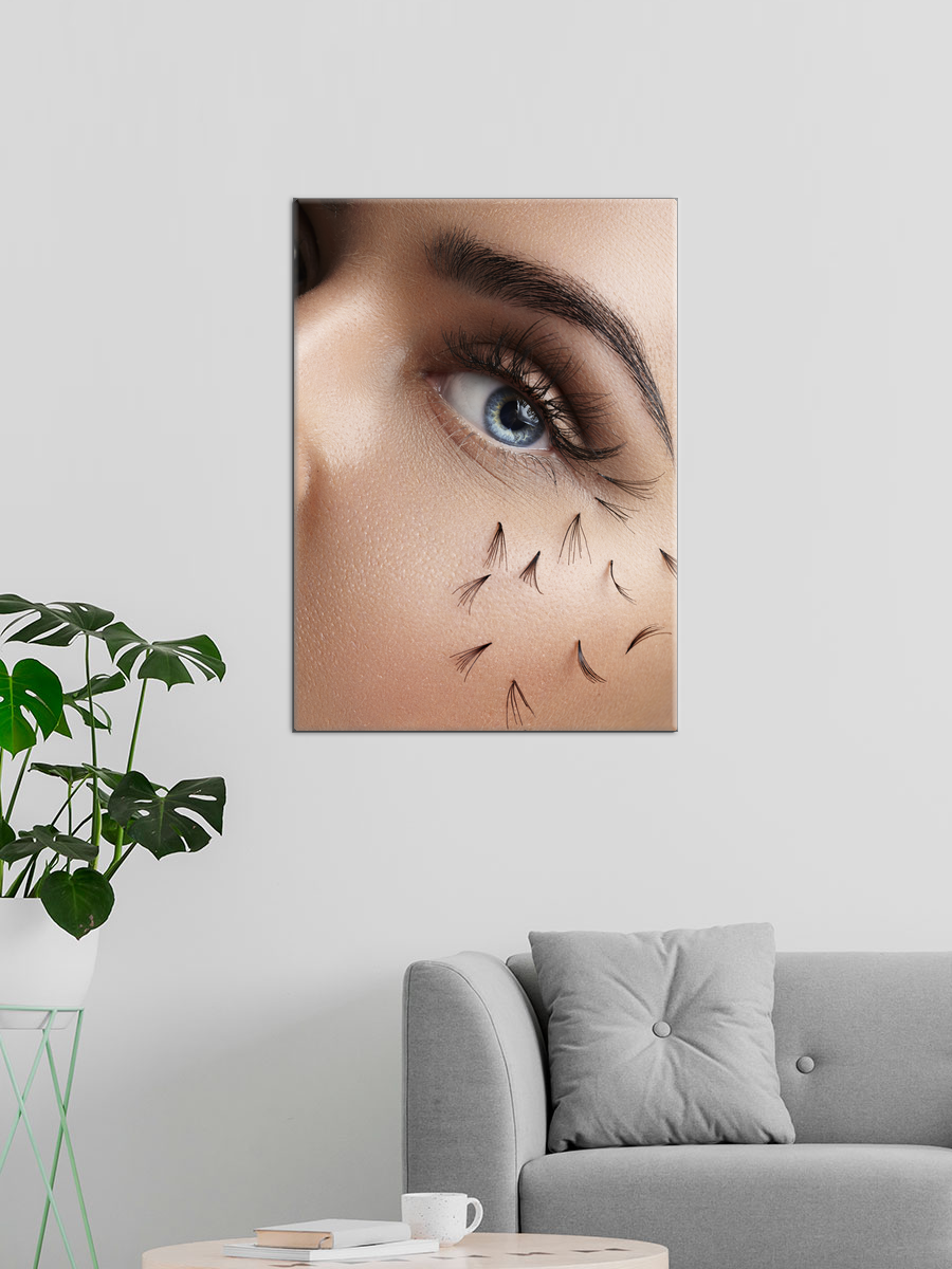 Описание: Картина 50 на 70 "Идеальный Взгляд: Наращивание Ресниц". **Описание и Уникальность:** Эта картина запечатлела момент преображения и ухода за собой: крупный план лица женщины, лежащей на процедуре наращивания ресниц. Основное внимание сосредоточено на глазах, обрамленных длинными, густыми и идеально изогнутыми искусственными ресницами, и закрытых специальными белыми патчами. Уникальность композиции заключается в контрасте между нежной белизной полотенца и патчей, и насыщенной чернотой роскошных ресниц, подчеркивающих красоту и тщательность процесса. Светлые бежевые и персиковые тона кожи создают ощущение тепла и расслабления, а легкий блеск на губах добавляет финальный штрих женственности. **Эмоции и Впечатления:** Картина излучает спокойствие, утонченность и заботу о себе. Она вызывает чувство релаксации, ассоциирующееся с салоном красоты или спа-процедурами. Зритель, глядя на этот образ, ощущает эстетическое удовольствие от совершенства работы мастера и предвкушение мгновенного, улучшенного образа. Это идеальный визуальный якорь для тех, кто ценит красоту, профессионализм и внимание к деталям. **Рекомендации по Интерьеру:** Данное полотно идеально впишется в интерьер салона красоты, особенно если он специализируется на лашмейкинге, косметологии или бьюти-услугах. Картина станет стильным и профессиональным акцентом в приемной зоне или кабинете мастера. Также она прекрасно дополнит современный домашний интерьер в стиле минимализм, сканди или гламур, особенно в женской спальне, гардеробной или ванной комнате, подчеркивая любовь хозяйки к уходу за собой и стилю. Светлая палитра (белый, бежевый) позволяет легко интегрировать картину в уже существующую цветовую схему.