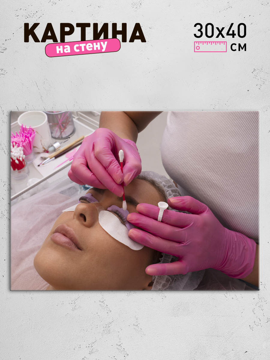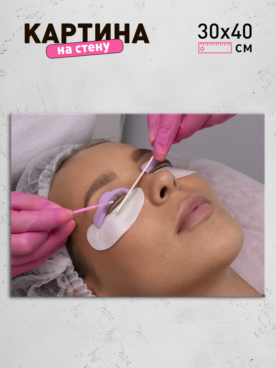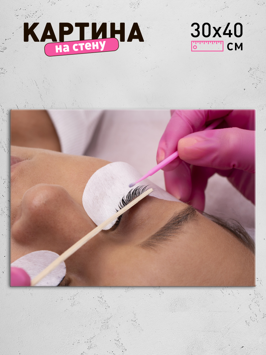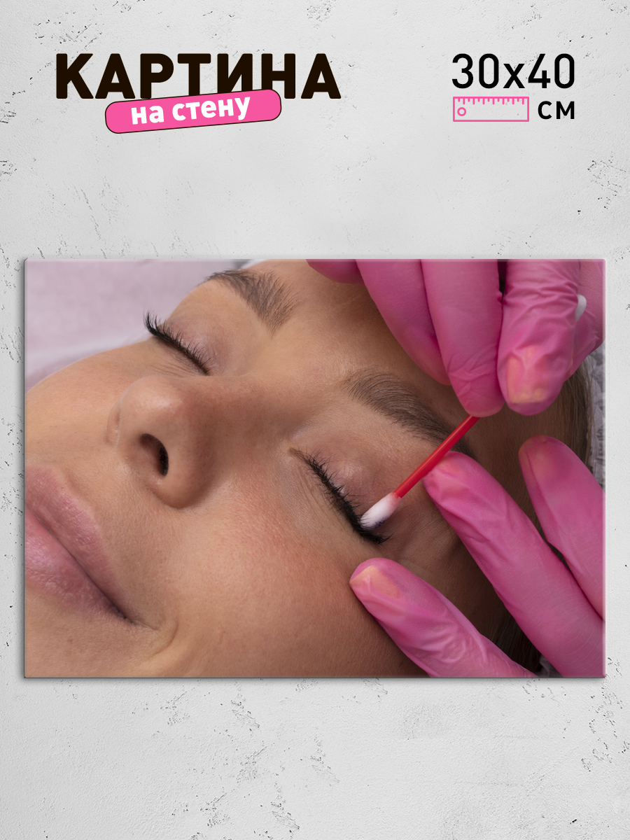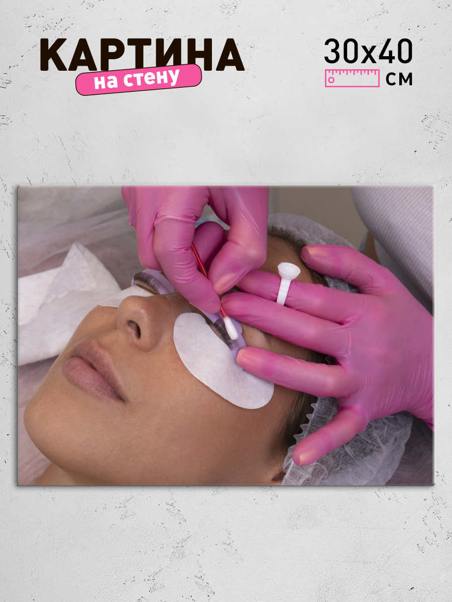 Описание: Картина 50 на 70 "Искусство взгляда: Наращивание ресниц" **Описание картины:** Эта детализированная картина передает интимный момент создания красоты – процесс наращивания ресниц. В фокусе – крупный план лица клиента и рук мастера в ярко-розовых перчатках, аккуратно работающих над созданием идеального взгляда. Контраст нежной кожи, ярких перчаток и белого патча под глазом создает художественно выразительную композицию. Уникальность картины в том, что она превращает рутинную бьюти-процедуру в настоящее искусство, подчеркивая точность, профессионализм и внимание к деталям. **Эмоции и чувства:** Картина вызывает ощущение спокойствия, доверия и предвкушения преображения. Яркие, сочные цвета дарят позитивный настрой и чувство стиля. Это изображение транслирует идею заботы о себе, эстетического удовольствия и совершенства, которое достигается благодаря мастерству. Глядя на нее, вы почувствуете вдохновение и желание подчеркнуть свою природную красоту. **Интерьер:** Этот принт на холсте идеально подойдет для оформления современного бьюти-пространства: салона красоты, студии наращивания ресниц или кабинета косметолога. Розовые и бежевые оттенки прекрасно впишутся в интерьер в стиле минимализм, модерн или гламур. Она также может стать ярким акцентом в домашнем интерьере – в спальне, гардеробной или личном будуаре, напоминая о важности ухода за собой и эстетике повседневной жизни. Размер 50х70 см позволяет разместить ее как центральный элемент декора.