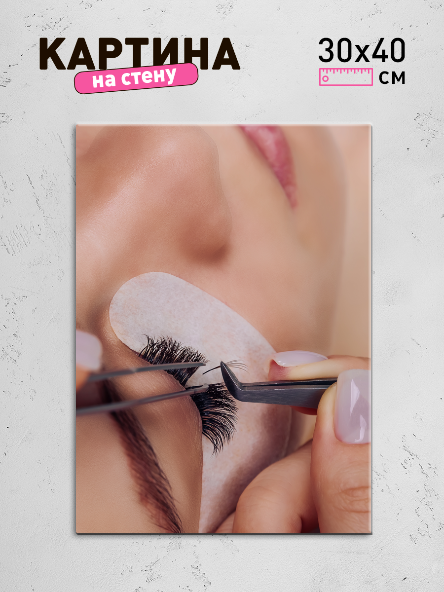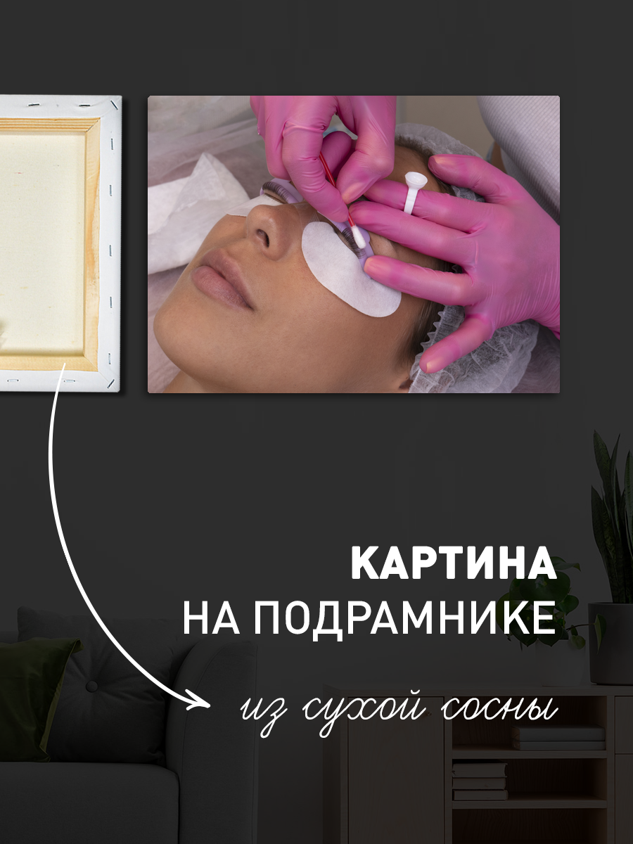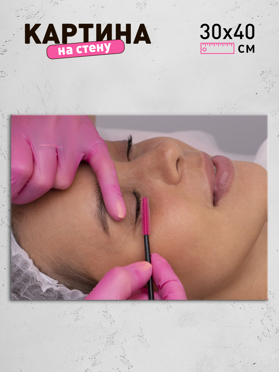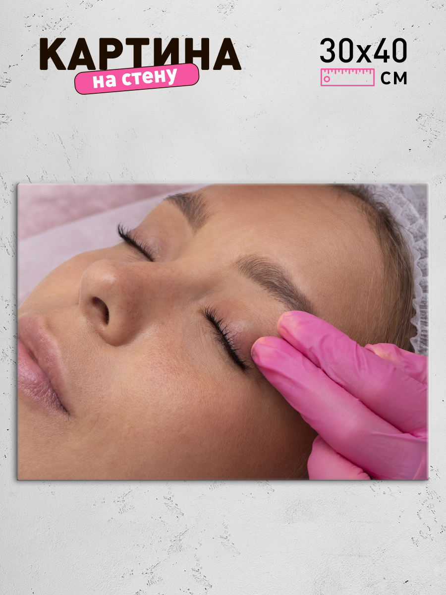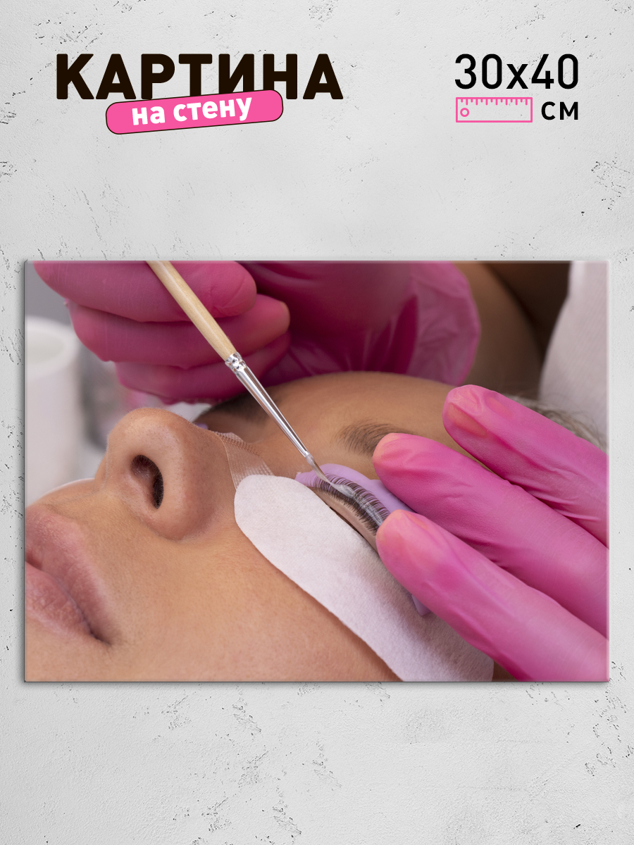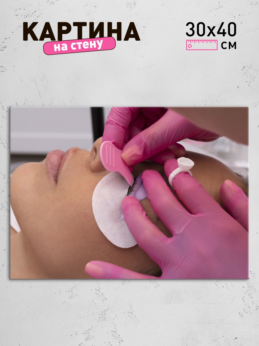 Описание: Картина 50 на 70 "Искусство взгляда: Наращивание ресниц" **Описание картины:** Эта детализированная картина передает интимный момент создания красоты – процесс наращивания ресниц. В фокусе – крупный план лица клиента и рук мастера в ярко-розовых перчатках, аккуратно работающих над созданием идеального взгляда. Контраст нежной кожи, ярких перчаток и белого патча под глазом создает художественно выразительную композицию. Уникальность картины в том, что она превращает рутинную бьюти-процедуру в настоящее искусство, подчеркивая точность, профессионализм и внимание к деталям. **Эмоции и чувства:** Картина вызывает ощущение спокойствия, доверия и предвкушения преображения. Яркие, сочные цвета дарят позитивный настрой и чувство стиля. Это изображение транслирует идею заботы о себе, эстетического удовольствия и совершенства, которое достигается благодаря мастерству. Глядя на нее, вы почувствуете вдохновение и желание подчеркнуть свою природную красоту. **Интерьер:** Этот принт на холсте идеально подойдет для оформления современного бьюти-пространства: салона красоты, студии наращивания ресниц или кабинета косметолога. Розовые и бежевые оттенки прекрасно впишутся в интерьер в стиле минимализм, модерн или гламур. Она также может стать ярким акцентом в домашнем интерьере – в спальне, гардеробной или личном будуаре, напоминая о важности ухода за собой и эстетике повседневной жизни. Размер 50х70 см позволяет разместить ее как центральный элемент декора.