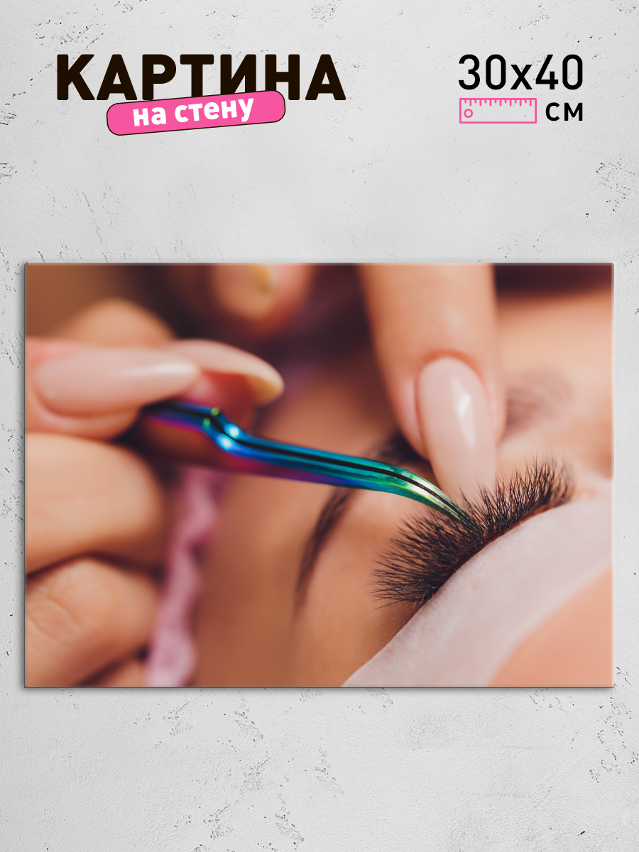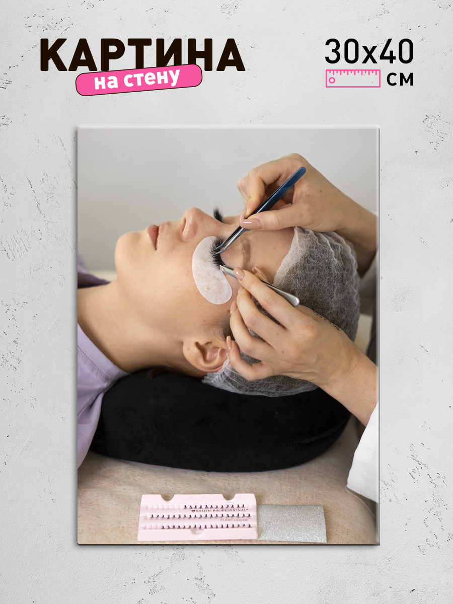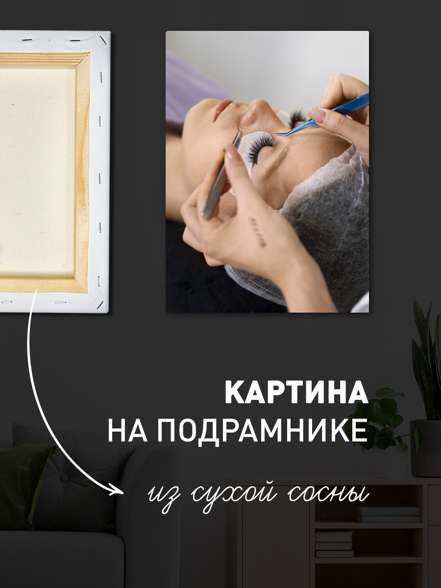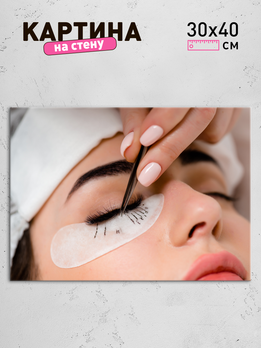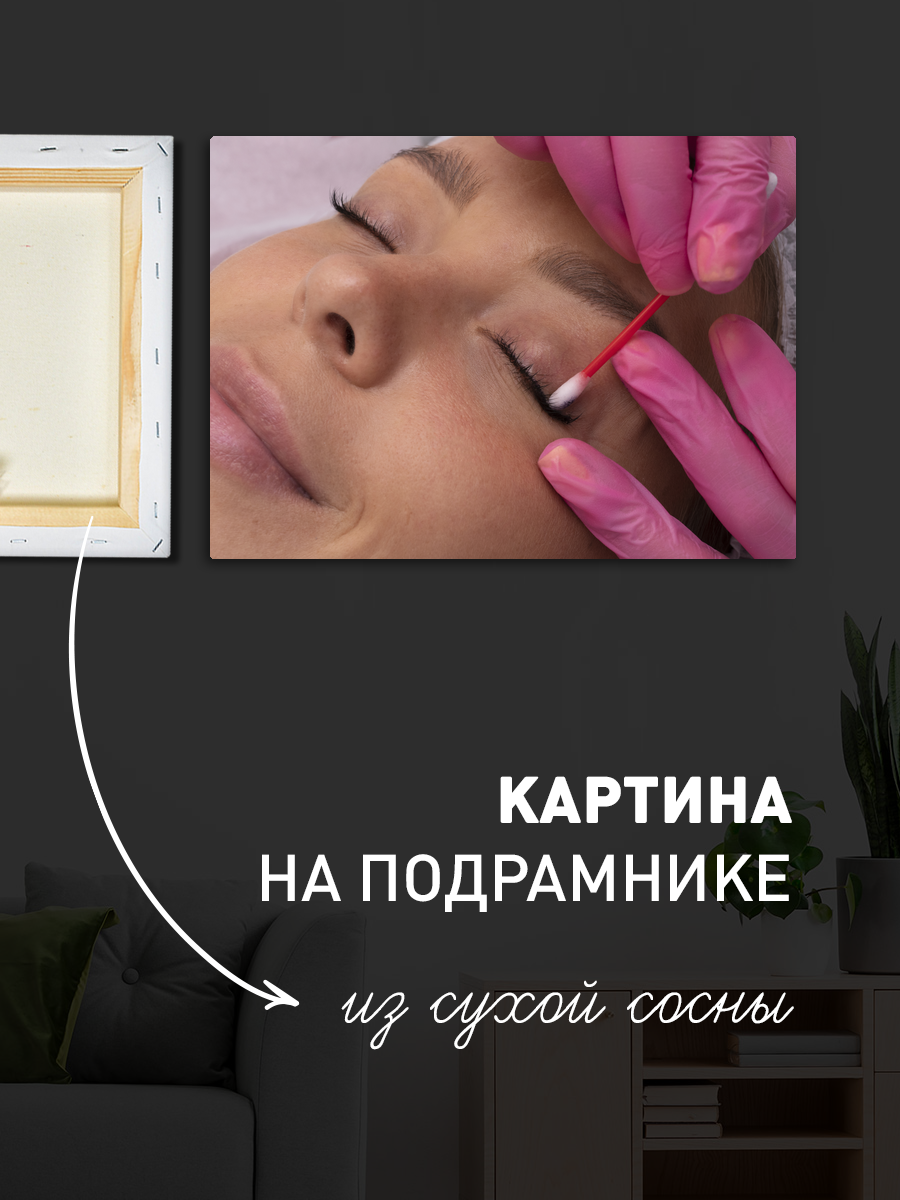 Описание: Картина 50 на 70 "Искусство взгляда: Наращивание ресниц" **Описание картины:** Эта детализированная картина передает интимный момент создания красоты – процесс наращивания ресниц. В фокусе – крупный план лица клиента и рук мастера в ярко-розовых перчатках, аккуратно работающих над созданием идеального взгляда. Контраст нежной кожи, ярких перчаток и белого патча под глазом создает художественно выразительную композицию. Уникальность картины в том, что она превращает рутинную бьюти-процедуру в настоящее искусство, подчеркивая точность, профессионализм и внимание к деталям. **Эмоции и чувства:** Картина вызывает ощущение спокойствия, доверия и предвкушения преображения. Яркие, сочные цвета дарят позитивный настрой и чувство стиля. Это изображение транслирует идею заботы о себе, эстетического удовольствия и совершенства, которое достигается благодаря мастерству. Глядя на нее, вы почувствуете вдохновение и желание подчеркнуть свою природную красоту. **Интерьер:** Этот принт на холсте идеально подойдет для оформления современного бьюти-пространства: салона красоты, студии наращивания ресниц или кабинета косметолога. Розовые и бежевые оттенки прекрасно впишутся в интерьер в стиле минимализм, модерн или гламур. Она также может стать ярким акцентом в домашнем интерьере – в спальне, гардеробной или личном будуаре, напоминая о важности ухода за собой и эстетике повседневной жизни. Размер 50х70 см позволяет разместить ее как центральный элемент декора.