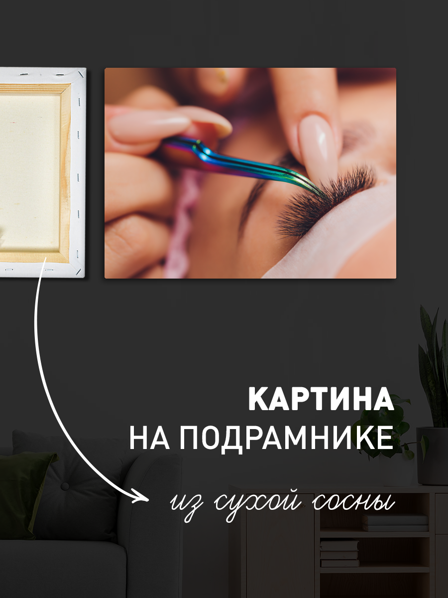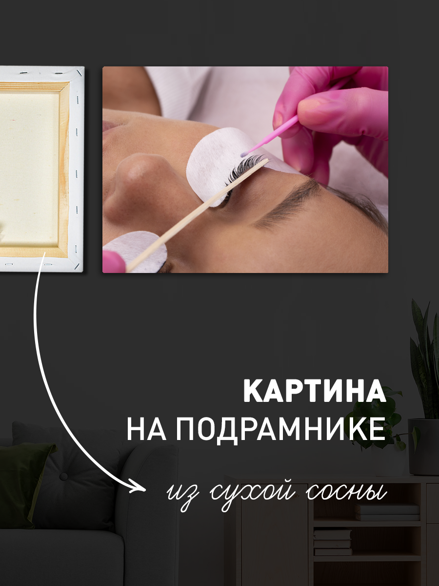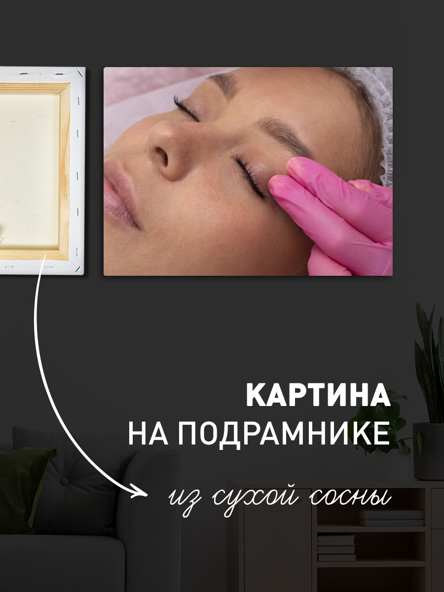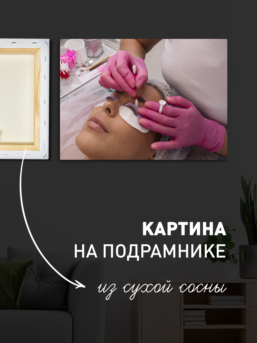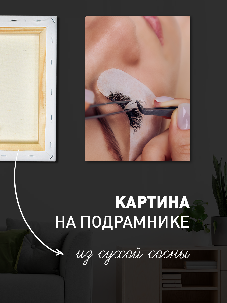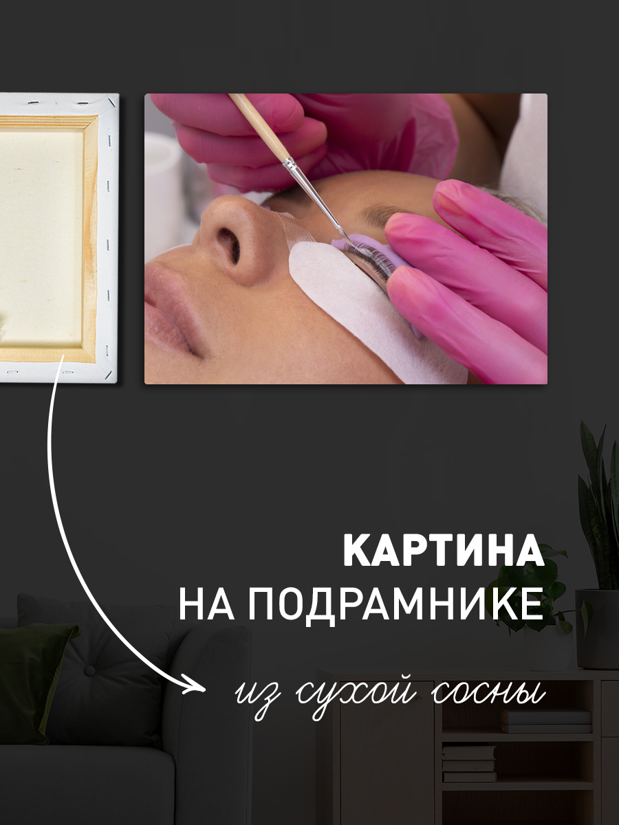 Описание: Картина 50 на 70 "Искусство взгляда: Наращивание ресниц" **Описание картины:** Эта детализированная картина передает интимный момент создания красоты – процесс наращивания ресниц. В фокусе – крупный план лица клиента и рук мастера в ярко-розовых перчатках, аккуратно работающих над созданием идеального взгляда. Контраст нежной кожи, ярких перчаток и белого патча под глазом создает художественно выразительную композицию. Уникальность картины в том, что она превращает рутинную бьюти-процедуру в настоящее искусство, подчеркивая точность, профессионализм и внимание к деталям. **Эмоции и чувства:** Картина вызывает ощущение спокойствия, доверия и предвкушения преображения. Яркие, сочные цвета дарят позитивный настрой и чувство стиля. Это изображение транслирует идею заботы о себе, эстетического удовольствия и совершенства, которое достигается благодаря мастерству. Глядя на нее, вы почувствуете вдохновение и желание подчеркнуть свою природную красоту. **Интерьер:** Этот принт на холсте идеально подойдет для оформления современного бьюти-пространства: салона красоты, студии наращивания ресниц или кабинета косметолога. Розовые и бежевые оттенки прекрасно впишутся в интерьер в стиле минимализм, модерн или гламур. Она также может стать ярким акцентом в домашнем интерьере – в спальне, гардеробной или личном будуаре, напоминая о важности ухода за собой и эстетике повседневной жизни. Размер 50х70 см позволяет разместить ее как центральный элемент декора.