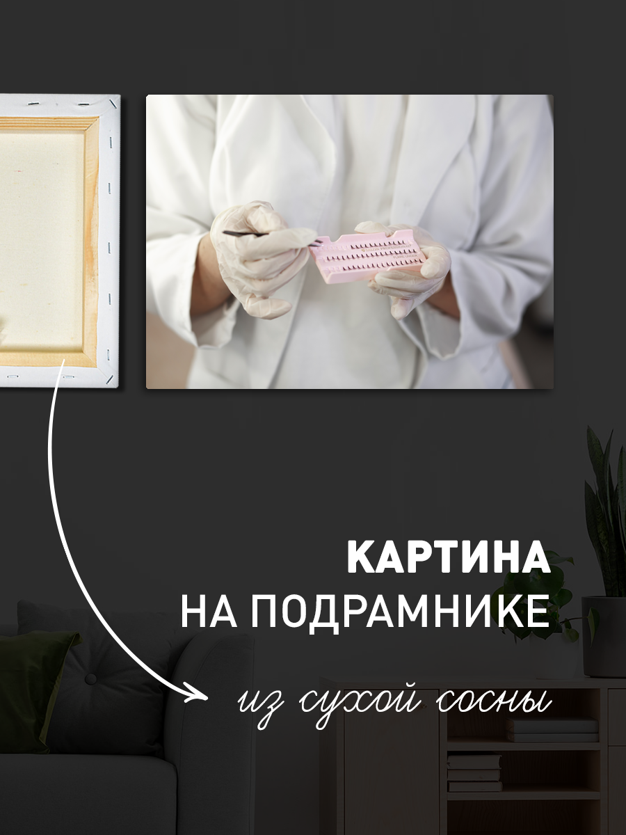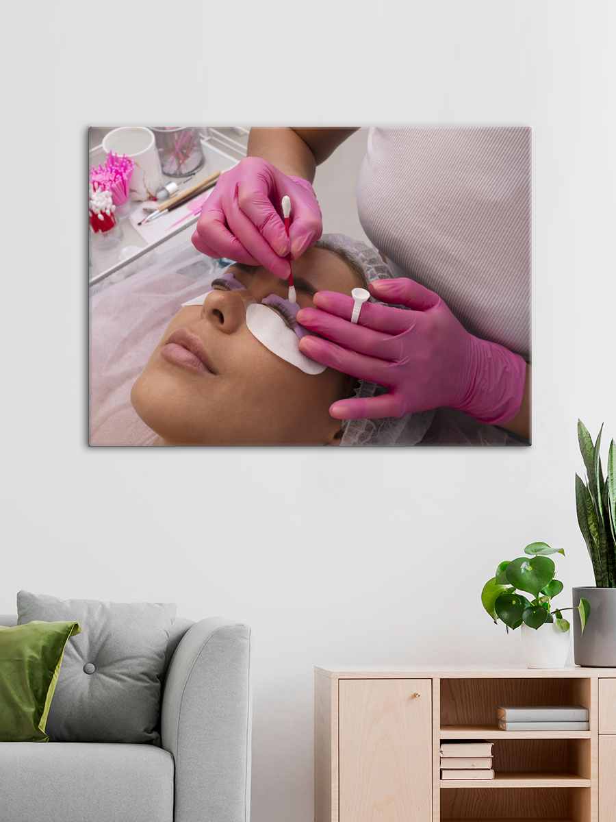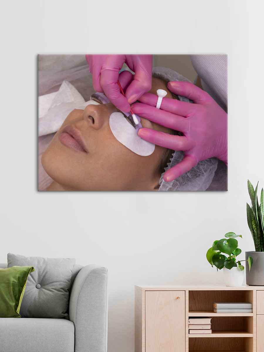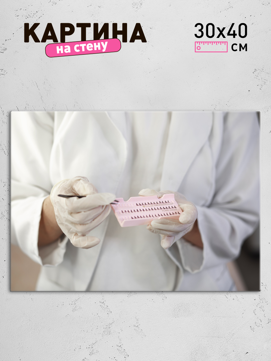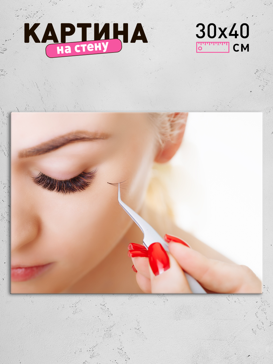 Описание: Картина 50 на 70 "Искусство взгляда: Наращивание ресниц" **Описание картины:** Эта детализированная картина передает интимный момент создания красоты – процесс наращивания ресниц. В фокусе – крупный план лица клиента и рук мастера в ярко-розовых перчатках, аккуратно работающих над созданием идеального взгляда. Контраст нежной кожи, ярких перчаток и белого патча под глазом создает художественно выразительную композицию. Уникальность картины в том, что она превращает рутинную бьюти-процедуру в настоящее искусство, подчеркивая точность, профессионализм и внимание к деталям. **Эмоции и чувства:** Картина вызывает ощущение спокойствия, доверия и предвкушения преображения. Яркие, сочные цвета дарят позитивный настрой и чувство стиля. Это изображение транслирует идею заботы о себе, эстетического удовольствия и совершенства, которое достигается благодаря мастерству. Глядя на нее, вы почувствуете вдохновение и желание подчеркнуть свою природную красоту. **Интерьер:** Этот принт на холсте идеально подойдет для оформления современного бьюти-пространства: салона красоты, студии наращивания ресниц или кабинета косметолога. Розовые и бежевые оттенки прекрасно впишутся в интерьер в стиле минимализм, модерн или гламур. Она также может стать ярким акцентом в домашнем интерьере – в спальне, гардеробной или личном будуаре, напоминая о важности ухода за собой и эстетике повседневной жизни. Размер 50х70 см позволяет разместить ее как центральный элемент декора.