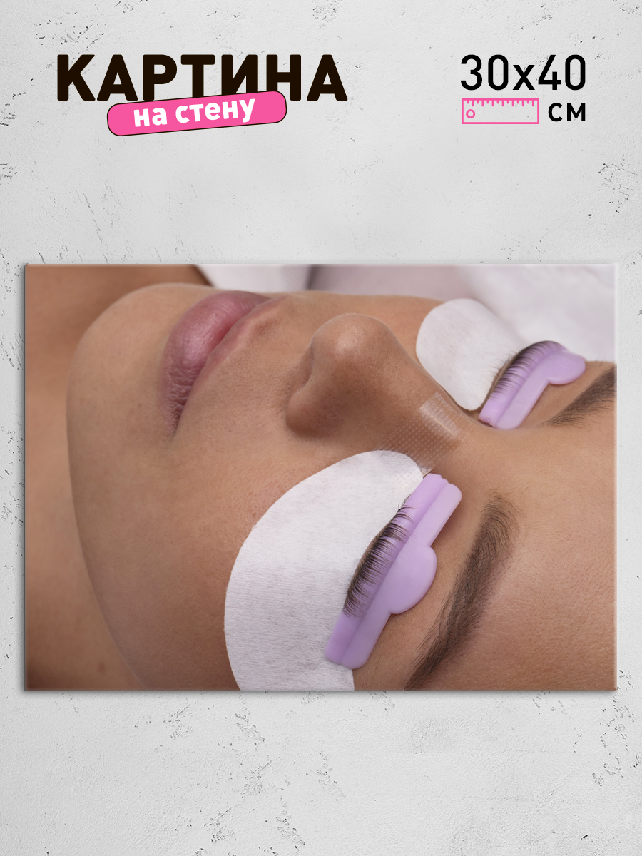 Описание: Картина 50 на 70 "Идеальный Взгляд. Ламинирование ресниц" Эта картина запечатлела момент преображения – процесс ламинирования ресниц, демонстрируя заботу о красоте и детали профессионального ухода. Крупный план женского лица с закрытыми глазами, на которых аккуратно расположены белые патчи и нежно-розовые силиконовые валики для фиксации ресниц, приковывает внимание. Изображение сосредоточено на идеально гладкой коже лица теплого бежевого оттенка и контрасте темных ресниц и изящных бровей. Процедура представлена как тонкое искусство, обещающее невероятный результат – распахнутый и выразительный взгляд. Картина вызывает ощущение умиротворения, расслабленности и предвкушения красоты. Она излучает атмосферу ухода за собой, женственности и внимания к деталям. Глядя на это изображение, вы почувствуете спокойствие, присущее профессиональным бьюти-процедурам, и вдохновение на преображение. Это символ современной эстетики и стремления к безупречности. Полотно станет идеальным дополнением для интерьера салона красоты, студии ламинирования или наращивания ресниц, а также косметологического кабинета. Оно подчеркнет профессионализм и внимание к клиентам. Благодаря нейтральной цветовой гамме с преобладанием бежевого, белого и нежных розовых акцентов, картина легко впишется в минималистичный, скандинавский или современный интерьер. Это стильный акцент для комнаты, посвященной красоте и здоровью.