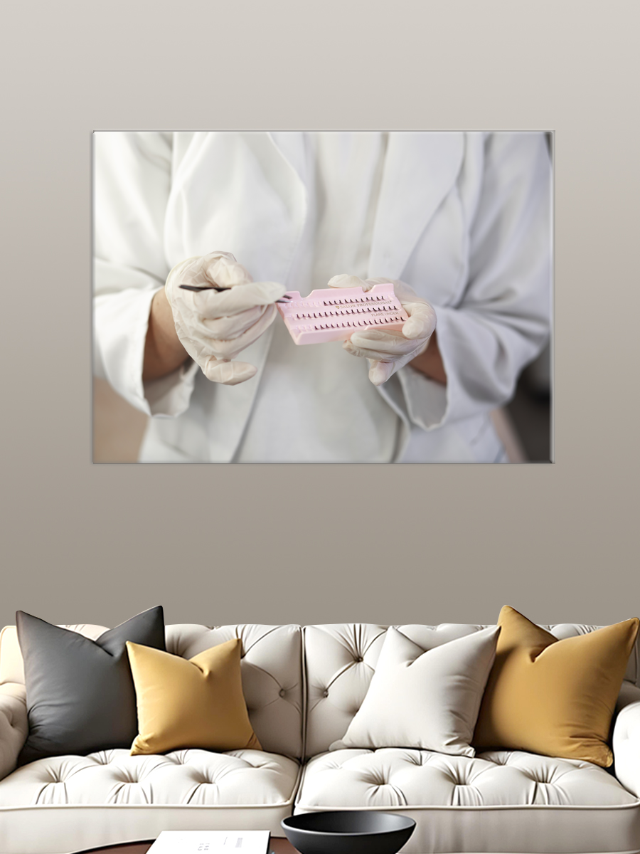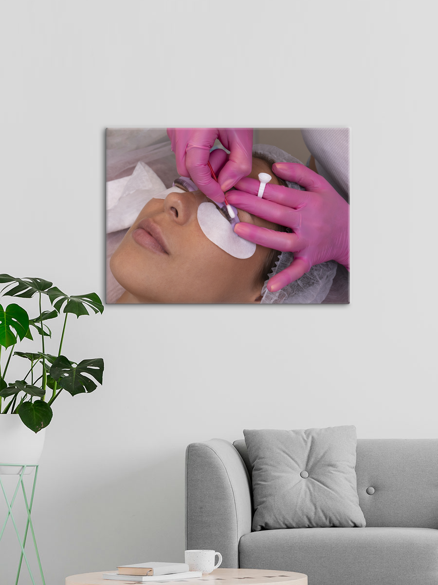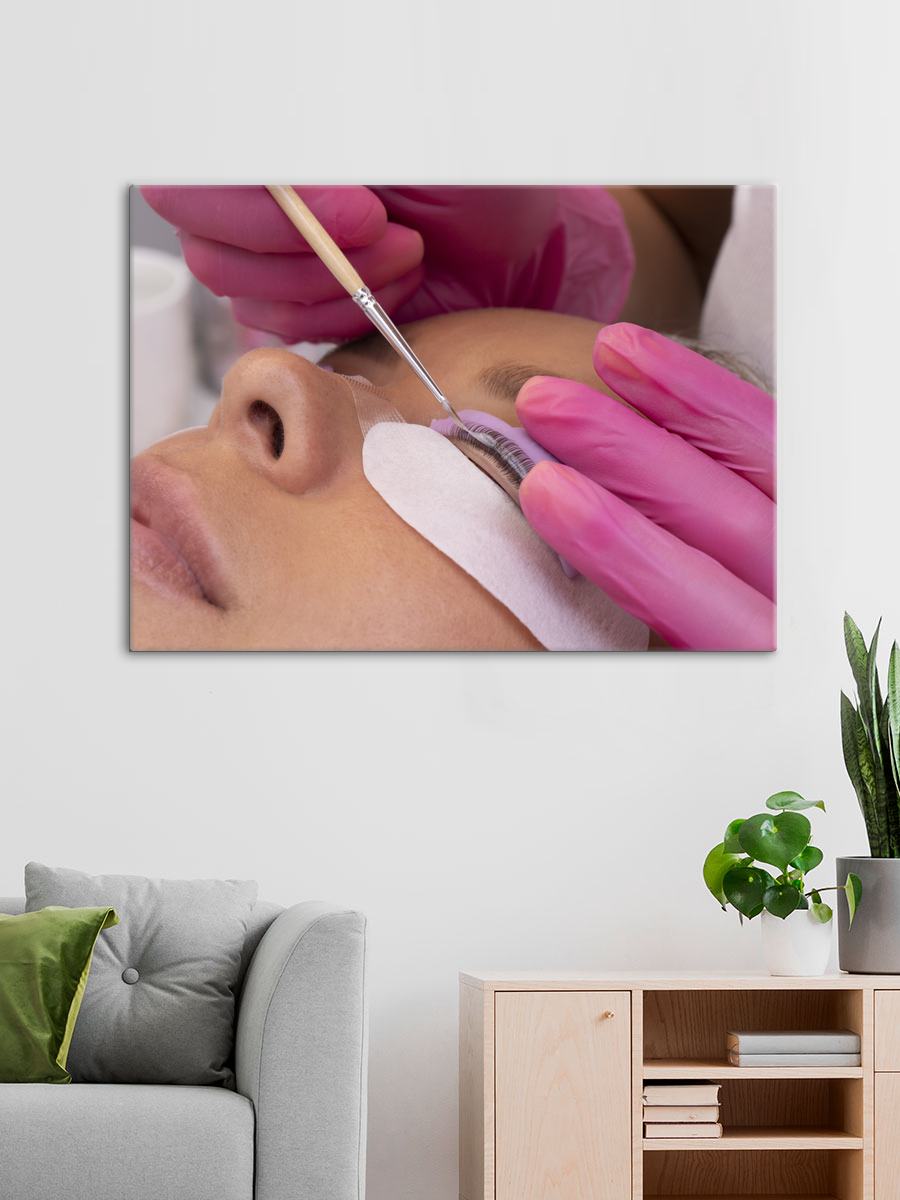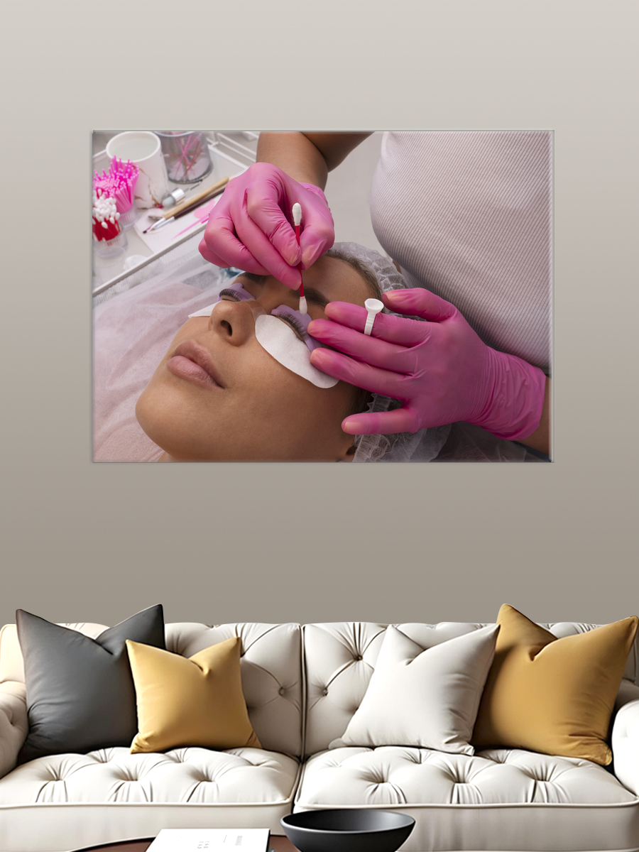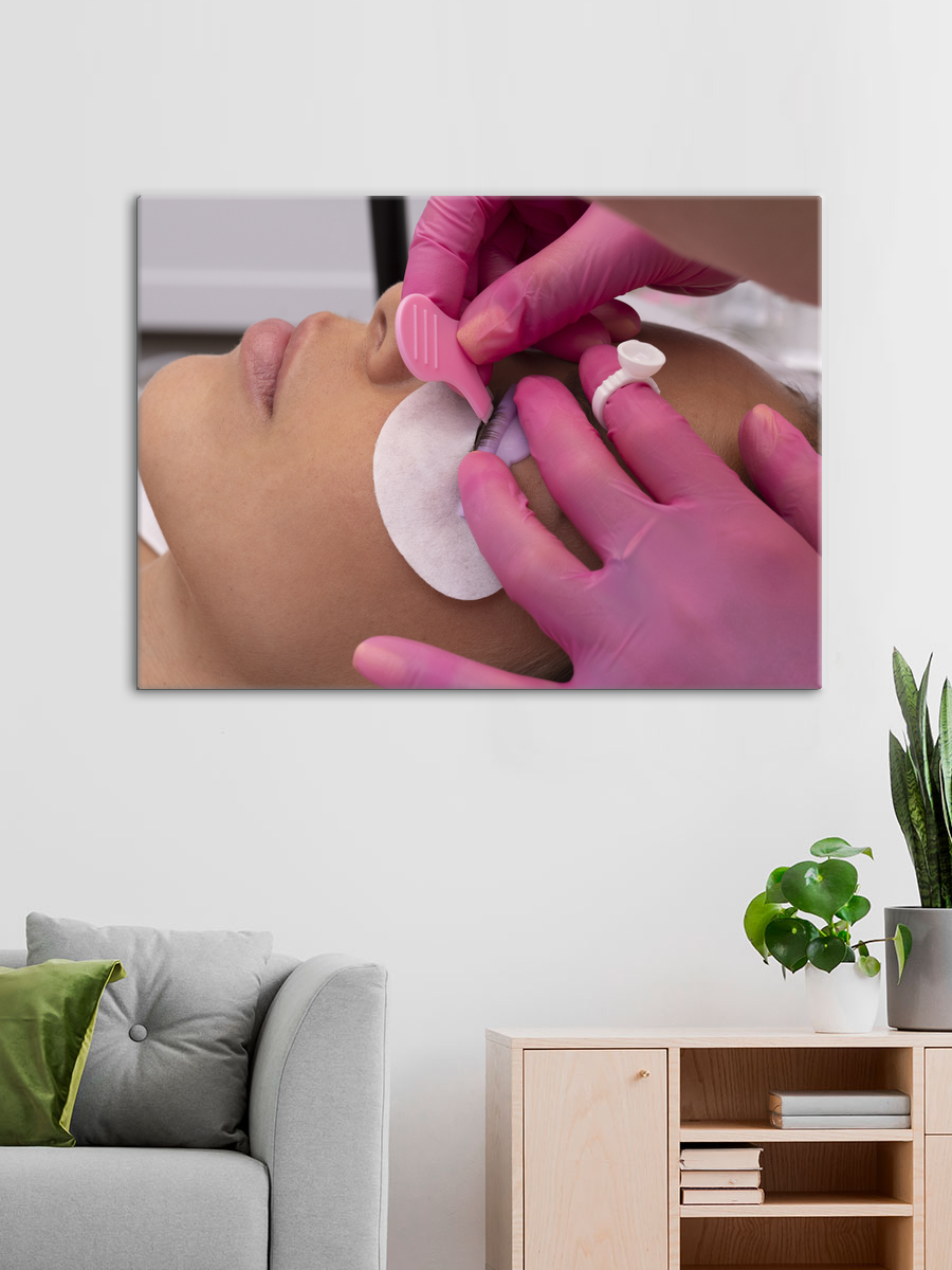 Описание: Картина 50 на 70 "Искусство совершенного взгляда" – это напечатанное на холсте изображение, которое захватывает момент точности и преображения в процедуре ламинирования или моделирования ресниц. В центре композиции — руки мастера в ярких, насыщенно-розовых перчатках, которые демонстрируют профессионализм и аккуратность. Эти руки сосредоточенно работают над ресницами модели, используя специальный инструмент с аппликатором. Контраст между ярким розовым цветом и мягкими, бежево-розоватыми тонами фона и кожи создает выразительный акцент, символизирующий страсть к красоте и внимание к деталям. На глазах модели видны фиолетовые валики, фиксирующие ресницы, и белые патчи, защищающие нижнее веко, — все это подчеркивает таинство и ювелирность процесса ухода за собой. Эта картина вызывает чувство доверия, релаксации и эстетического удовольствия. Она идеально впишется в интерьер салона красоты, студии ламинирования ресниц, косметологического кабинета или даже стильной квартиры, оформленной в современном или минималистичном стиле. Она служит не только украшением, но и вдохновляющим элементом, подчеркивающим важность самозаботы и мастерства в сфере бьюти-индустрии.