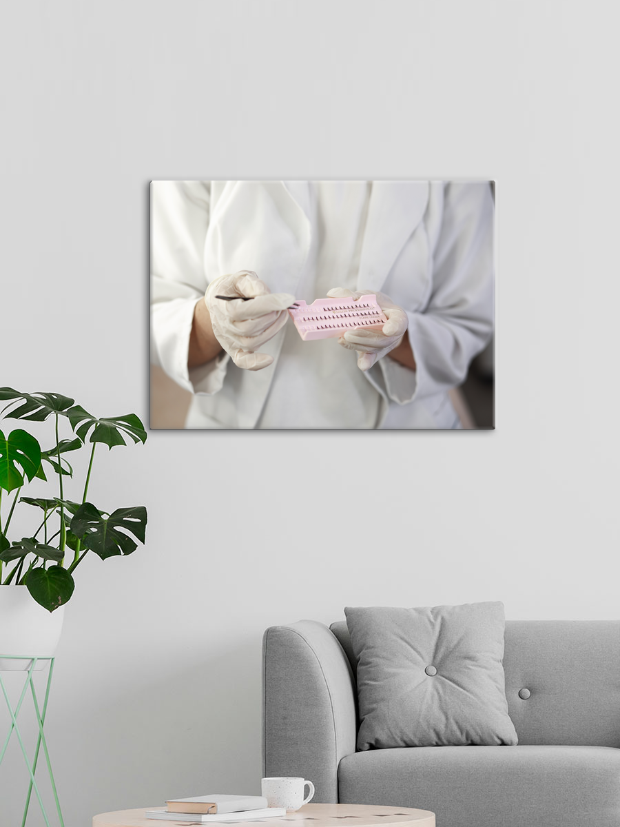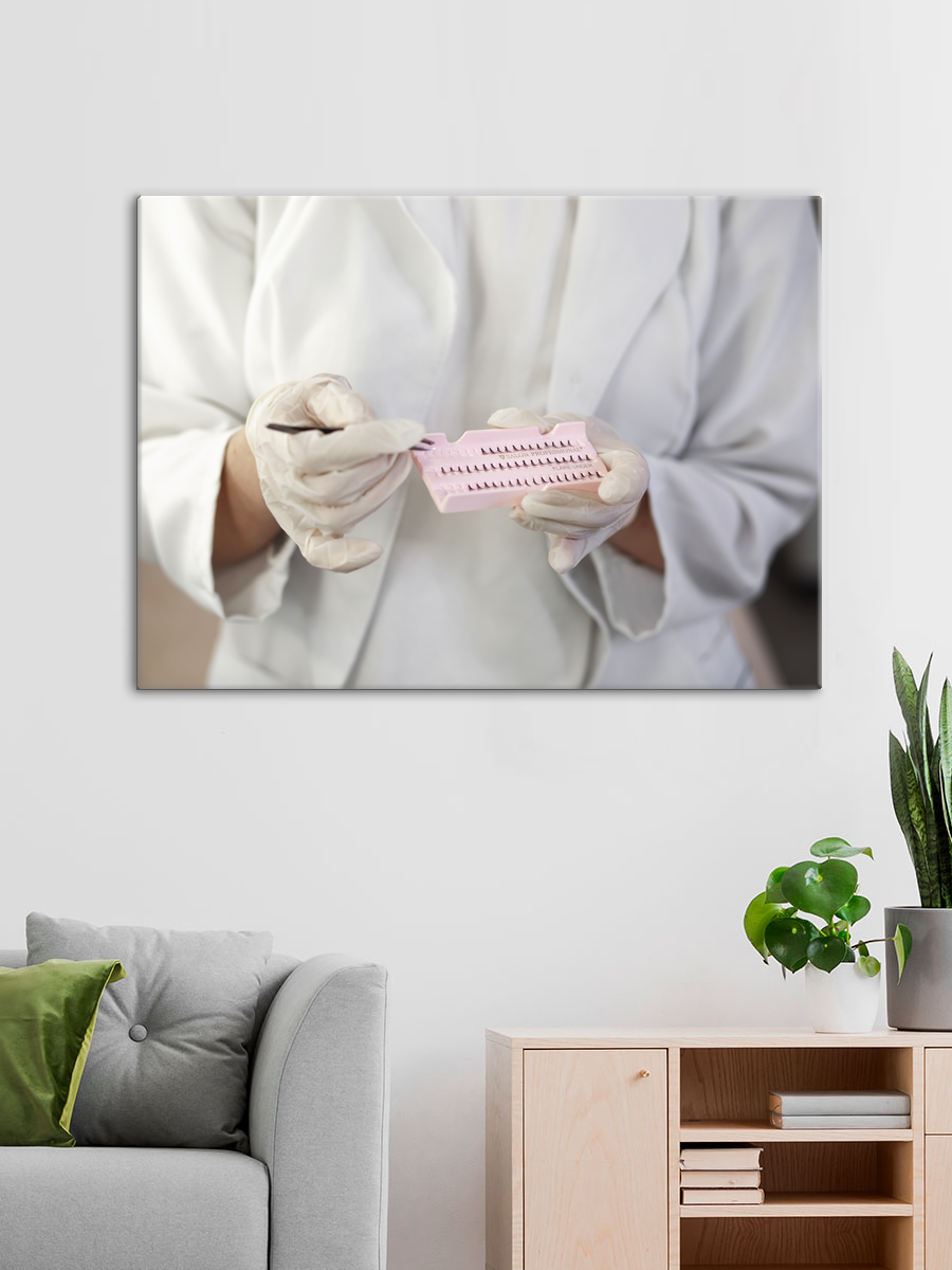 Описание: Картина 50 на 70 "Мастерская взгляда" – это высококачественная печать на холсте, запечатлевшая момент подготовки к созданию идеального образа. В центре внимания — руки мастера в белоснежных перчатках, держащие поднос с аккуратно разложенными пучками накладных ресниц и тонкий пинцет. Эта картина передает атмосферу точности, стерильности и профессионализма, характерную для индустрии красоты. Изображение демонстрирует бережное отношение к деталям и ювелирную работу мастера. Ярко выраженный белый цвет халата и перчаток создает ощущение чистоты и доверия, а нежно-розовый цвет палетки с ресницами добавляет мягкости и женственности. "Мастерская взгляда" вызывает чувство эстетического удовольствия и восхищения процессом преображения. Она идеально впишется в интерьер салона красоты, студии лашмейкера, косметологического кабинета или станет стильным акцентом в домашнем пространстве, оформленном в современном стиле, минимализме или скандинавском дизайне. Эта картина подчеркнет вашу любовь к красоте и внимание к деталям.