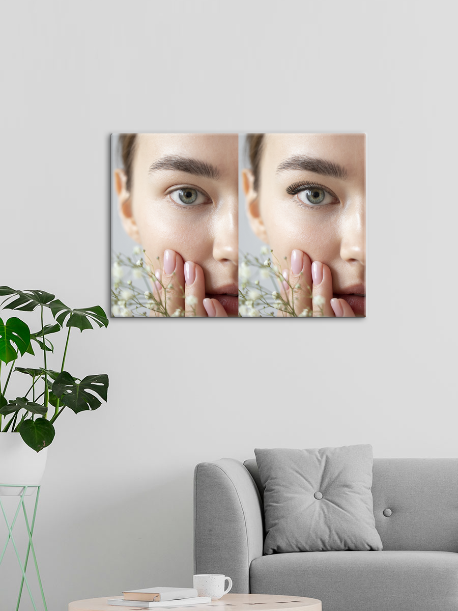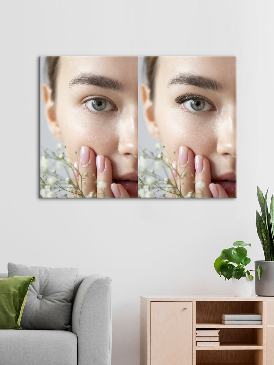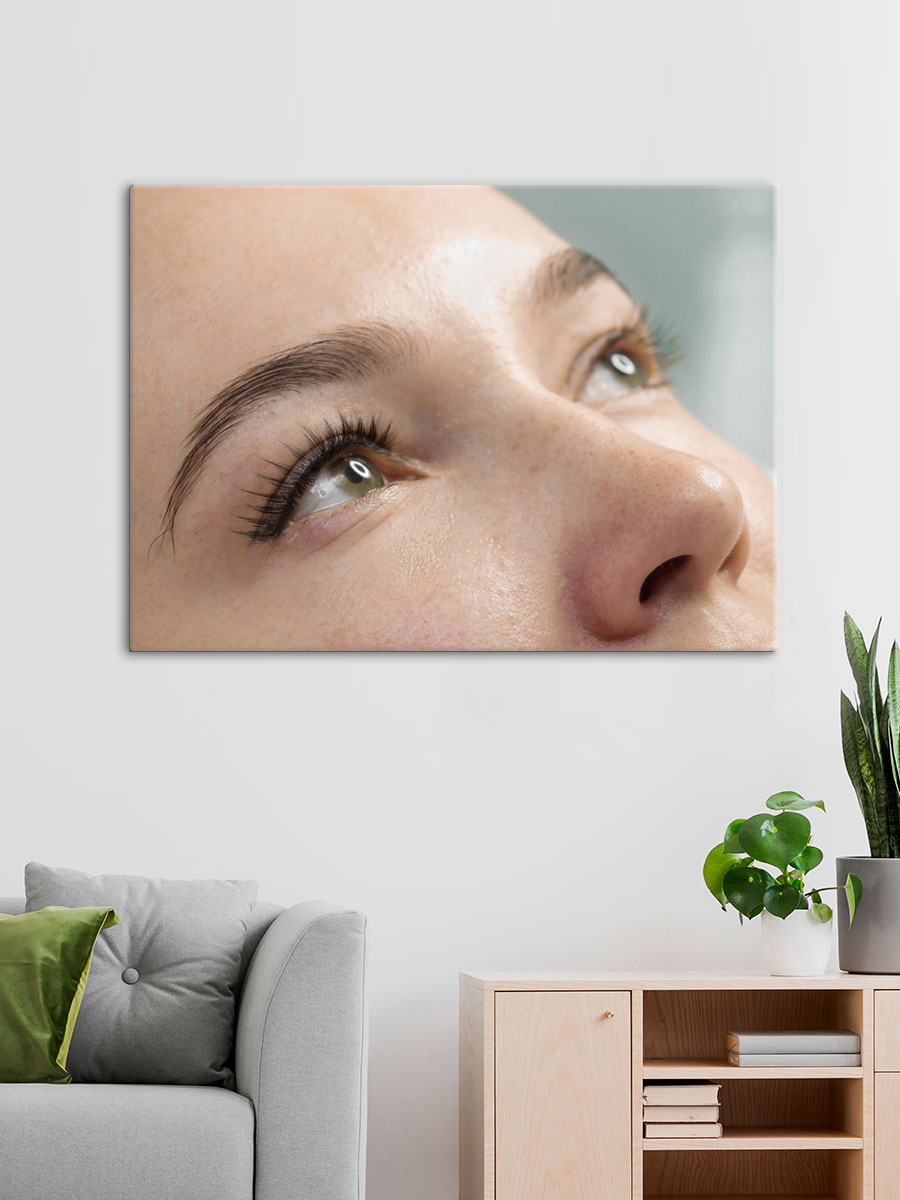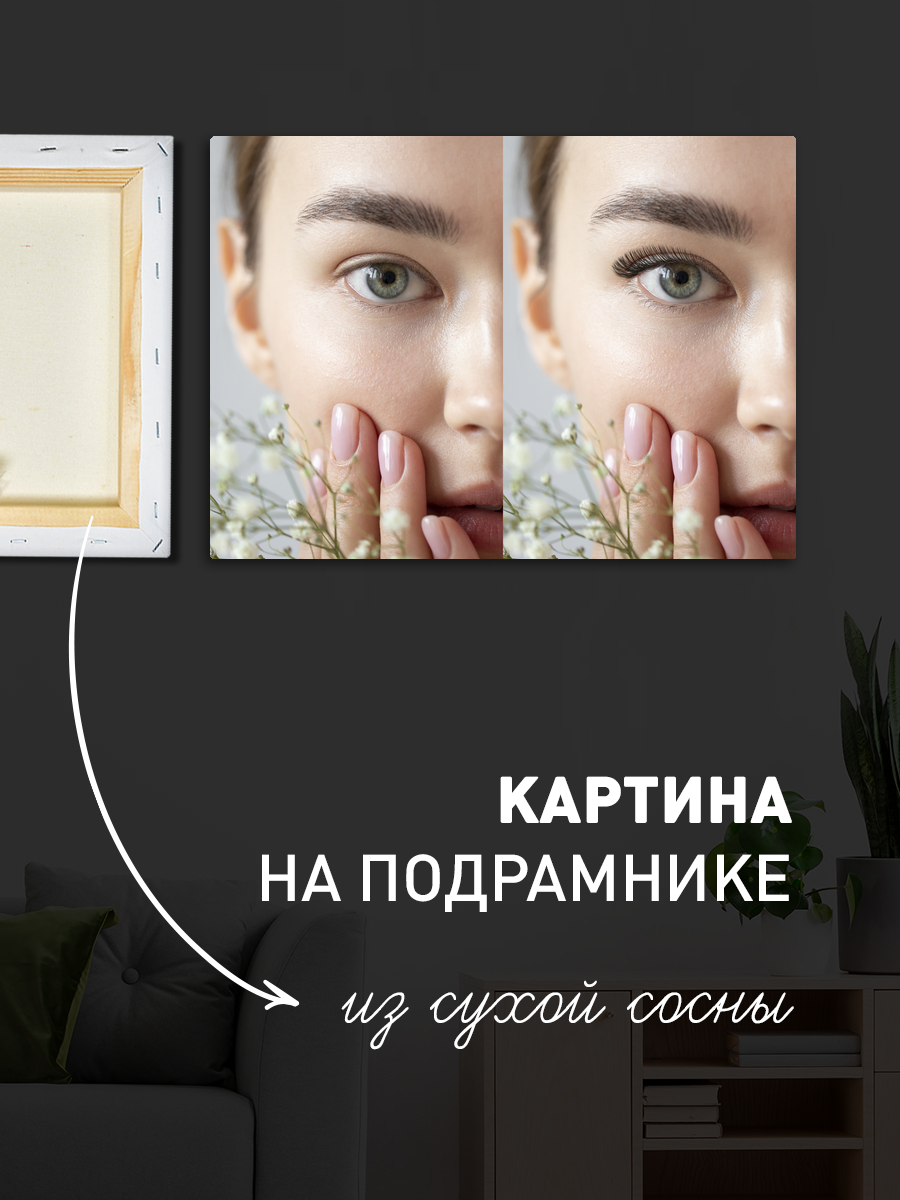 Описание: Картина 50 на 70 "Взгляд в идеале" — напечатанное на холсте изображение, демонстрирующее крупным планом процесс совершенствования красоты взгляда. В центре внимания — закрытый глаз модели, обрамленный безупречными, густыми и длинными черными ресницами после наращивания или ламинирования. Уникальность этой картины заключается в гиперреалистичной детализации: видна каждая ресничка, контрастирующая с нежной кожей и светлым, защитным гидрогелевым патчем под нижним веком. Преобладание нежных бежевых, телесных оттенков кожи создает ощущение тепла и интимности момента, а чистый белый цвет патча подчеркивает профессионализм и чистоту процедуры. Эта картина вызывает чувство расслабления, доверия к мастеру и предвкушения результата. Она символизирует уход за собой, внимание к деталям и преображение. Идеально подойдет для интерьера салона красоты, Brow & Lash бара, косметологического кабинета или личного будуара. Она добавит пространству элегантности, подчеркнет его направленность на красоту и эстетику, создавая при этом спокойную и вдохновляющую атмосферу.