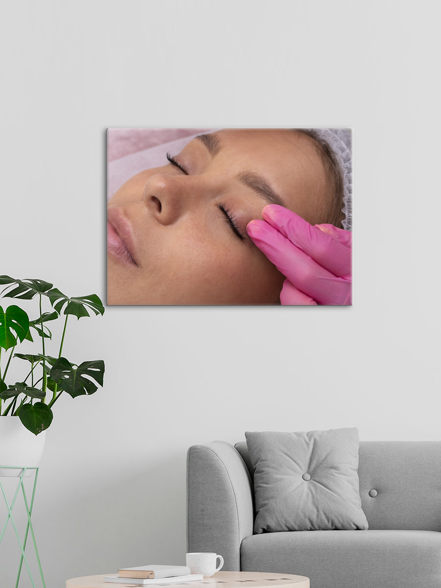 Описание: Картина 50 на 70 "Искусство преображения: взгляд под защитой" – это напечатанное на холсте изображение, которое захватывает интимный и сосредоточенный момент бьюти-процедуры, вероятно, ламинирования или окрашивания ресниц. Крупный план лица модели с закрытыми глазами, погруженной в расслабление и доверие, создает атмосферу уюта и профессионализма. Основной акцент сделан на контрасте: нежные бежевые и персиковые оттенки кожи модели служат мягким фоном для ярких, насыщенных фуксиевых перчаток мастера, подчеркивая их аккуратность и точность движений. В кадре видна тонкая красная палочка-аппликатор с белым ватным наконечником, который бережно касается линии ресниц. Эти элементы символизируют заботу, мастерство и внимание к деталям, превращая повседневную процедуру в настоящее искусство. Картина вызывает чувства спокойствия, эстетического удовольствия и ожидания идеального результата. Она идеально подойдет для современного интерьера салона красоты, студии ламинирования ресниц, косметологического кабинета или личного пространства тех, кто ценит уход за собой и эстетику. Сочетание теплых телесных тонов и смелого розового цвета делает эту работу акцентным элементом декора, который добавит яркости и гламура в любое помещение, будь то минималистичный, скандинавский или гламурный стиль.