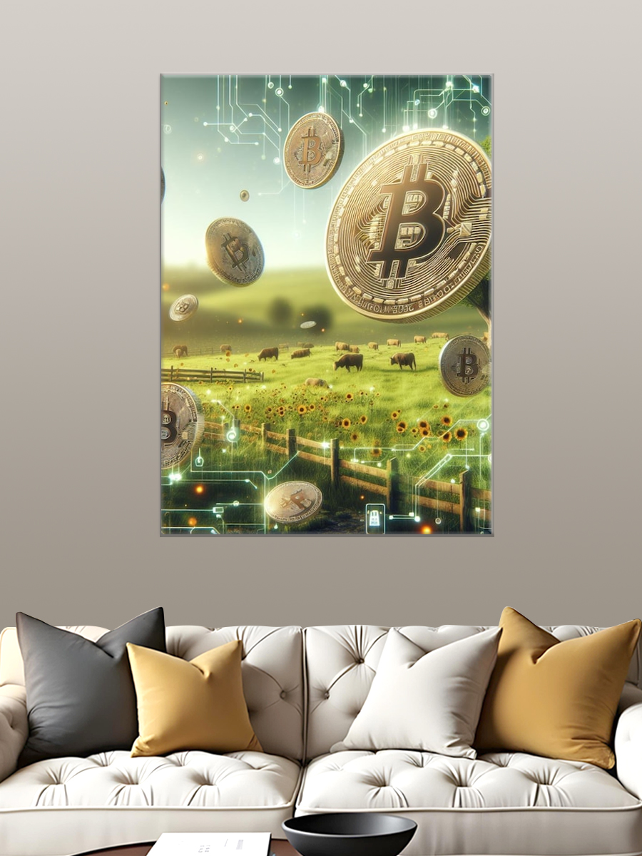 Описание: Картина 50 на 70 "Виртуальные пастбища" представляет собой уникальное слияние природы и цифрового искусства. На фоне живописного пейзажа с зелеными холмами, солнечными цветами и мирно пасущимися коровами парят золотые монеты биткойна, символизируя современную эпоху финансов и технологий. Эта картина вызывает чувство гармонии между традиционным сельским образом жизни и современными экономическими концепциями, создавая уникальный контраст, который заставляет задуматься о будущем. Каждый элемент работы тщательно продуман: мягкий свет заливает сцену, создавая теплую и уютную атмосферу. Эмоции, которые она вызывает, варьируются от спокойствия и умиротворения до любопытства и вдохновения. Вы словно переноситесь в мир, где природа и технологии могут сосуществовать в гармонии, вызывая ощущение надежды на будущее. Эта картина будет великолепным дополнением как к современному, так и к классическому интерьеру. Она отлично подойдет для гостиной, кабинета или даже рабочего пространства, привнося в него нотки креативности и оригинальности. Разместив её на стене, вы сможете создать уникальную атмосферу, которая будет вдохновлять вас и ваших гостей. "Виртуальные пастбища" — это не просто картина, это окно в мир, где сливаются традиции и инновации.