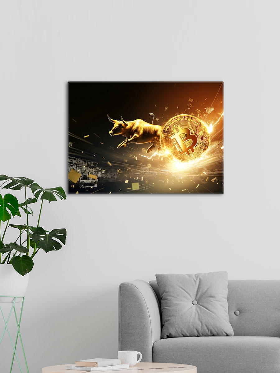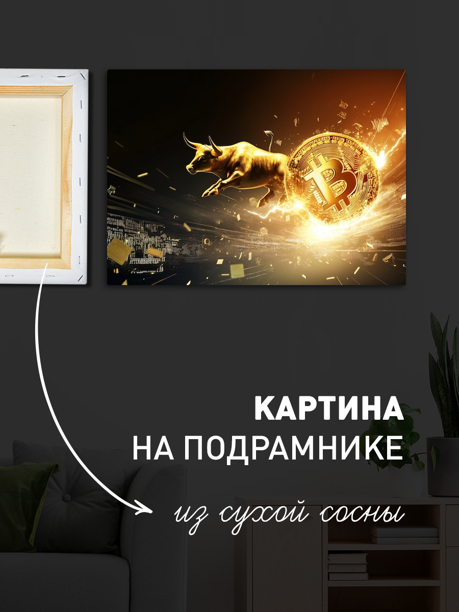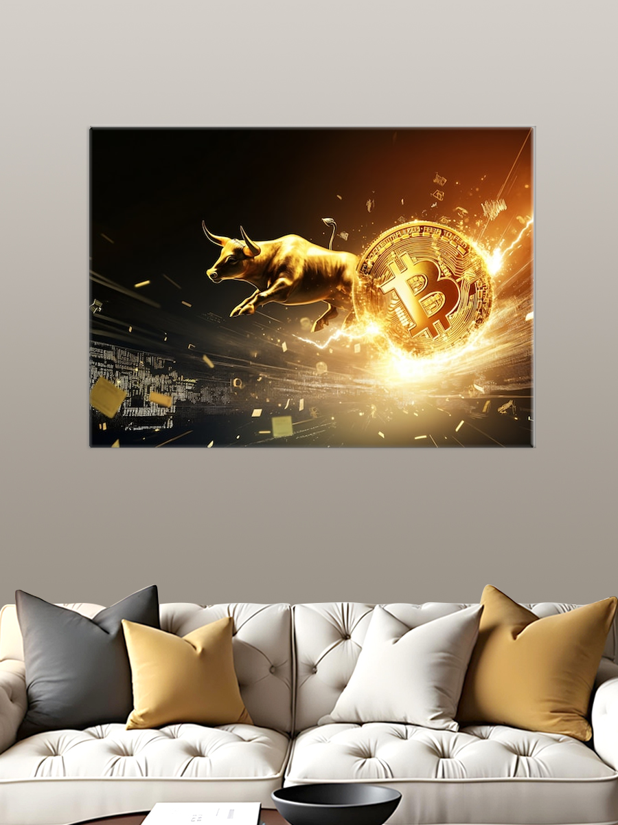 Описание: Картина 50 на 70 'Бычий рынок'. На этом произведении искусства изображен мощный золотой бык, стремительно прыгающий в облаке ярких золотистых и оранжевых оттенков, символизируя уверенность и рост на финансовом рынке криптовалют. Уникальность картины заключается в ее динамичности и энергии, которые передают дух оптимизма и веры в будущее. Это произведение вызывает чувства вдохновения и стремления к успеху, наполняя пространство положительной энергией. 'Бычий рынок' станет отличным дополнением к современному интерьеру, идеально вписываясь в рабочие кабинеты, офисные пространства или даже уютные уголки в доме. Она привлечет внимание и станет предметом обсуждения среди гостей, создавая атмосферу уверенности и амбиций.