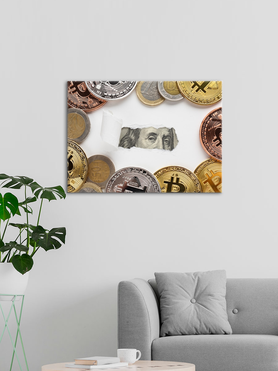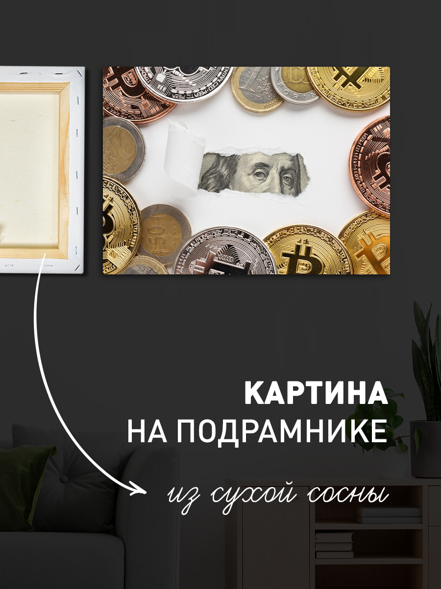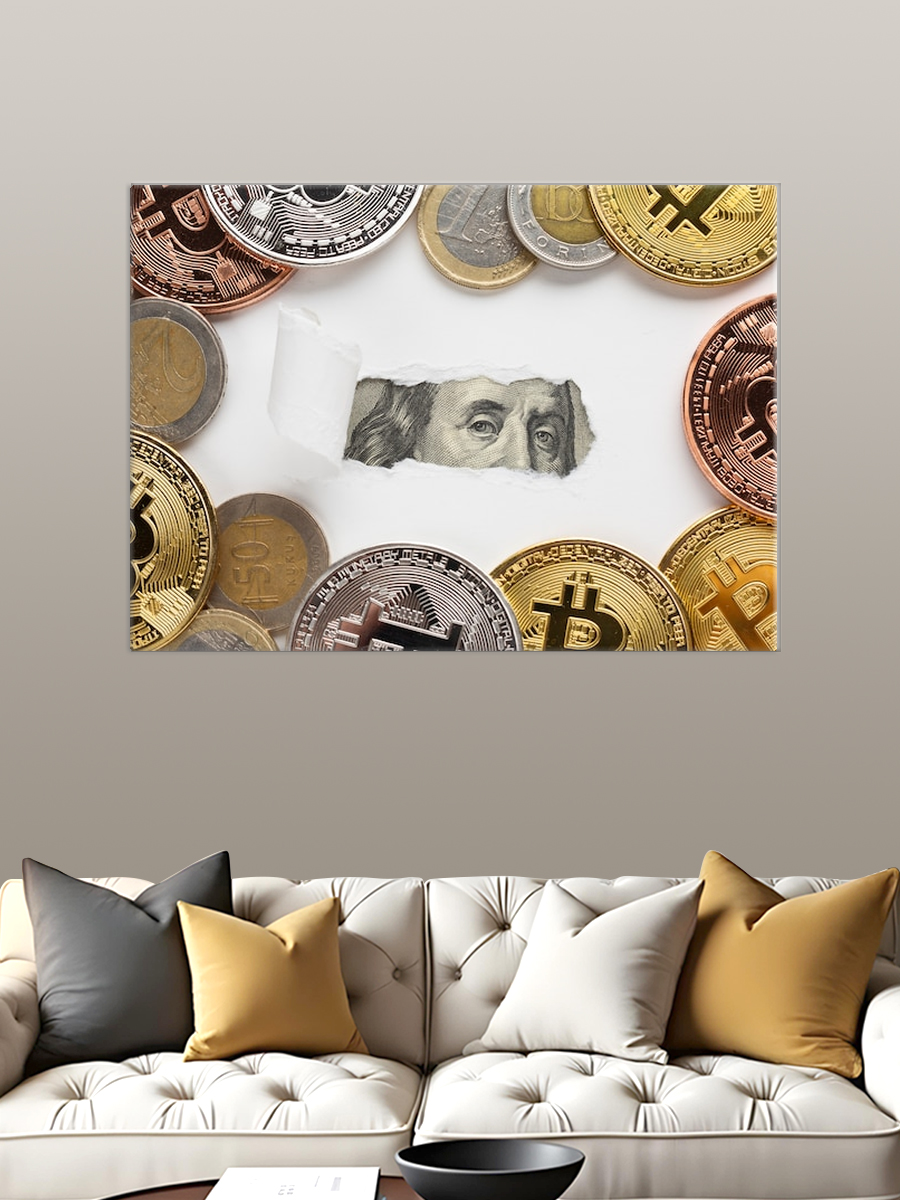 Описание: Картина 50 на 70 "Финансовая симфония" представляет собой уникальное произведение искусства, которое сочетает в себе элементы традиционных и современных финансовых символов. На холсте изображены крупные золотые и серебряные монеты, окруженные криптовалютами, создающими контраст с разорванным изображением лица Бенджамина Франклина. Основная идея картины заключается в противостоянии между классическими и цифровыми валютами, что вызывает размышления о будущем финансового мира. Эта картина вызывает широкий спектр эмоций: от ностальгии по традиционным ценностям до вдохновения на принятие новых технологий. Она подчеркивает важность изменений и адаптации в современном обществе, что делает её актуальной и запоминающейся. "Финансовая симфония" идеально подходит для современных интерьеров, особенно в офисах, кабинетах, а также в жилых пространствах, где ценятся стиль и оригинальность. Её можно повесить в рабочем пространстве, где она будет вдохновлять на успех и инновации, или в гостиной, чтобы стать центром обсуждения и привлечь внимание гостей. Эта картина не только украсит ваш интерьер, но и станет символом вашего стремления к новым финансовым высотам.