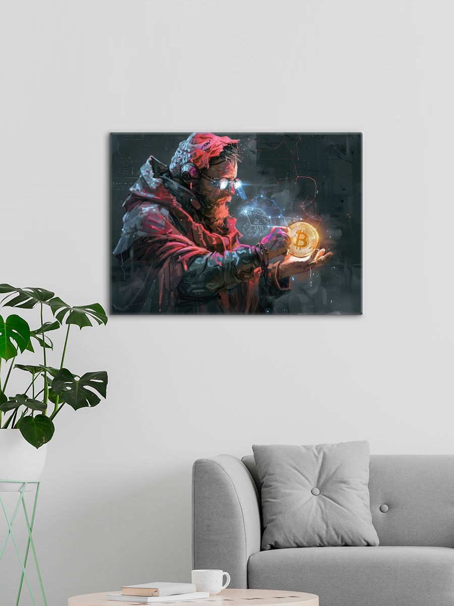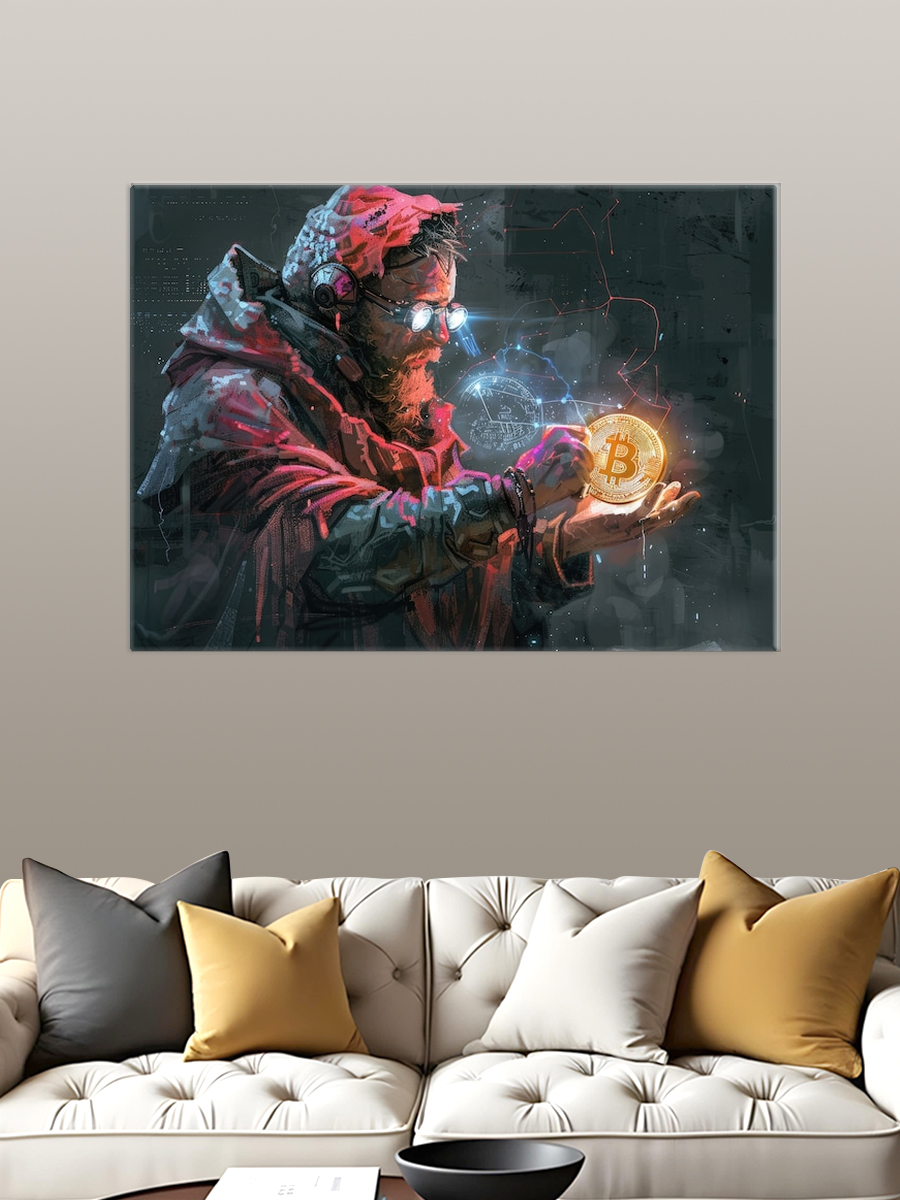 Описание: Картина 50 на 70 "Виртуальная реальность" изображает человека, смотрящего на свой запястье, на котором отображается символ биткойна. Основная идея картины заключается в сочетании технологий и финансового мира, символизируя будущее и инновации. Уникальность этой работы заключается в ее способности передавать стремление человека к новому, к цифровым возможностям и независимости. При взгляде на картину возникает ощущение современности и динамики. Она вызывает чувства надежды и уверенности в будущем, а также побуждает к размышлениям о том, как технологии меняют нашу жизнь. Этот визуальный месседж станет отличным дополнением к любому интерьеру, создавая атмосферу прогресса и вдохновения. Картина идеально подойдёт для офисного пространства, где она будет напоминать о важности инноваций и технологического прогресса. Также она станет прекрасным акцентом в современном интерьере гостиной или кабинета, добавляя в него нотку креативности и оригинальности. Не упустите возможность украсить своё пространство этой уникальной картиной!
