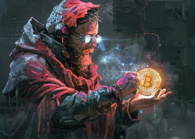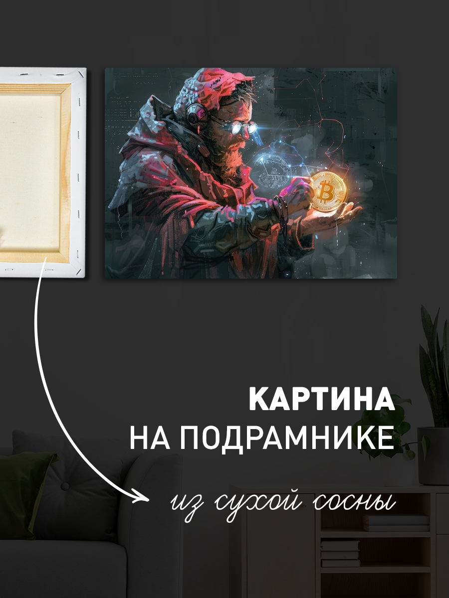 Описание: Картина 50 на 70 "Цифровой алхимик" представляет собой захватывающее изображение современного человека, погруженного в мир криптовалюты. На картине изображен мужчина с бородой в капюшоне, который держит золотую монету биткойна, окруженный таинственными цифровыми символами и потоками энергии. Эта работа передает уникальную идею о слиянии технологий и человеческой природы, а также о новых возможностях, которые открывает цифровая экономика. Картина вызывает чувство удивления и вдохновения, погружая зрителя в атмосферу таинственного мира криптовалют. Она заставляет задуматься о будущем, о том, как технологии могут изменить нашу жизнь и повседневность. Эмоции, которые она вызывает, могут стать отличным дополнением к любому интерьеру, создавая ощущение динамики и современности. Эта картина идеально подойдет для интерьеров в стиле техно, лофта или хай-тек, а также для рабочего пространства, где она будет вдохновлять на новые идеи и свершения. Она может занять центральное место в гостиной, офисе или комнате для творчества, привнося в пространство нотку загадки и современности. "Цифровой алхимик" станет не только стильным акцентом, но и источником вдохновения для тех, кто ценит искусство и технологии.