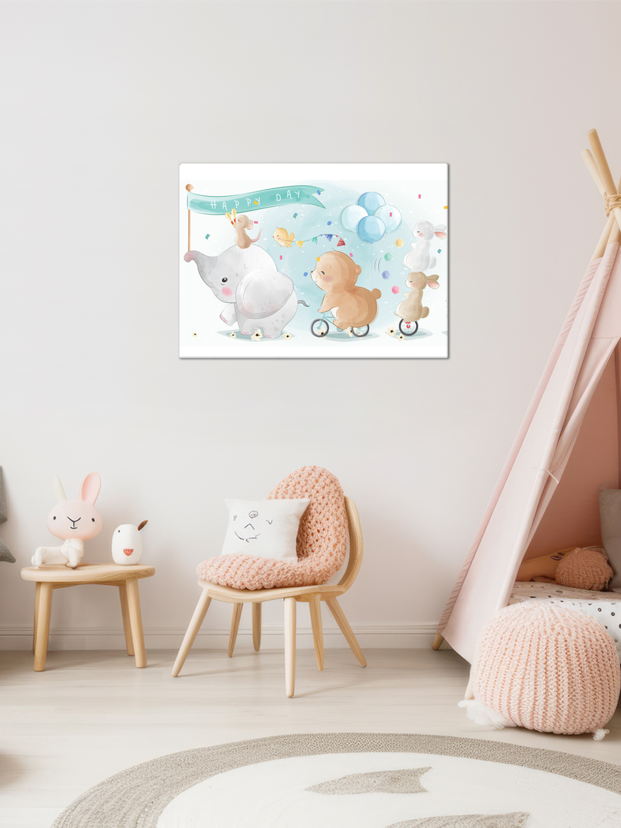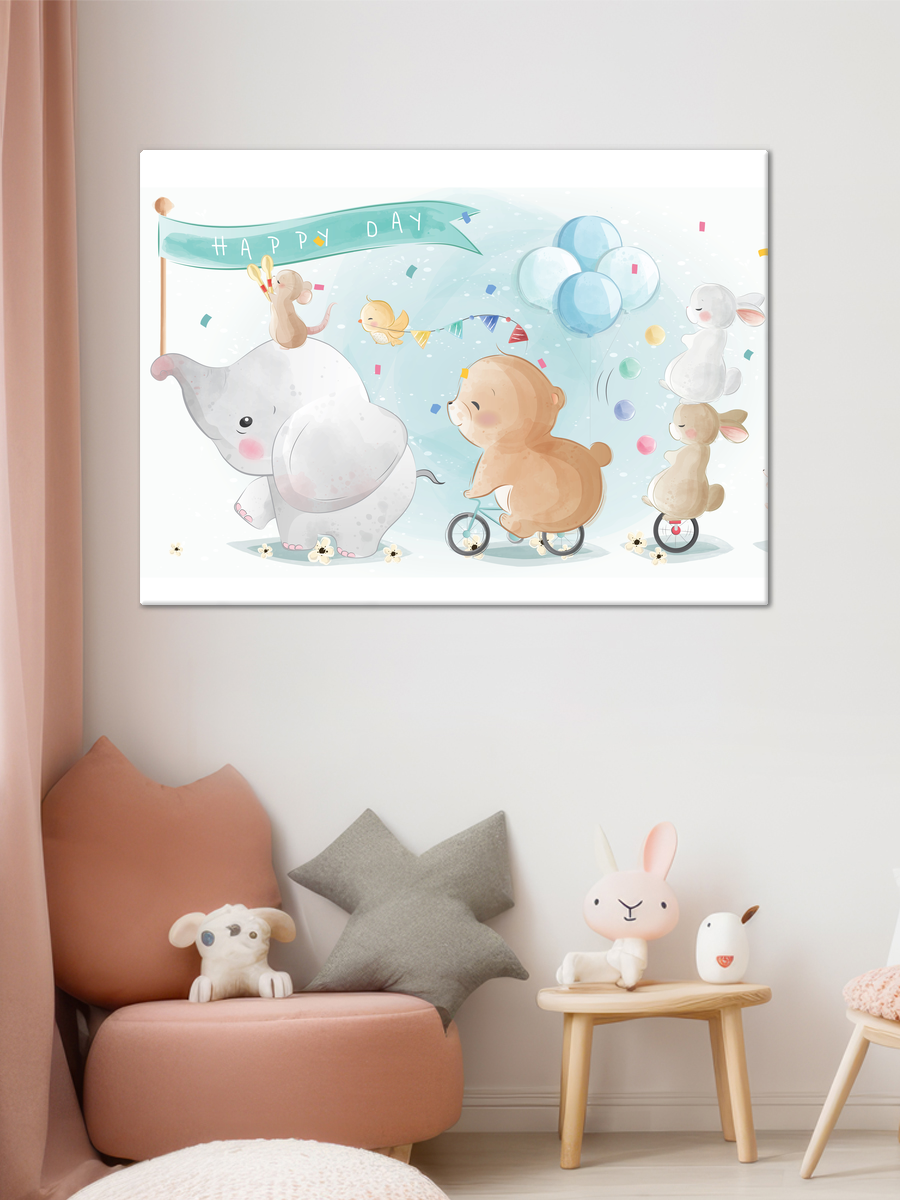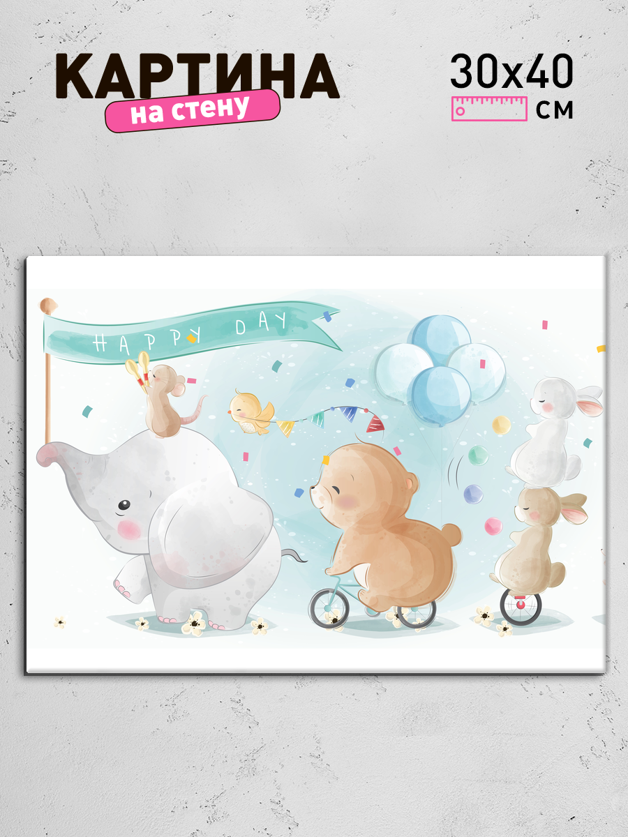 Описание: Картина 50 на 70 "Счастливый день" изображает веселую сцену с милыми животными, которые празднуют вместе. В центре композиции находится симпатичный слон, на спине которого расположился любопытный мышонок, держащий в руках праздничные хлопушки. Рядом с ними забавный медвежонок катается на велосипеде, а на заднем плане — пушистые зайцы и яркие воздушные шары, создающие атмосферу радости и веселья. Эта картина вызывает теплые чувства и поднимает настроение, напоминая о беззаботных днях детства и праздниках с близкими. Яркие цвета и игривые персонажи создают ощущение счастья и легкости, делая её идеальным дополнением для любого интерьера. "Счастливый день" прекрасно впишется в детскую комнату, добавляя в пространство радостные ноты, или станет замечательным акцентом в гостиной, где соберутся друзья и семья. Также картина может стать великолепным подарком для маленького человека или родителей, желающих украсить пространство своего малыша. Эта уникальная работа не только украсит ваш дом, но и подарит позитивные эмоции, делая каждый день особенным.