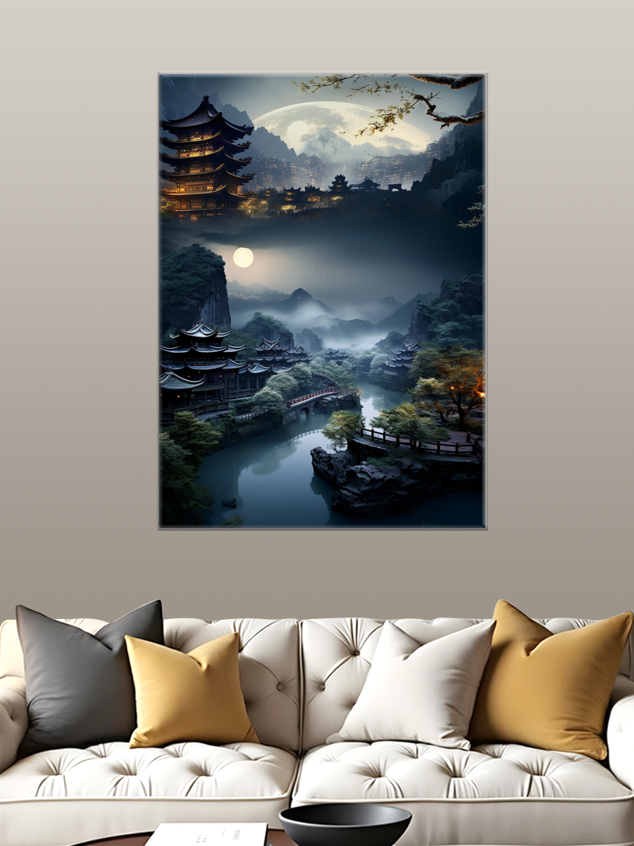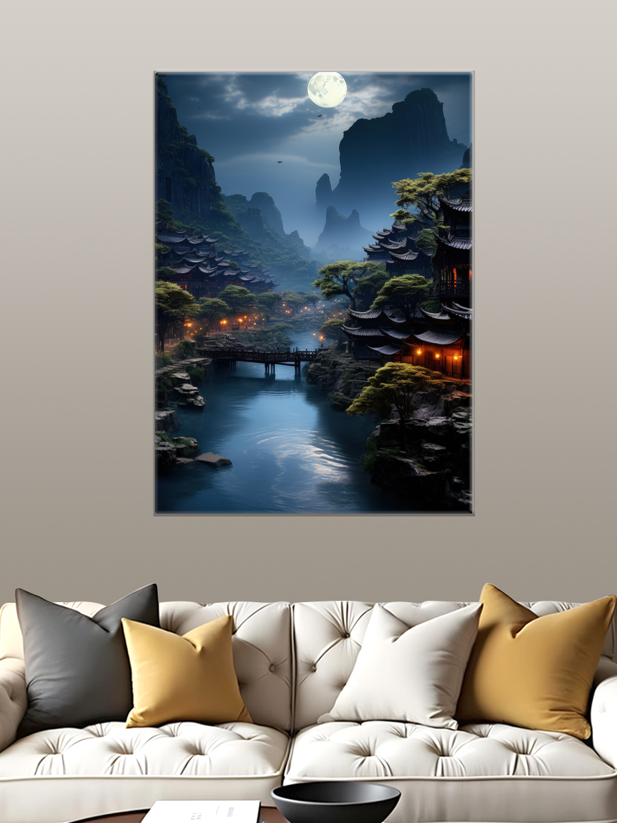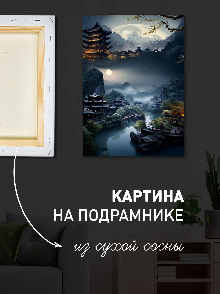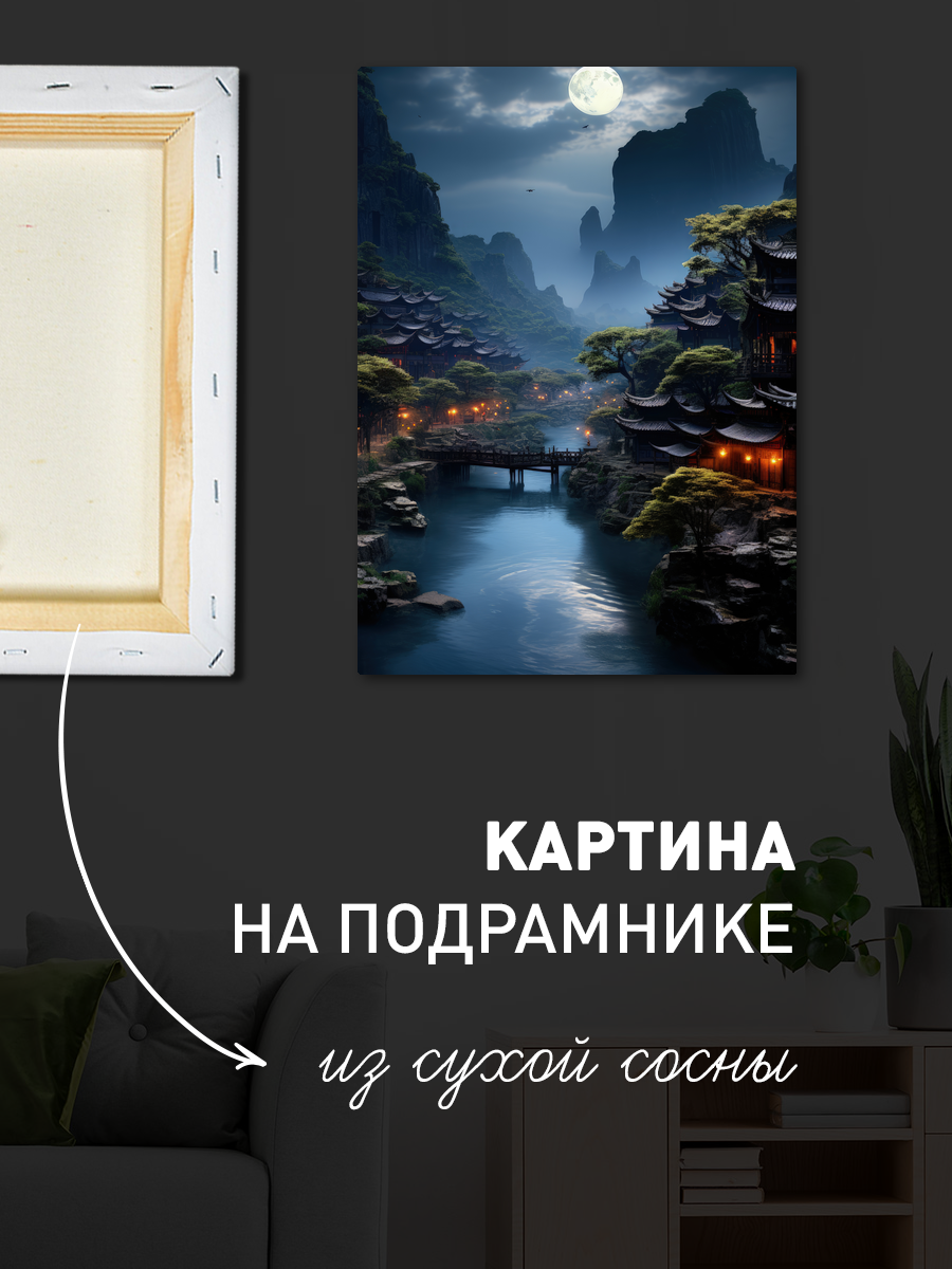 Описание: Картина 50 на 70 "Ночной пейзаж" запечатлевает завораживающий вид на горный ландшафт, утопающий в лунном свете. На переднем плане изображены традиционные восточные постройки, окруженные зелеными деревьями и извивающейся рекой, отражающей свет луны. Высокие горы на заднем плане создают величественный контраст с спокойствием водной глади. Эта картина уникальна своей способностью передать атмосферу спокойствия и умиротворения, приглашая зрителя в мир мечты и вдохновения. Каждый элемент картины вызывает глубокие эмоции: от ощущения гармонии с природой до желаемого уединения. Нежные оттенки зеленого и синего создают успокаивающую палитру, которая помогает отвлечься от повседневной суеты. Ваша комната наполнится уютом и магией, когда вы будете любоваться этой картиной, представляя себе вечерние прогулки по умиротворяющим пейзажам. "Ночной пейзаж" идеально впишется в любой интерьер, будь то спальня, кабинет или гостиная. Она станет центром внимания, привлекая взгляды гостей и создавая атмосферу спокойствия. Повесьте ее над диваном или в уголке вашего уютного пространства, и вы ощутите, как каждый взгляд на картину наполняет вас вдохновением и умиротворением. Это не просто картина, это окно в мир, где природа и искусство сливаются воедино.
