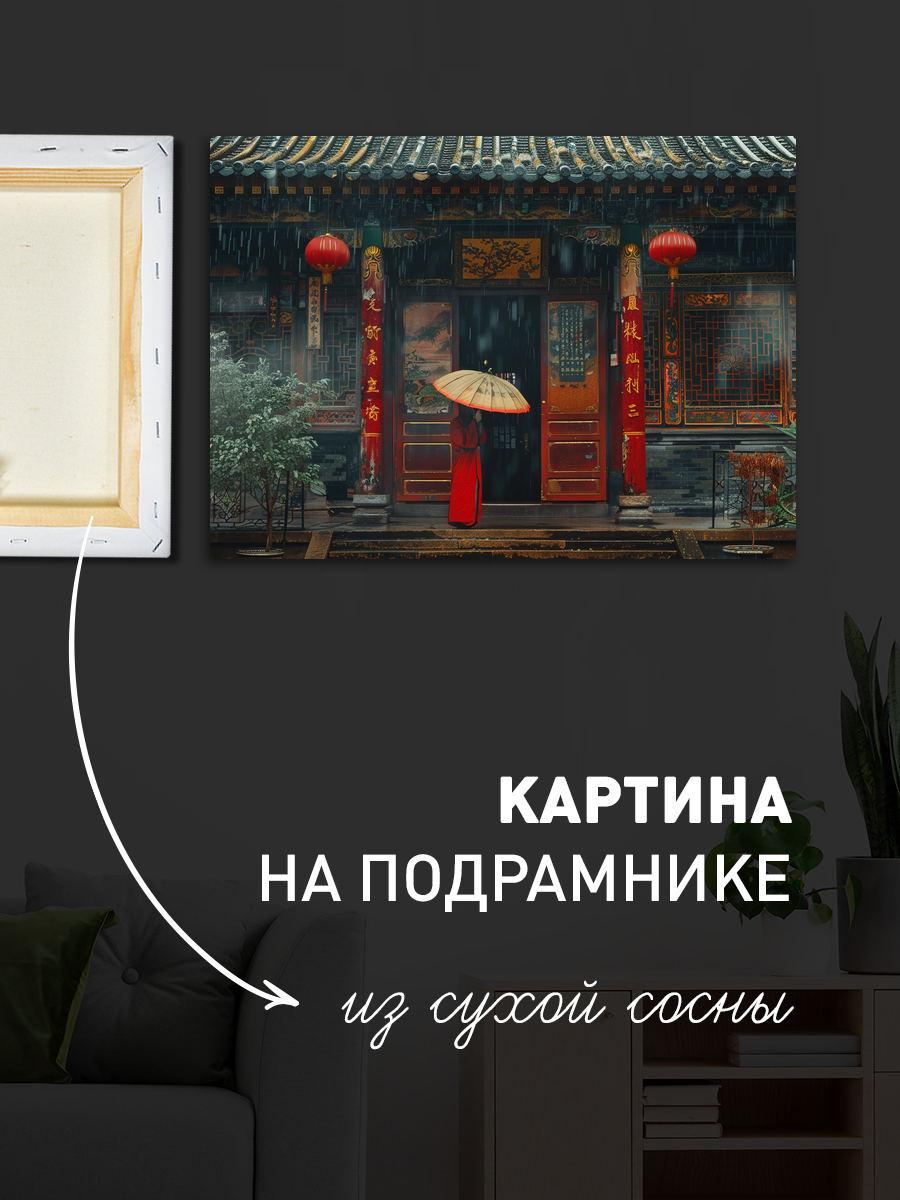 Описание: Картина 50 на 70 "Тайна восточного храма" погружает зрителя в атмосферу загадочного востока. На ней изображена женщина в красном одеянии, стоящая под зонтом у входа в старинный храм, окруженный зелеными растениями и сверкающими красными фонарями. Уникальность этой картины заключается в ее способности передать не только красоту архитектуры, но и глубокую связь человека с природой и культурой. Эта работа вызывает ощущение покоя и умиротворения, словно приглашая вас в путешествие к внутреннему спокойствию. Взгляд на картину может вызвать ностальгию по уединению и моментам размышлений, а также желание исследовать неизведанное. "Тайна восточного храма" идеально впишется в любой интерьер, будь то уютная гостиная, стильный офис или спальня, создавая атмосферу тепла и гармонии. Она станет отличным акцентом на стене, добавляя изысканности и оригинальности вашему пространству. Эта картина станет не только украшением, но и источником вдохновения для тех, кто ценит искусство и стремится к внутреннему балансу.