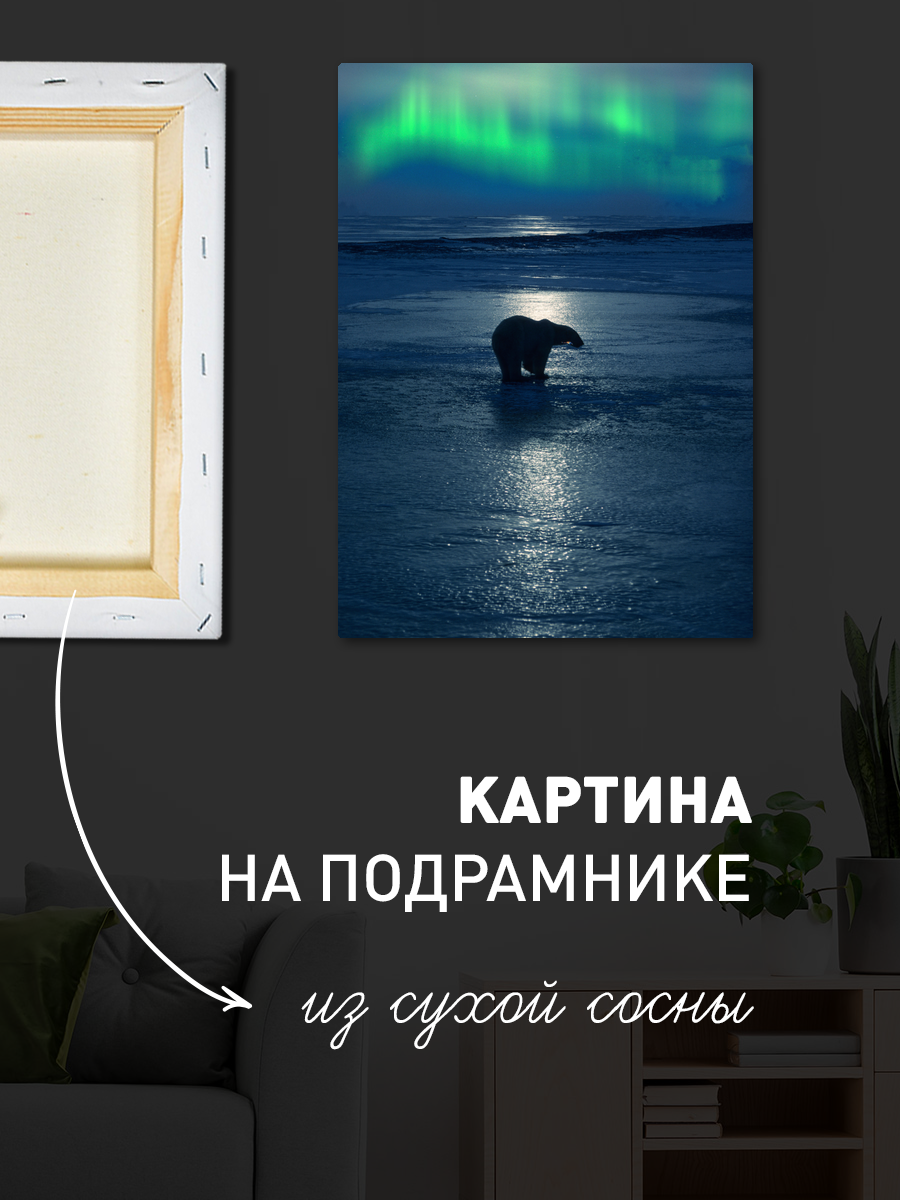 Описание: Картина 50 на 70 'Полярная ночь'. На этом великолепном холсте изображен величественный белый медведь, одиноко стоящий на льду под завораживающими огнями северного сияния. Основная идея картины – показать красоту и уязвимость дикой природы в суровых условиях Арктики. Уникальность этой работы заключается в контрасте между темными оттенками моря и яркими цветами северного сияния, что создает ощущение магии и волшебства. Картина вызывает глубокие эмоции: она наполняет зрителя чувством спокойствия и восхищения, а также напоминает о важности сохранения природы. 'Полярная ночь' станет идеальным акцентом для любого интерьера: от современного минимализма до уютного скандинавского стиля. Она прекрасно впишется в гостиную, кабинет или спальню, добавляя в пространство атмосферу умиротворения и вдохновения. Эта картина не только украсит ваш дом, но и станет источником разговоров и размышлений, позволяя каждому, кто на неё взглянет, погрузиться в мир дикой природы и её загадок.