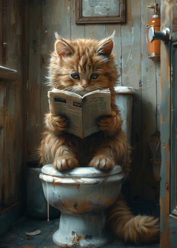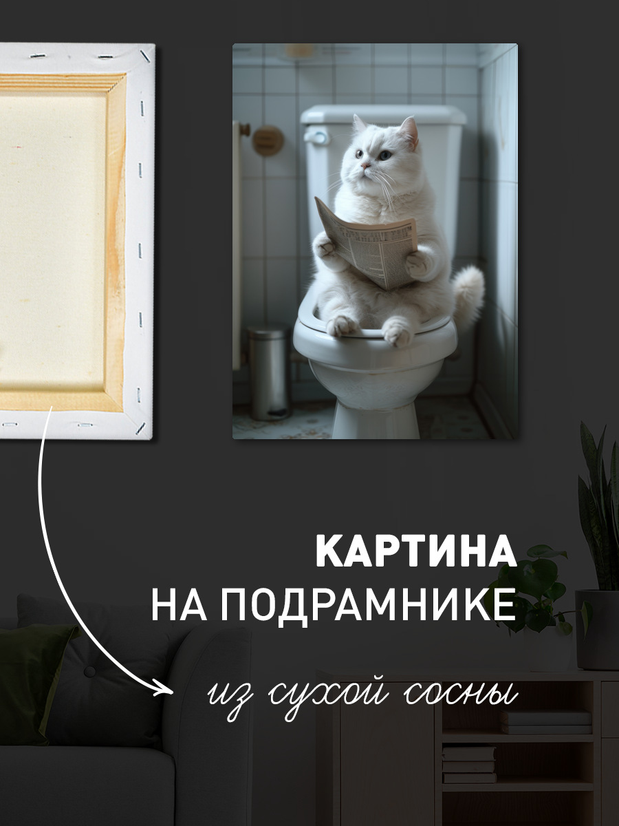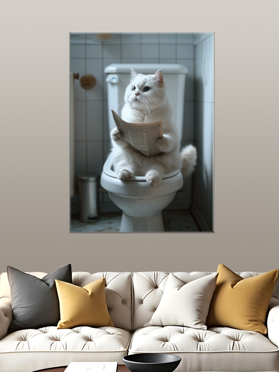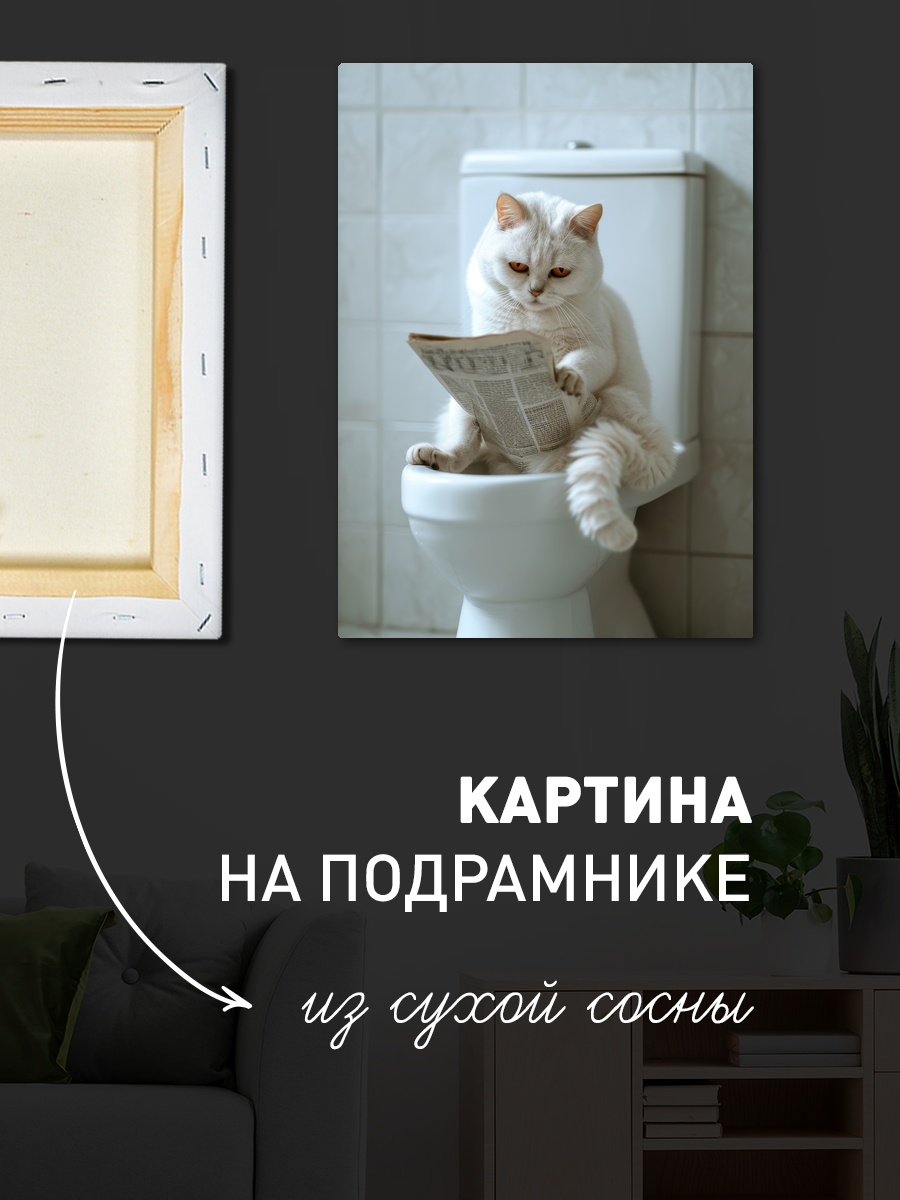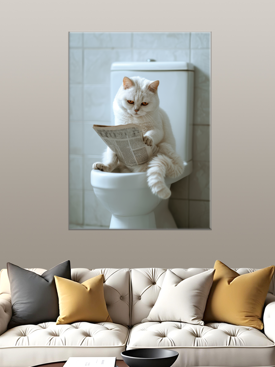 Описание: Картина 50 на 70 'Кошка с газетой' изображает игривую белую кошку, удобно устроившуюся на унитазе, внимательно читающую газету. Эта уникальная работа привлекает внимание своим юмором и игривостью, создавая атмосферу легкости и веселья в вашем доме. Кошка, с выразительными оранжевыми глазами, словно погружена в мир новостей, что вызывает улыбку у каждого, кто на нее смотрит. Эмоции, которые вызывает эта картина, — это радость и умиротворение. Она добавляет немного игривости и тепла в любую обстановку, идеально подходя для создания уютного уголка в вашем доме. Представьте, как она будет радовать вас и ваших гостей, привнося в интерьер нотку оригинальности и шутливости. Эта картина станет великолепным акцентом в ванной комнате, туалете или даже в кухне. Благодаря своим светлым и нейтральным оттенкам, она гармонично впишется в любой интерьер — от современного до классического — и украсит пространство, добавляя ему индивидуальности. 'Кошка с газетой' — это не просто картина, это элемент, который оживит ваш дом и поднимет настроение каждый день.