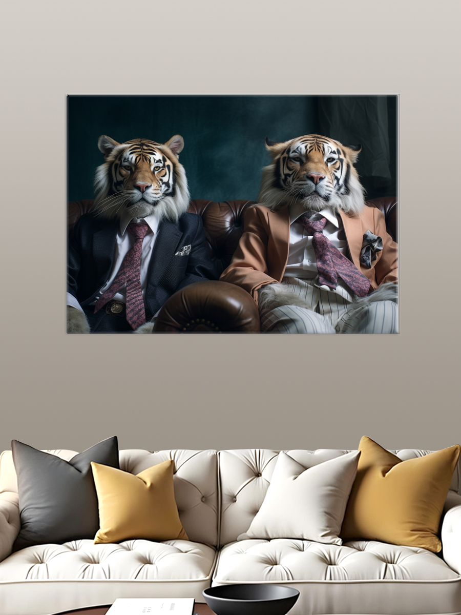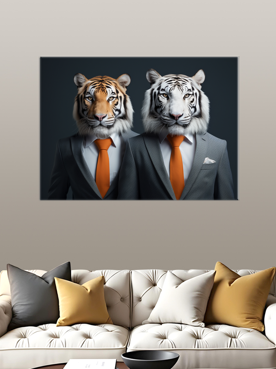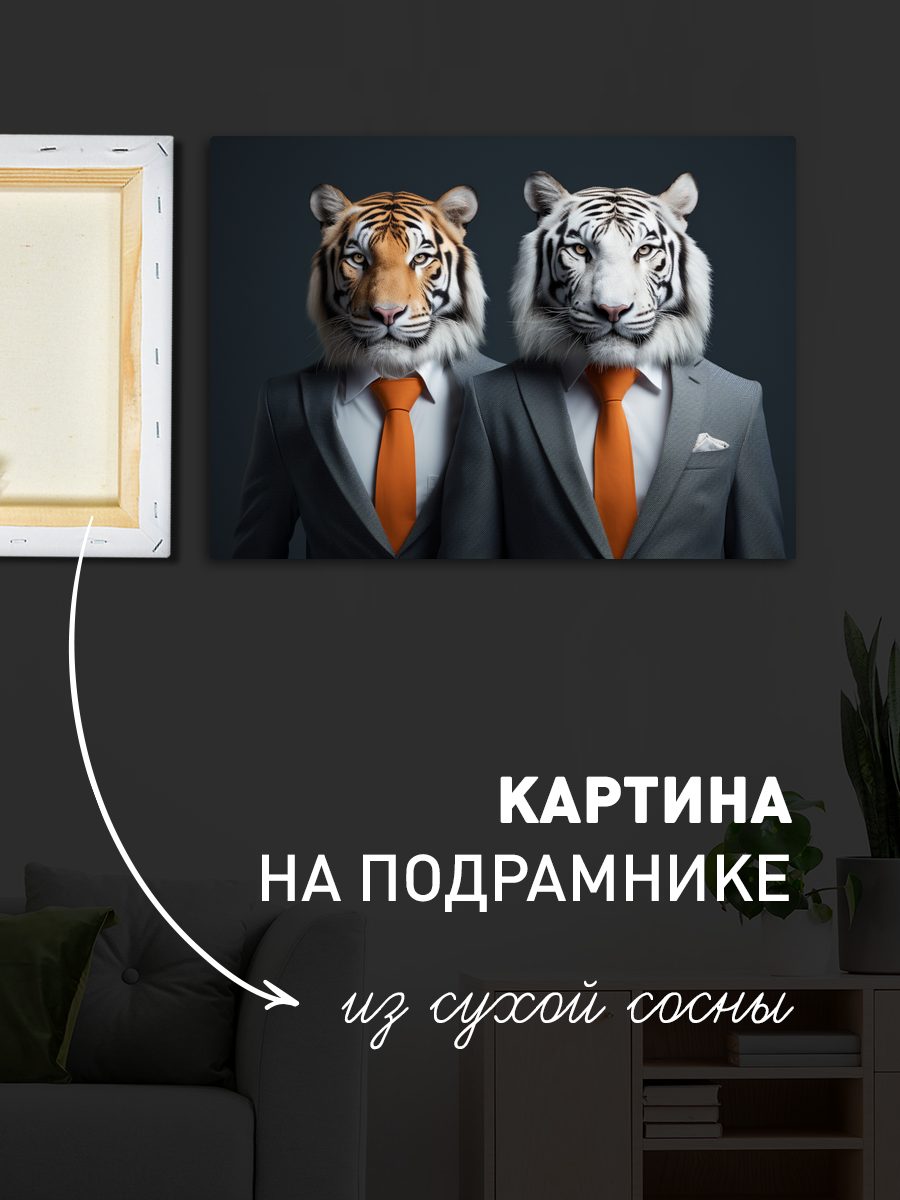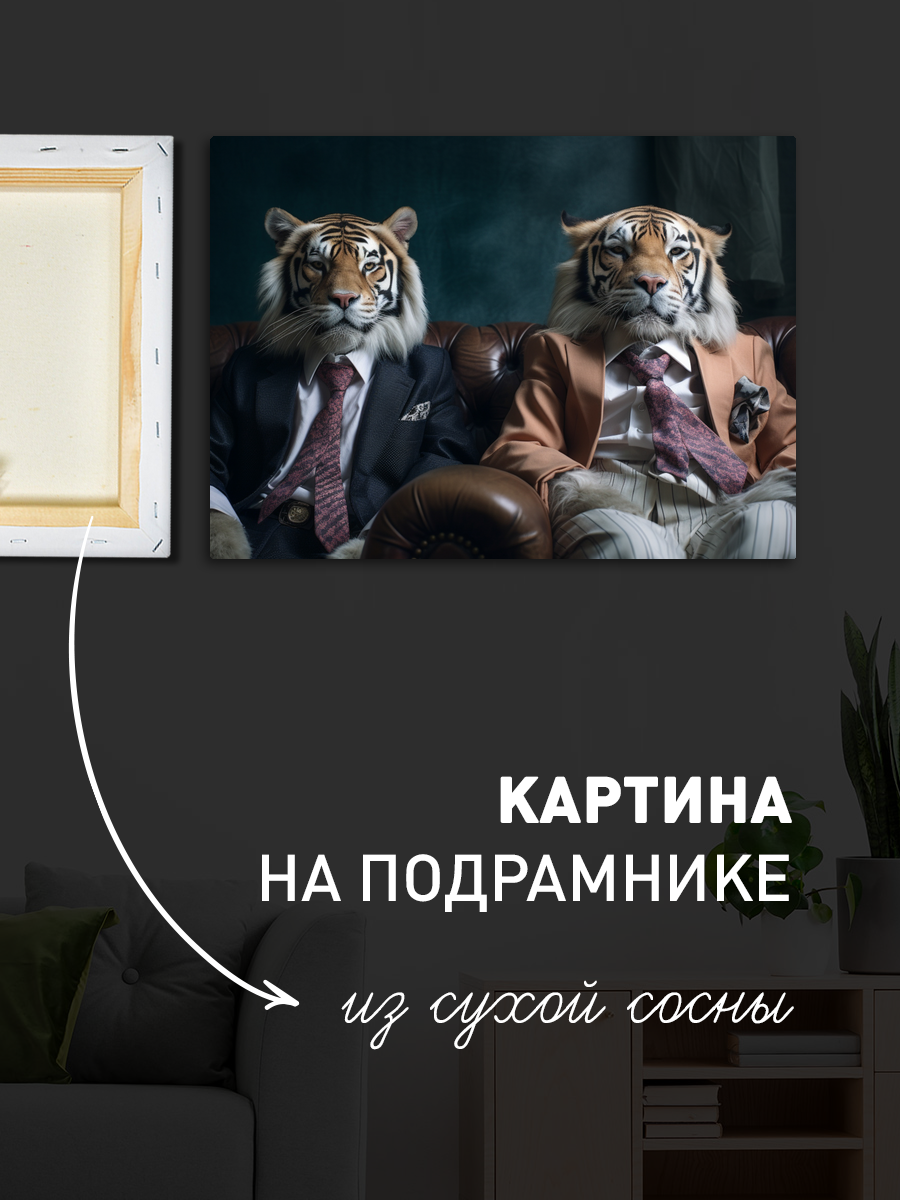 Описание: Картина 50 на 70 "Тигры в костюмах" - это уникальное произведение искусства, которое объединяет дикие инстинкты и элегантность. На картине изображены два тигра, каждый из которых носит строгий деловой костюм. Один тигр имеет привычный оранжево-черный окрас, в то время как второй представляет собой редкий белый тигр. Эта картина создает интригующий контраст между дикой природой и миром бизнеса, подчеркивая парадокс, который вызывает восхищение и смех. Эмоции, которые вызывает данное произведение, трудно выразить словами: это смесь силы, грации и юмора. Зритель может ощутить, как дикая природа проникает в человеческий мир, вызывая улыбку и заставляя задуматься о гармонии между двумя мирами. Эта картина станет идеальным акцентом для современных интерьеров: она отлично подойдет как для офисного пространства, так и для жилых комнат или креативных студий. Вы можете повесить её над диваном, в кабинете или в зоне ожидания, где она будет привлекать внимание и вдохновлять на новые идеи. "Тигры в костюмах" - это не просто картина, это разговорный объект, который добавит индивидуальности вашему пространству и станет источником вдохновения для вас и ваших гостей.