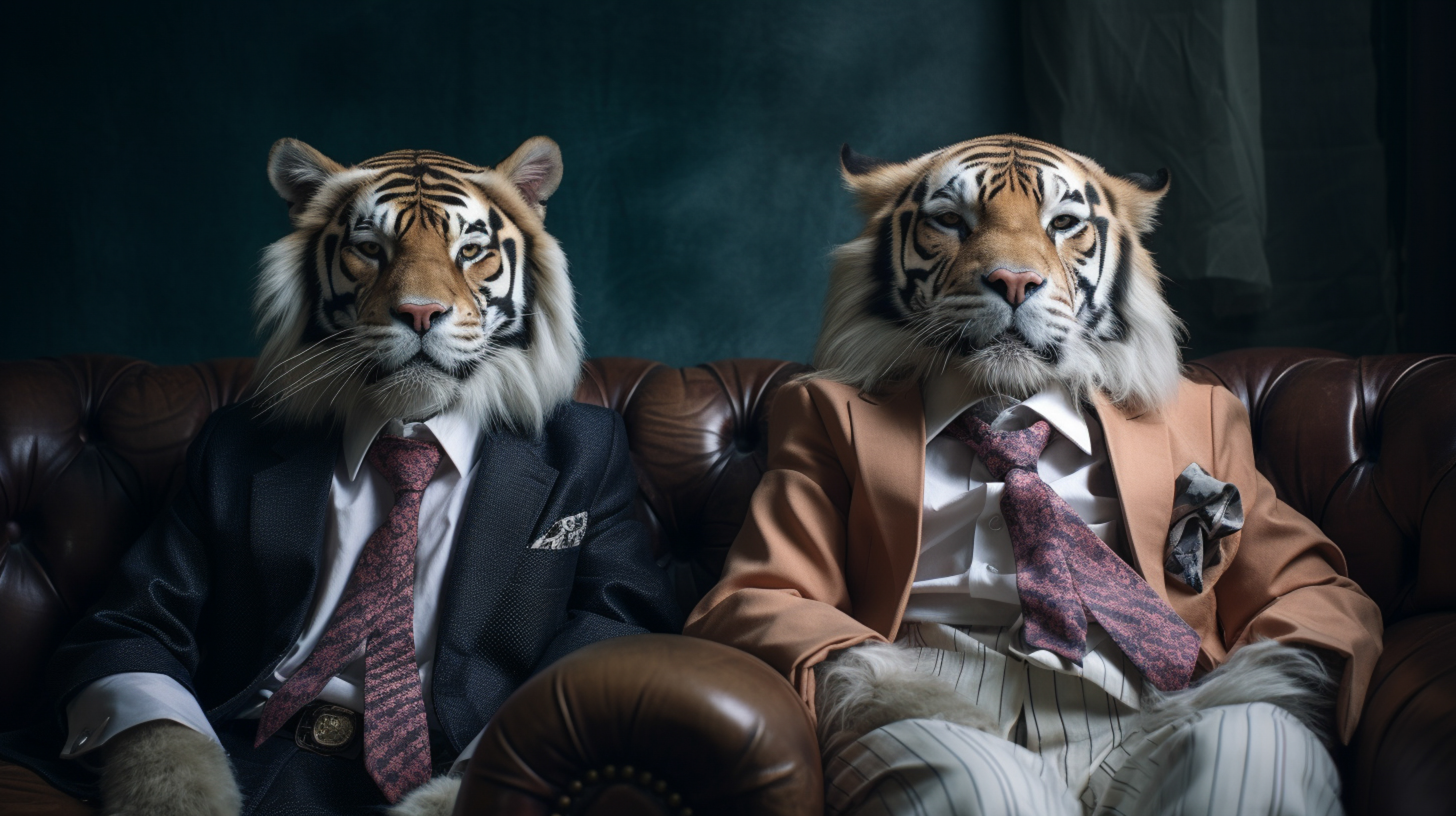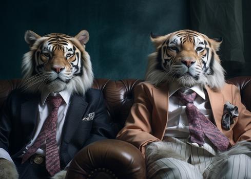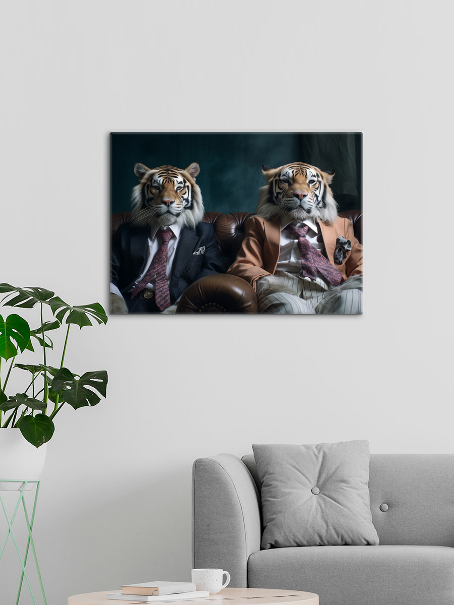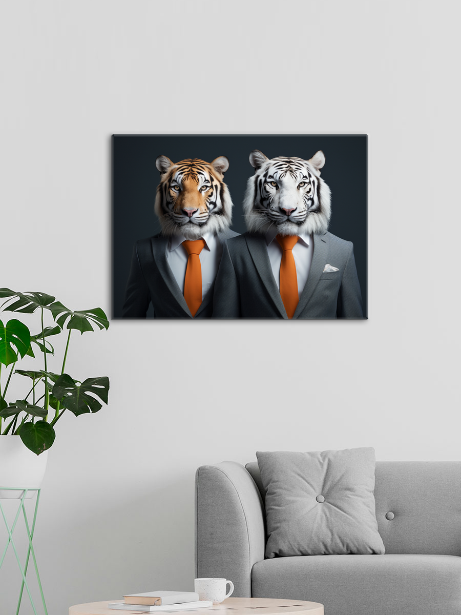 Описание: Картина 50 на 70 "Тигры в костюмах" - это уникальное произведение искусства, которое объединяет дикие инстинкты и элегантность. На картине изображены два тигра, каждый из которых носит строгий деловой костюм. Один тигр имеет привычный оранжево-черный окрас, в то время как второй представляет собой редкий белый тигр. Эта картина создает интригующий контраст между дикой природой и миром бизнеса, подчеркивая парадокс, который вызывает восхищение и смех. Эмоции, которые вызывает данное произведение, трудно выразить словами: это смесь силы, грации и юмора. Зритель может ощутить, как дикая природа проникает в человеческий мир, вызывая улыбку и заставляя задуматься о гармонии между двумя мирами. Эта картина станет идеальным акцентом для современных интерьеров: она отлично подойдет как для офисного пространства, так и для жилых комнат или креативных студий. Вы можете повесить её над диваном, в кабинете или в зоне ожидания, где она будет привлекать внимание и вдохновлять на новые идеи. "Тигры в костюмах" - это не просто картина, это разговорный объект, который добавит индивидуальности вашему пространству и станет источником вдохновения для вас и ваших гостей.