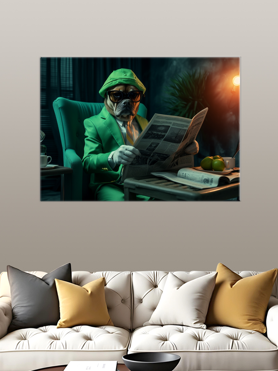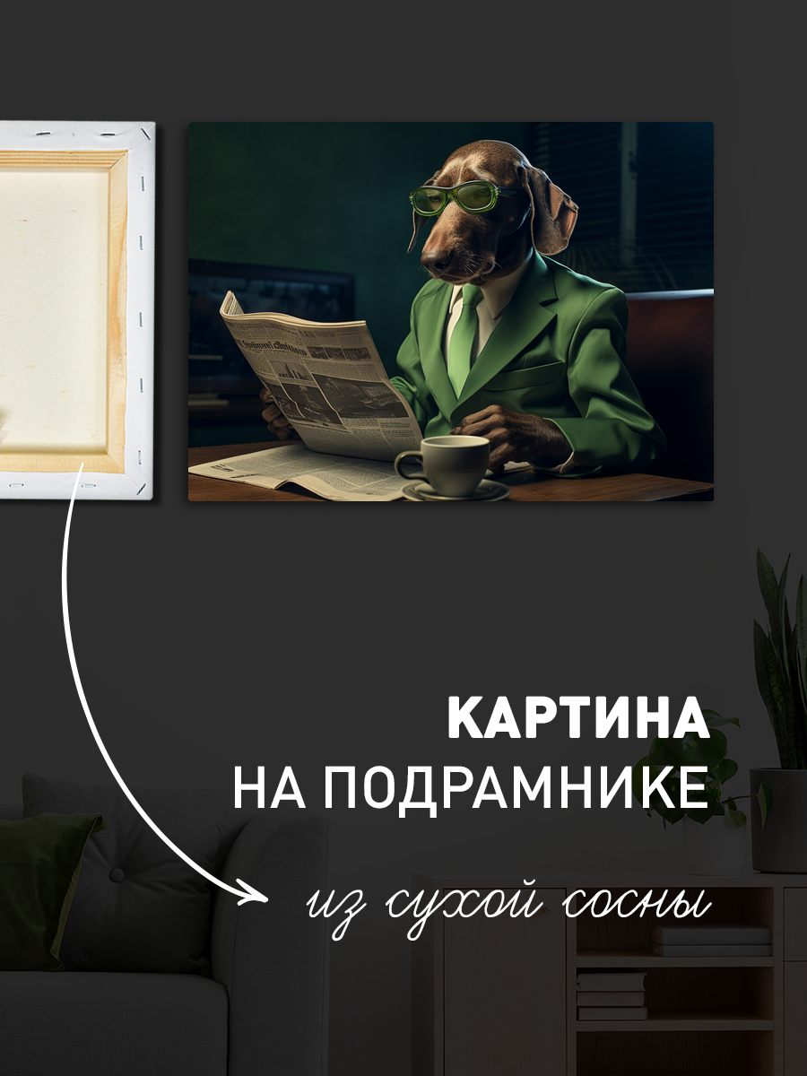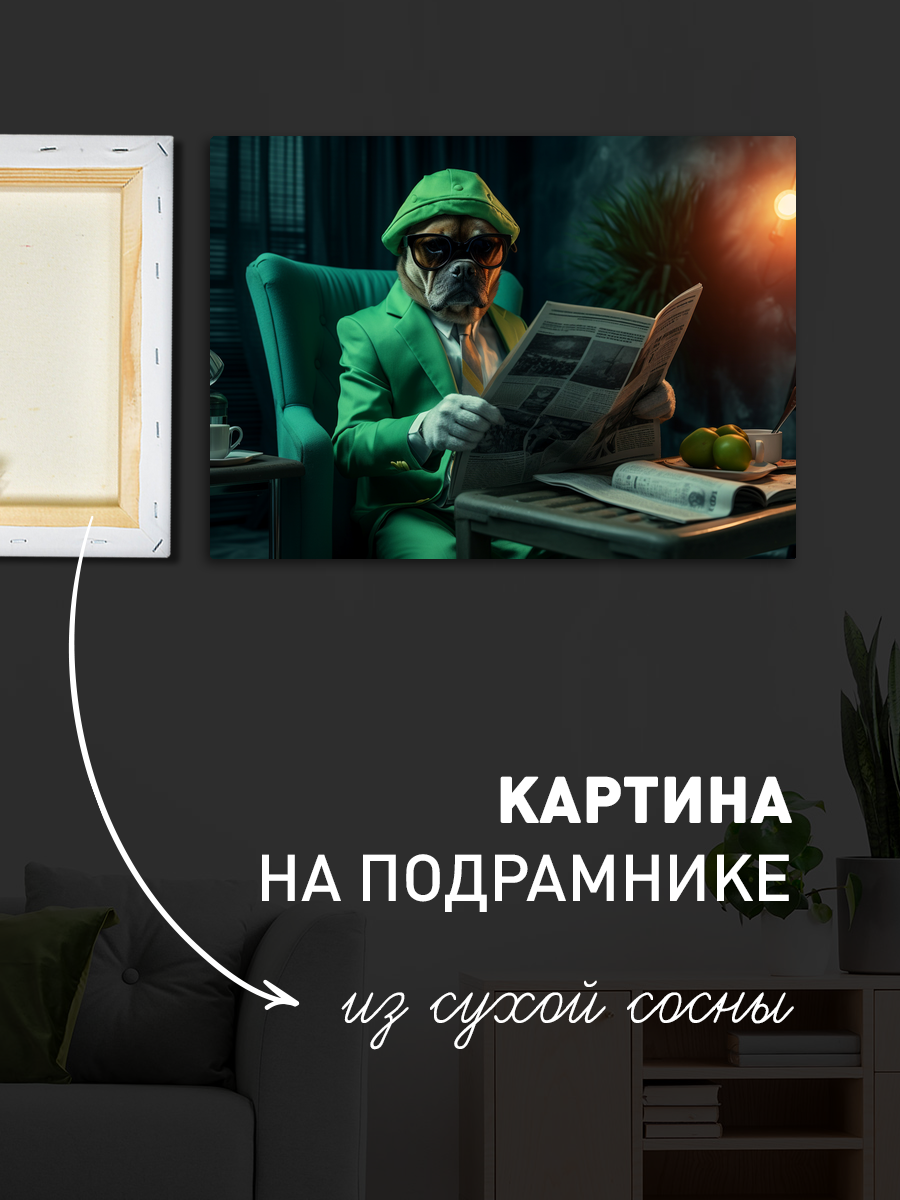 Описание: Картина 50 на 70 "Деловой Пес" изображает очаровательного пса в элегантном зеленом костюме, который уверенно читает газету, сидя в уютном кресле. Эта работа сочетает в себе элементы юмора и стиля, создавая уникальную атмосферу, где собака одета как истинный джентльмен. Уникальность картины заключается в её способности вызывать улыбку и поднимать настроение, ведь такое необычное изображение заставляет задуматься о том, как непривычно и весело может выглядеть привычный мир. Картина вызывает положительные эмоции, наполняя пространство теплом и игривостью. Она станет отличным акцентом в вашем интерьере, идеально вписываясь в современные гостиные, кабинеты или даже офисы, добавляя нотку оригинальности и уюта. Вы можете повесить её над диваном, в уголке для чтения или в любом месте, где хотите создать атмосферу легкости и хорошего настроения. Эта картина станет не просто элементом декора, а истинным произведением искусства, которое будет радовать вас и ваших гостей в течение многих лет.