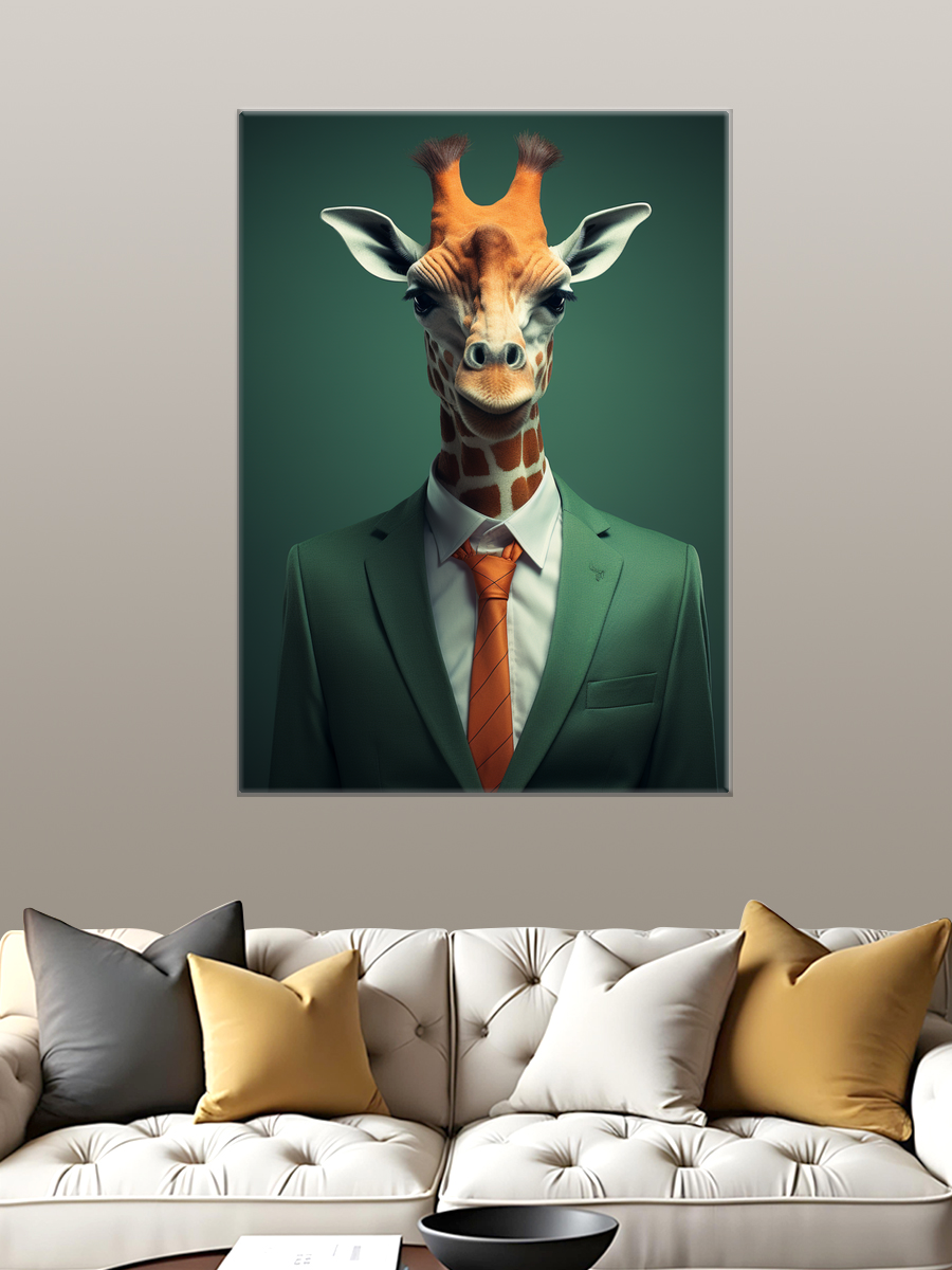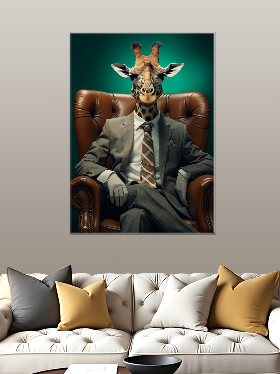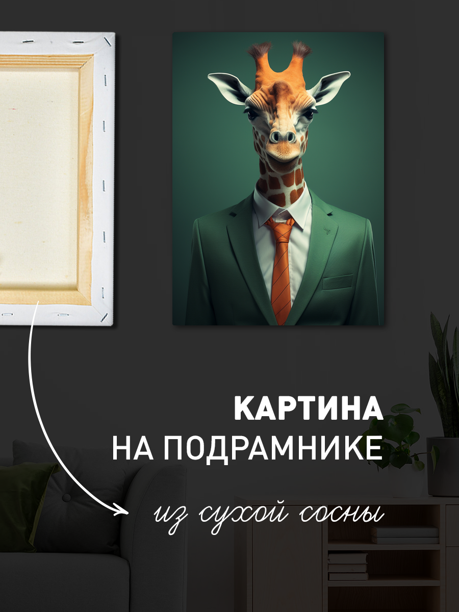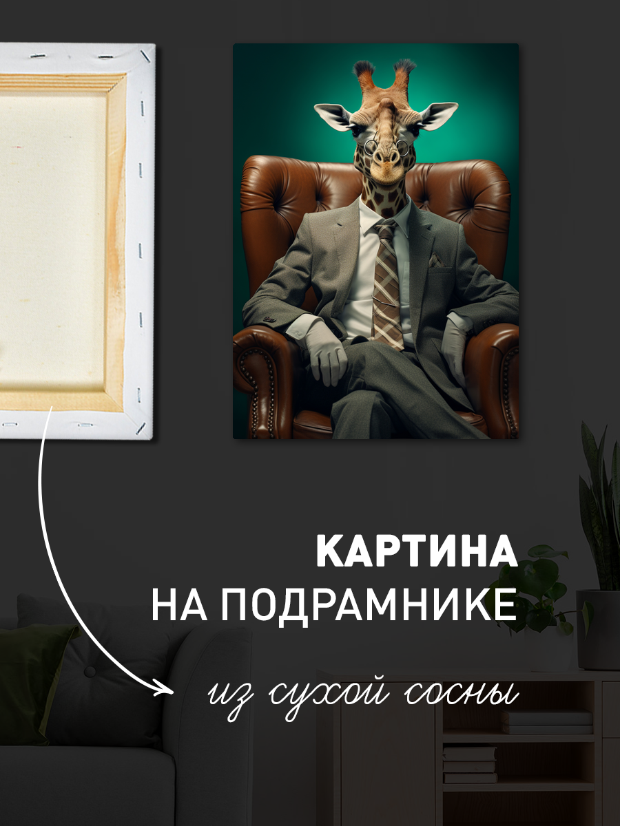 Описание: Картина 50 на 70 "Гигант в костюме" представляет собой уникальную и запоминающуюся композицию, на которой изображена жираф с человеческим обликом, облаченный в элегантный костюм и сидящий в роскошном кожаном кресле. Эта работа сочетает в себе элементы юмора и сюрреализма, приглашая зрителя задуматься о природе идентичности и о том, что значит быть "взрослым" в нашем мире. Работа вызывает улыбку и интерес, заставляя задуматься о контрастах между привычными человеческими особенностями и животной сущностью. Она наполнена игривостью и оригинальностью, что делает её отличным акцентом для любого интерьера, будь то офис, гостиная или даже кафе. Картина будет прекрасно смотреться на стене, где её смогут видеть гости, добавляя нотку креативности и стиля. Её уникальность и яркость делают её идеальным выбором для тех, кто ценит нестандартные решения в декоре и хочет внести в своё пространство что-то необычное. Эта работа не только украсит ваш интерьер, но и станет интересным поводом для обсуждений и приятных бесед.