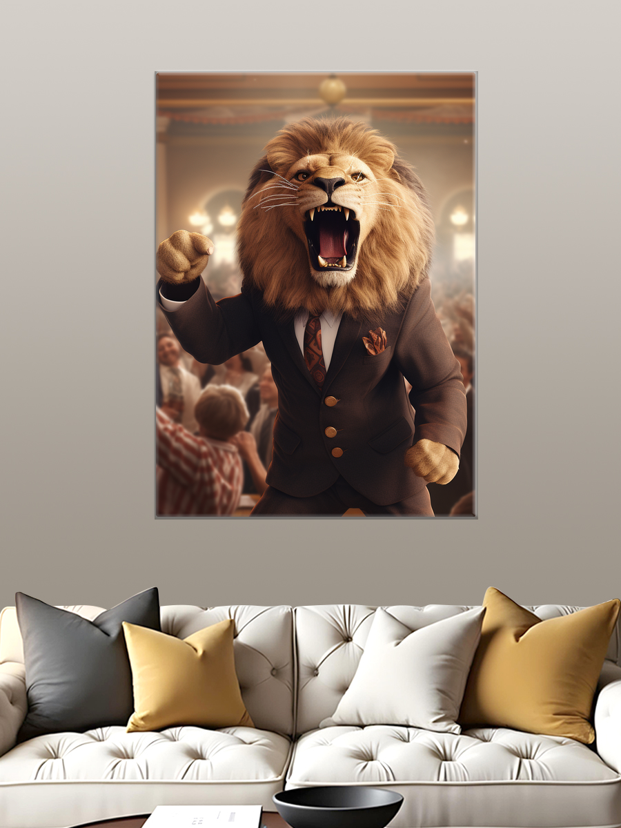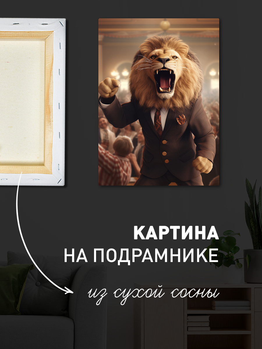 Описание: Картина 50 на 70 "Революция льва" изображает величественного льва, облаченного в элегантный костюм, с гордо поднятой головой и открытой пастью, как будто он призывает свою аудиторию к действию. Эта работа передает силу и уверенность, символизируя лидерство и смелость. Картина наполнена динамикой и энергией, вызывая чувства восхищения и вдохновения. Ее уникальность заключается в сочетании животного и человеческого образа, что создает интересный визуальный контраст. "Революция льва" пробуждает в зрителе стремление к переменам и решительности, что делает ее идеальным акцентом в любом интерьере. Она прекрасно впишется в офисное пространство, создавая атмосферу мотивации, или в гостиную, добавляя нотку оригинальности и стиля. Эмоциональная насыщенность картины делает ее идеальным подарком для тех, кто ценит искусство и стремится к вдохновению в повседневной жизни.
