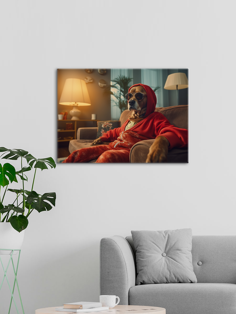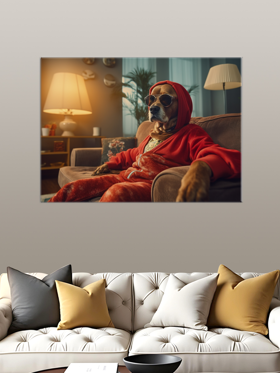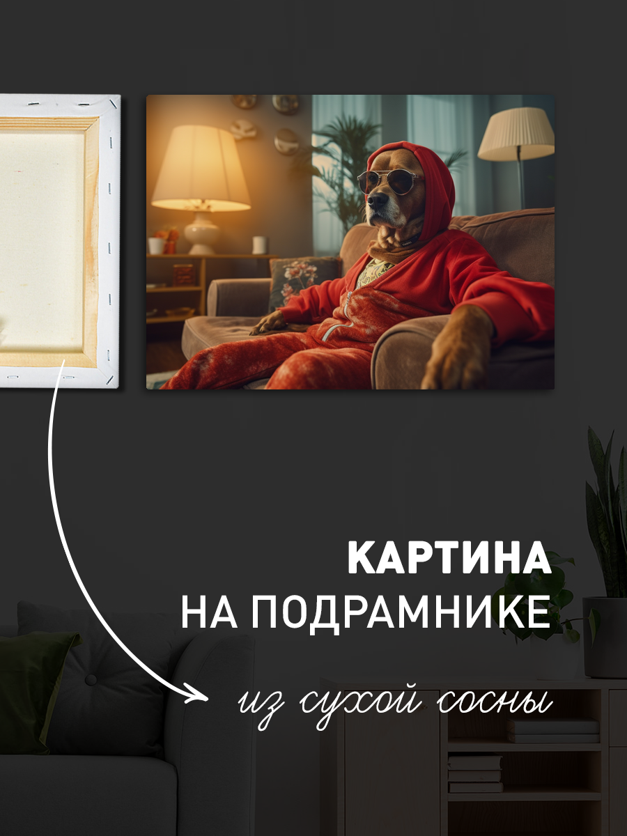 Описание: Картина 50 на 70 'Собака в красном'. На этом произведении искусства изображена очаровательная собака, расслабленно устроившаяся на диване в уютной комнате. Она одета в ярко-красный костюм и солнечные очки, что придает картине игривый и стильный вид. Уникальность этой картины заключается в сочетании комфорта и моды, что вызывает улыбку и поднимает настроение. Эта картина вызывает теплые чувства и умиротворение, напоминая о домашнем уюте и беззаботных моментах. Она способна привнести в вашу жизнь позитив и радость, создавая атмосферу дружелюбия и комфорта. Подойдет для интерьера в стиле модерн, скандинавском или арт-деко. Идеально будет смотреться в гостиной, кабинете или детской комнате, добавляя яркий акцент и настроение в любое пространство. Вешая эту картину на стену, вы не просто украшаете свой дом, но и создаете особую атмосферу, в которой будет приятно проводить время.