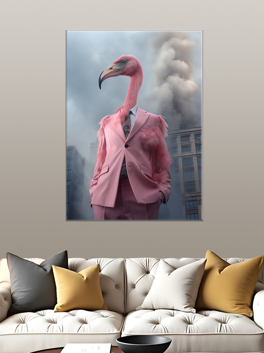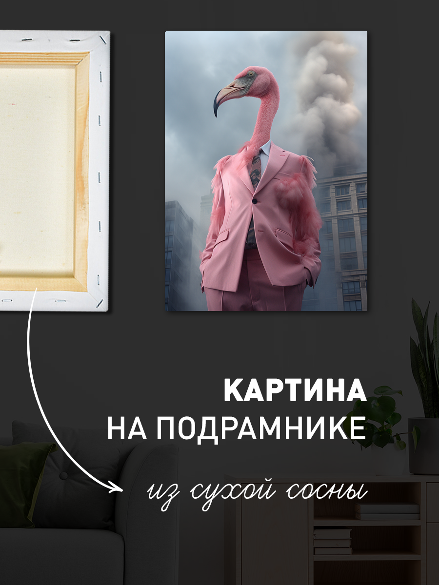 Описание: Картина 50 на 70 "Фламинго в костюме" представляет собой уникальное произведение искусства, где экзотическое существо в виде фламинго в розовом костюме контрастирует с дымным фоном современного города. Основная идея картины заключается в сочетании абсурда и элегантности, что вызывает у зрителя улыбку и удивление. Эта работа не только привлекает внимание, но и заставляет задуматься о том, как необычное может сосуществовать с обыденным. Картина вызывает целый спектр эмоций: от веселья до легкой ностальгии. Яркие цвета и оригинальный образ фламинго создают атмосферу легкости и игривости, наполняя пространство позитивной энергией. Она способна поднять настроение и стать центром притяжения в любом интерьере. Эта картина идеально впишется в современные интерьеры: от стильного лофта до уютной гостиной. Она будет отлично смотреться на стене в офисе, добавляя оригинальности и креативности в рабочее пространство. Также её можно повесить в детской комнате, где она создаст атмосферу игры и фантазии. "Фламинго в костюме" — это не просто картина, это настоящий акцент, который сможет преобразить любое пространство и стать предметом обсуждения среди гостей. Не упустите шанс добавить этот яркий и уникальный элемент в ваше пространство, который будет радовать глаз и вдохновлять на позитивные эмоции.
