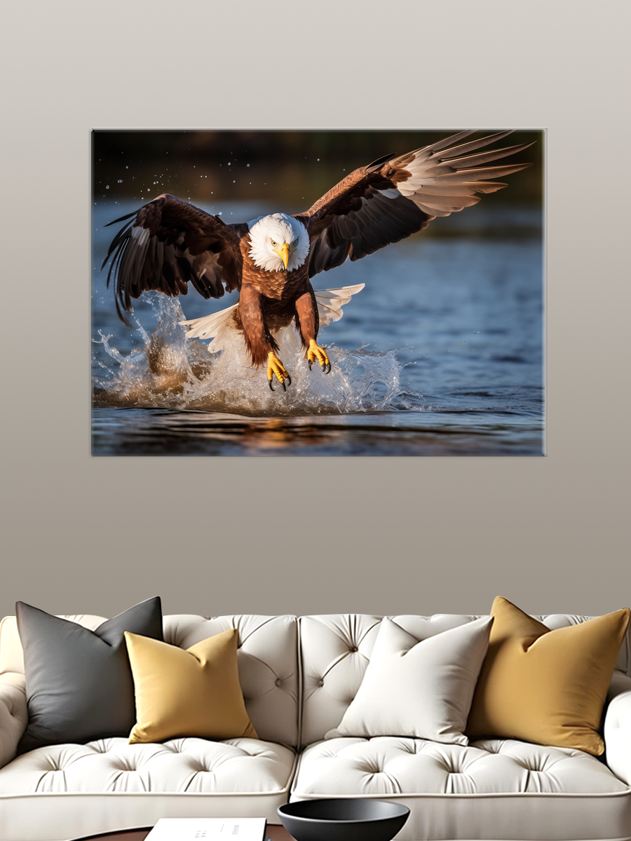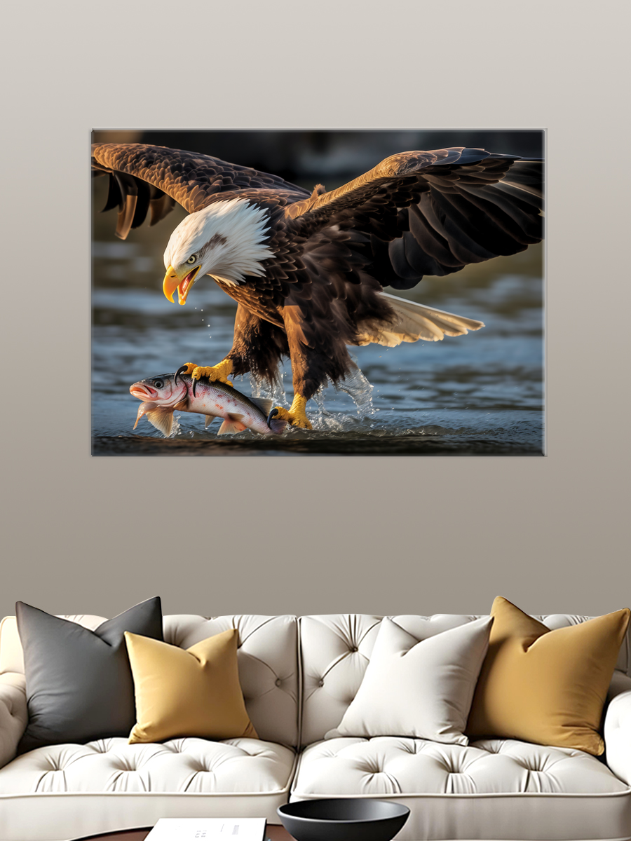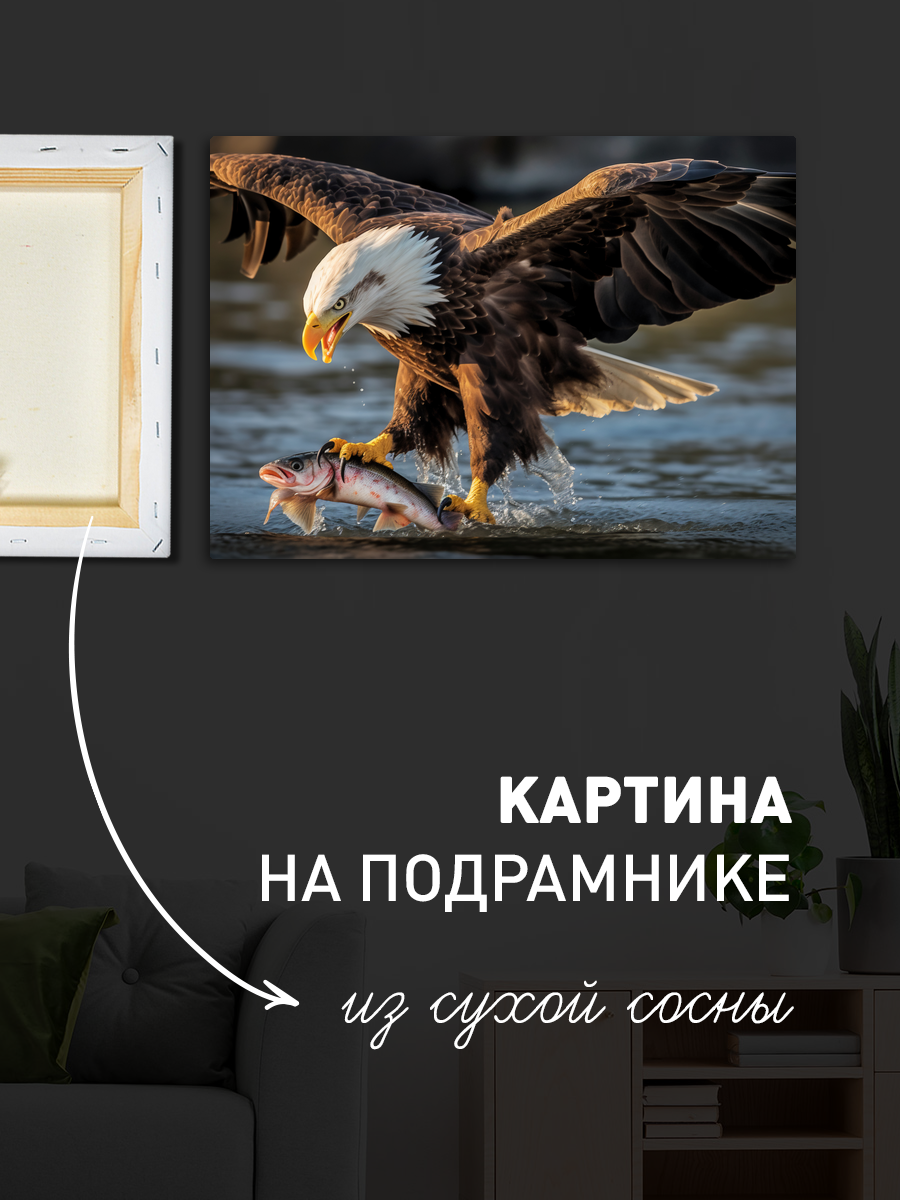 Описание: Картина 50 на 70 "Охота орла" изображает величественного орла, ловко пикирующего на свою добычу — рыбу. Эта сцена, наполненная динамикой и мощью природы, привлекает внимание зрителя и создает ощущение мгновения, застывшего во времени. Уникальность картины заключается в ее детализированном изображении орла с размахом его крыльев и водной поверхности, олицетворяющей мощь и грацию хищника. Эта картина вызывает широкий спектр эмоций: от восхищения силой природы до умиротворения, когда наблюдаешь за гармонией между хищником и его добычей. Она наполняет пространство ощущением свободы и величия, вдохновляя на размышления о красоте дикой природы и ее гармонии. "Охота орла" станет отличным дополнением для различных интерьеров. Она идеально впишется в комнаты, оформленные в стиле экостиля, где ценится естественность и близость к природе. Также картина будет прекрасно смотреться в кабинете, создавая атмосферу силы и решительности, или в гостиной, добавляя ей уникальности и характера. Повесьте ее над диваном или в коридоре, и каждый раз, проходя мимо, вы будете ощущать вдохновение и связь с природой.