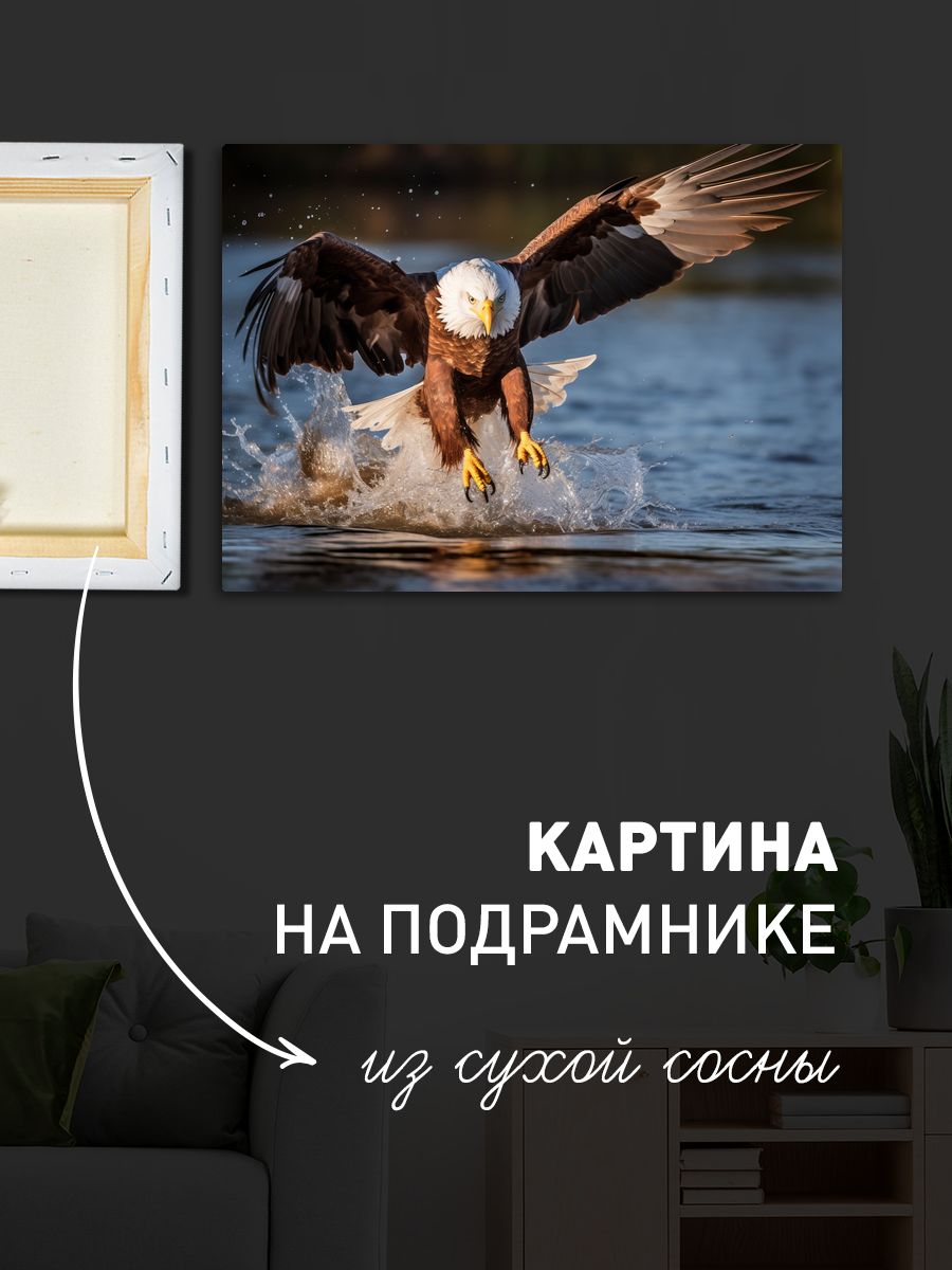 Описание: Картина 50 на 70 "Величие орла". Эта потрясающая картина изображает могучего орла в момент его охоты. Его изящные, расправленные крылья и ярко выраженные детали перьев создают ощущение динамики и силы. Уникальность этого произведения искусства заключается в мастерском сочетании ярких цветов и реалистичной передачи движения, что позволяет зрителю почувствовать мощь и грацию этого великолепного хищника. Каждый взгляд на картину наполняет душу эмоциями свободы и величия природы. Орел, вырывающийся из водной глади, словно символизирует стремление к высотам и непокорённым вершинам. Эта работа вдохновляет на новые достижения и отражает дух приключений. Вы сможете ощутить связь с природой и её красотой, находясь в своём доме. Картина идеально впишется в любой интерьер: от современного минимализма до классического стиля. Она станет замечательным акцентом в кабинете, студии или гостиной, привнося в пространство атмосферу силы и вдохновения. Разместив её на стене, вы не только украсите своё пространство, но и создадите уникальную атмосферу, которая будет вдохновлять вас и ваших гостей каждый день.