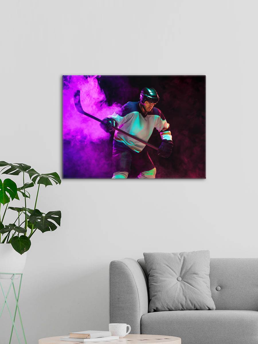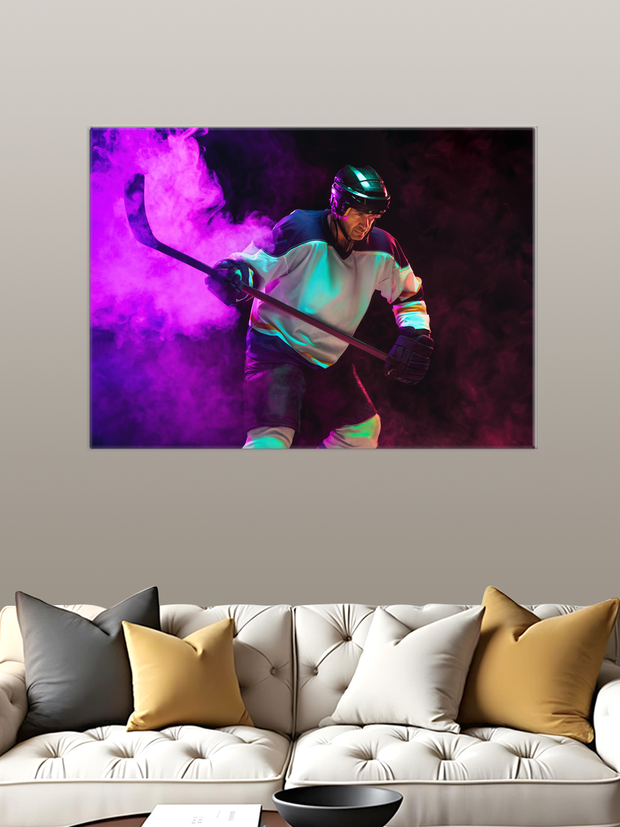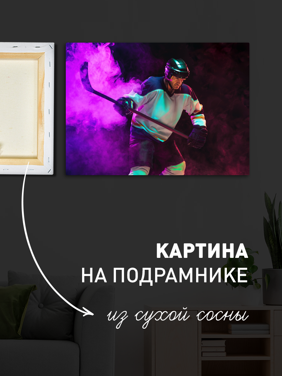 Описание: Картина 50 на 70 "Хоккейная страсть" изображает хоккеиста в динамичном движении на фоне завораживающих цветных облаков дыма. Основная идея картины заключается в передаче эмоций и напряжения, с которыми спортсмены выступают на льду. Яркие фиолетовые и голубые оттенки создают атмосферу энергии и драйва, что делает картину уникальной и запоминающейся. Каждый взгляд на эту работу вызывает чувство восторга и динамики, словно зритель сам оказывается на арене, переживая момент забивания гола. Картина способна вдохновить и поднять настроение, напоминая о страсти к спорту и победам. Эта картина идеально впишется в интерьер спортивного зала, домашнего кабинета или даже в гостиной, где она станет центром внимания. Она также будет отличным подарком для любителей хоккея и спорта в целом, добавляя яркие акценты в любое пространство.