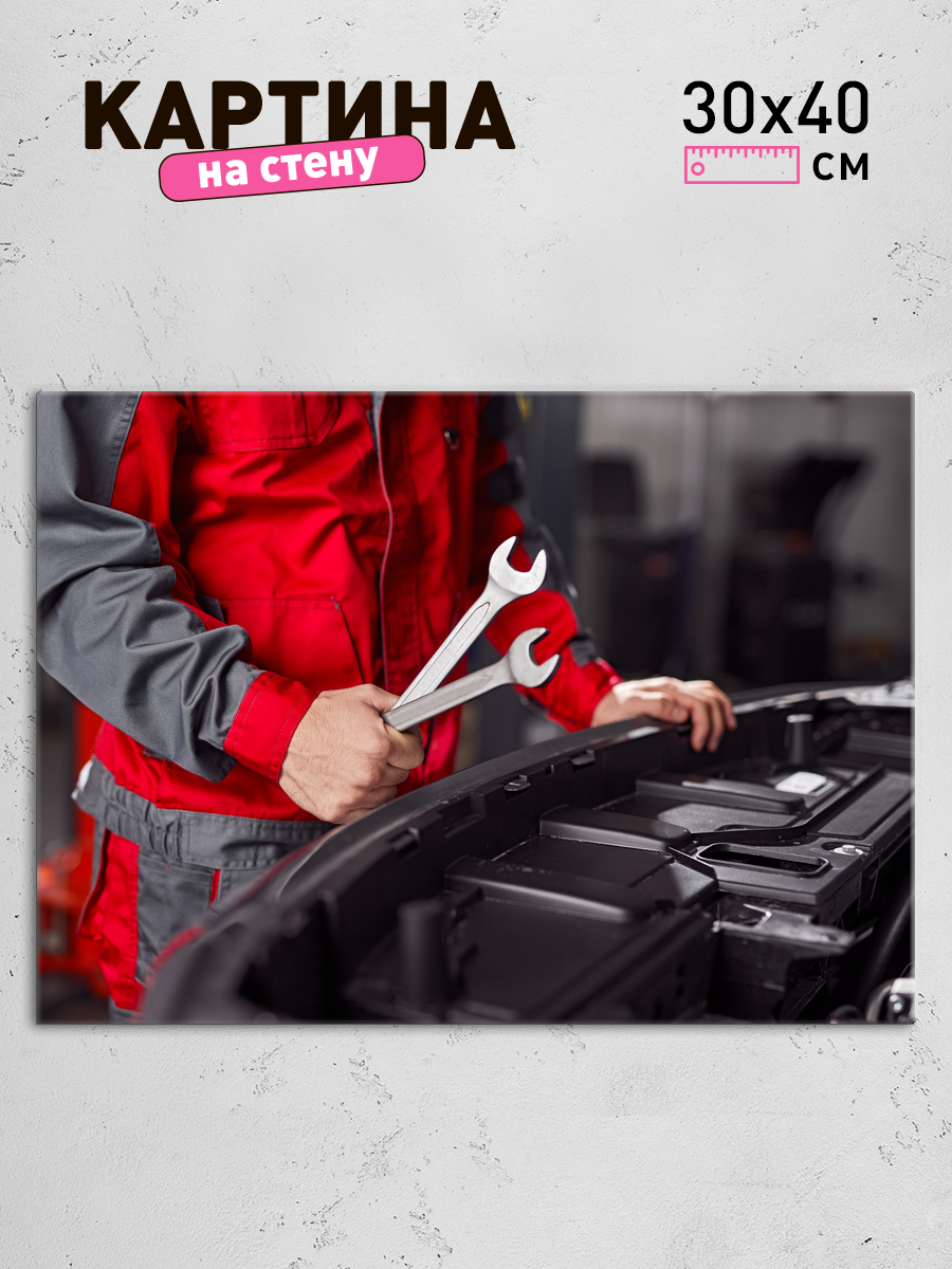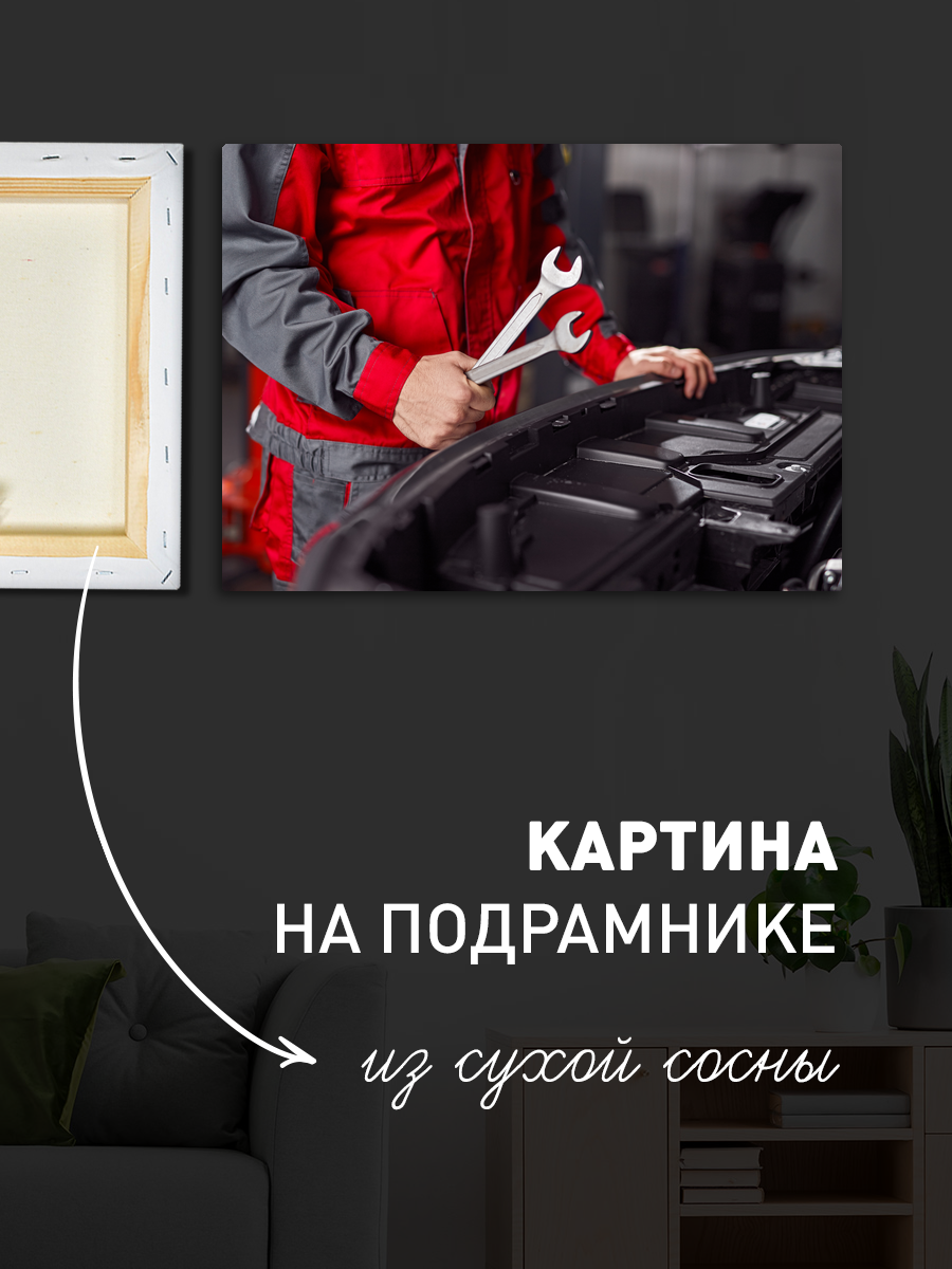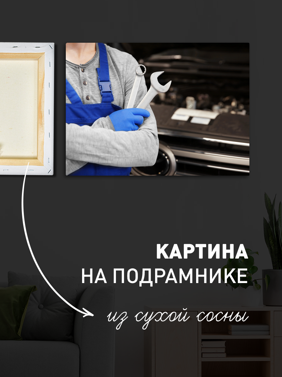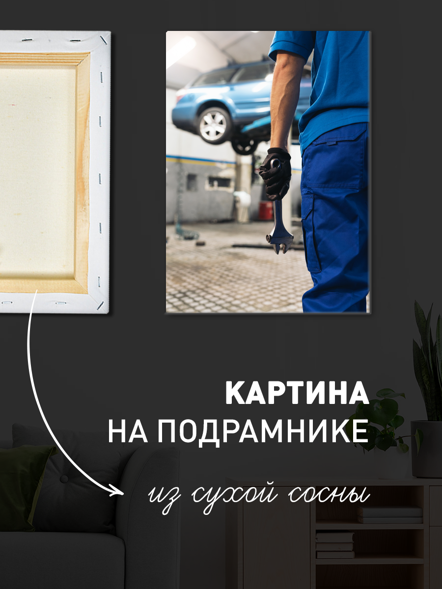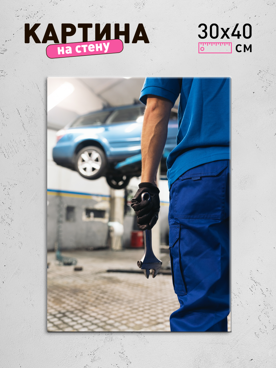Описание: Картина 50 на 70 "Механика в действии". На этом произведении искусства изображен мастеровой, который уверенно держит в руке гаечный ключ, стоя на фоне автомобиля, поднятого на подъемнике. Основная идея картины заключается в передаче силы и уверенности, которые испытывает человек, работающий с техникой. Уникальность картины заключается в детализированном изображении инструмента и автомобиля, что создает ощущение динамики и профессионализма. Эмоции, вызываемые этой картиной, – это вдохновение и мотивация. Она напоминает о том, как важно быть в гармонии с техникой и окружающим миром. Каждый раз, глядя на нее, вы будете чувствовать прилив энергии и стремление к действию, что делает её идеальным акцентом для рабочего пространства или мастерской. Эта картина отлично впишется в интерьер современного кабинета, гаража или студии, добавляя нотку креативности и профессионализма. Она также станет замечательным подарком для автолюбителей и мастеров, подчеркивая их страсть к технике и ремонту.