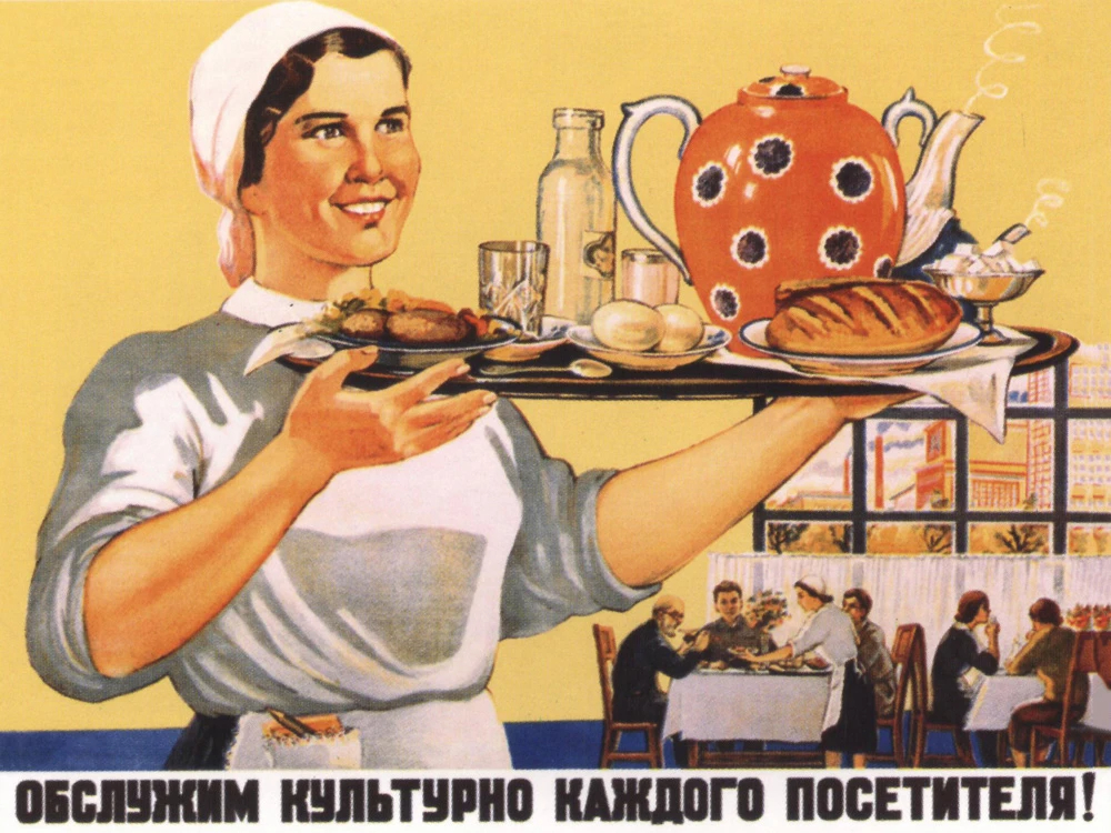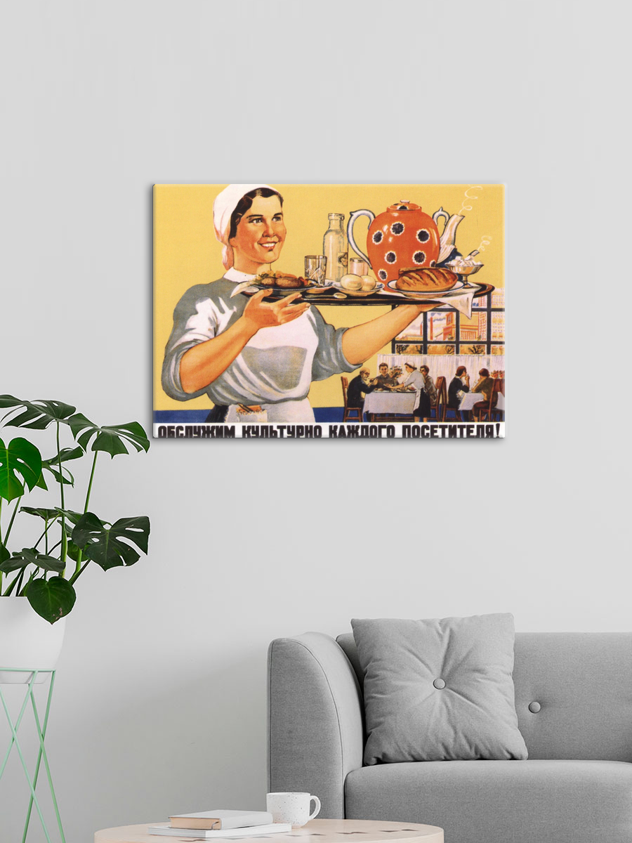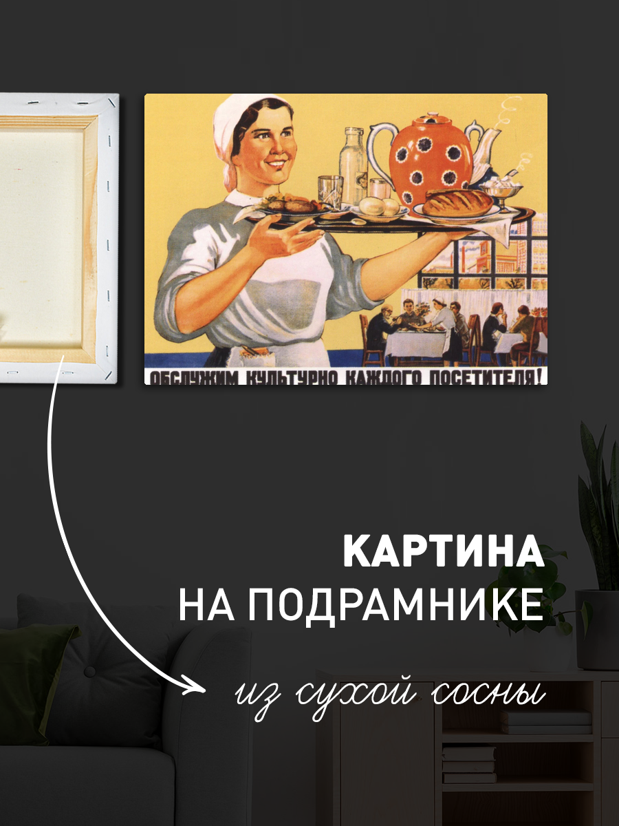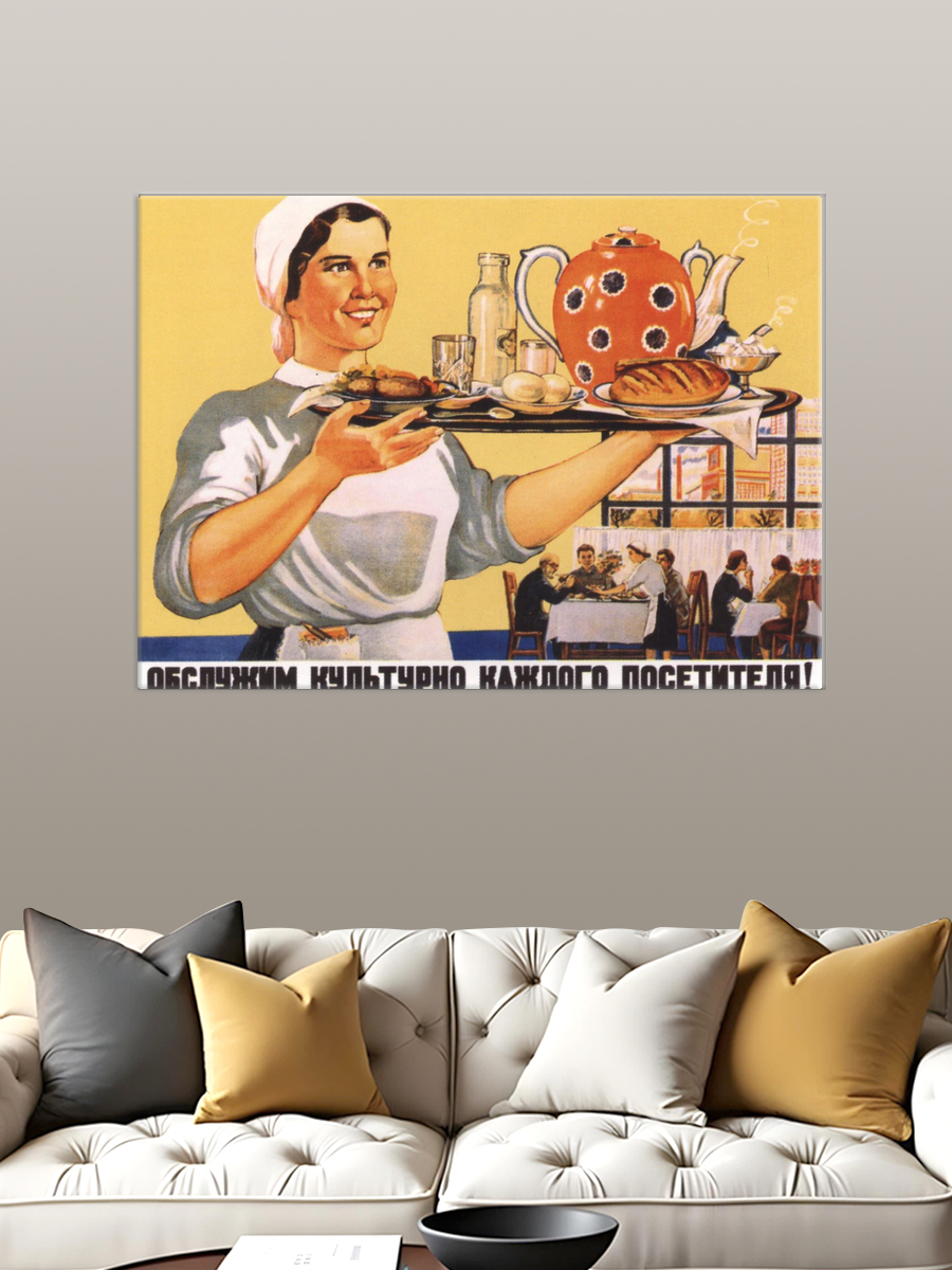 Описание: Картина 50 на 70 'Обслужим культурно каждого посетителя' представляет собой яркое и жизнеутверждающее произведение искусства, сочетающее в себе элементы советского плаката. На изображении изображена молодая женщина в белом фартуке и платке, уверенно держащая поднос с угощениями, что символизирует тепло и радушие. Основная идея картины заключается в приглашении к культурному обслуживанию, отражая дух гостеприимства и заботы о людях. Уникальность картины заключается в её способе передать атмосферу уюта и дружелюбия, которая так важна в нашем обществе. Эта картина вызывает положительные эмоции, наполняя пространство теплом и светом. Она может вызвать ностальгию по советским временам, одновременно вдохновляя на создание уютной атмосферы в вашем доме или офисе. Благодаря ярким цветам и выразительному лицу главной героини, картина способна привнести в ваше пространство динамику и жизнь, пробуждая в каждом зрителе положительные чувства и воспоминания о семейных встречах и праздниках. Картина идеально подойдет для интерьеров в стиле ретро, кантри или даже минимализма, добавляя характер и индивидуальность. Её можно повесить в кухне, столовой или кафе, где она станет центром внимания и началом интересных бесед. Также она прекрасно впишется в гостиные, создавая уютную атмосферу для общения с друзьями и близкими. Не упустите возможность добавить в своё пространство этот замечательный элемент, который будет радовать глаз и напоминать о важности тепла и заботы в нашей жизни.