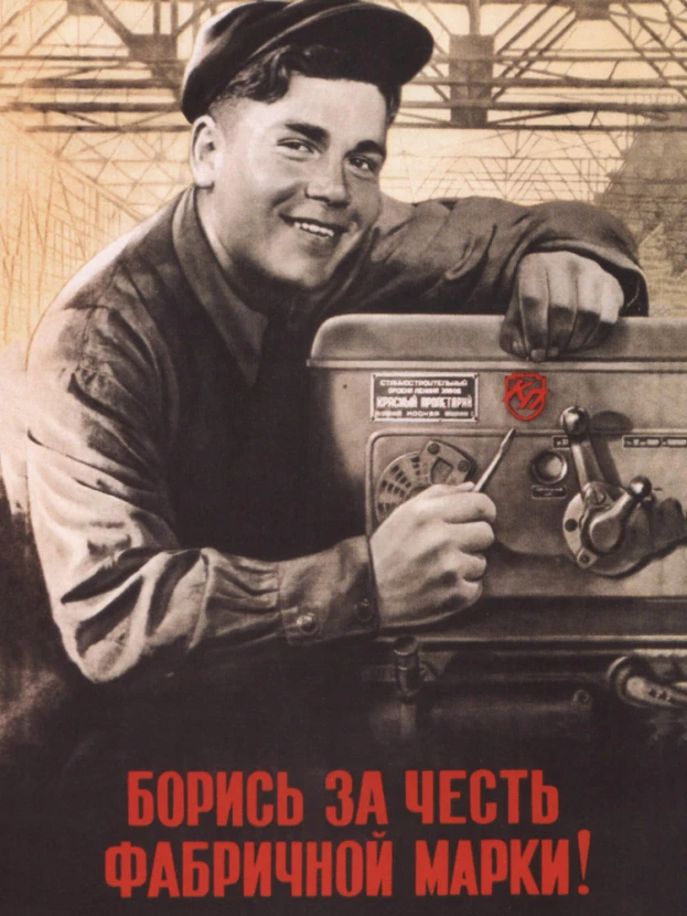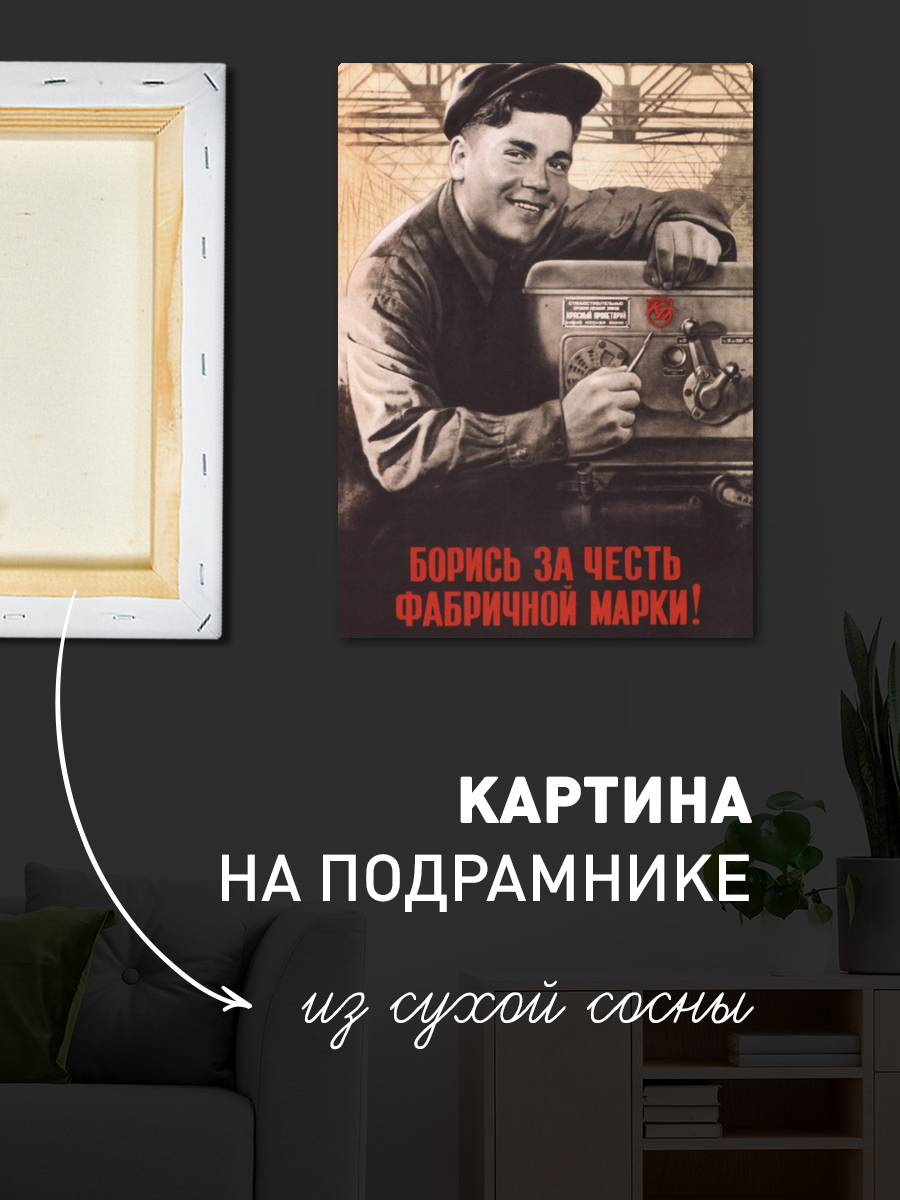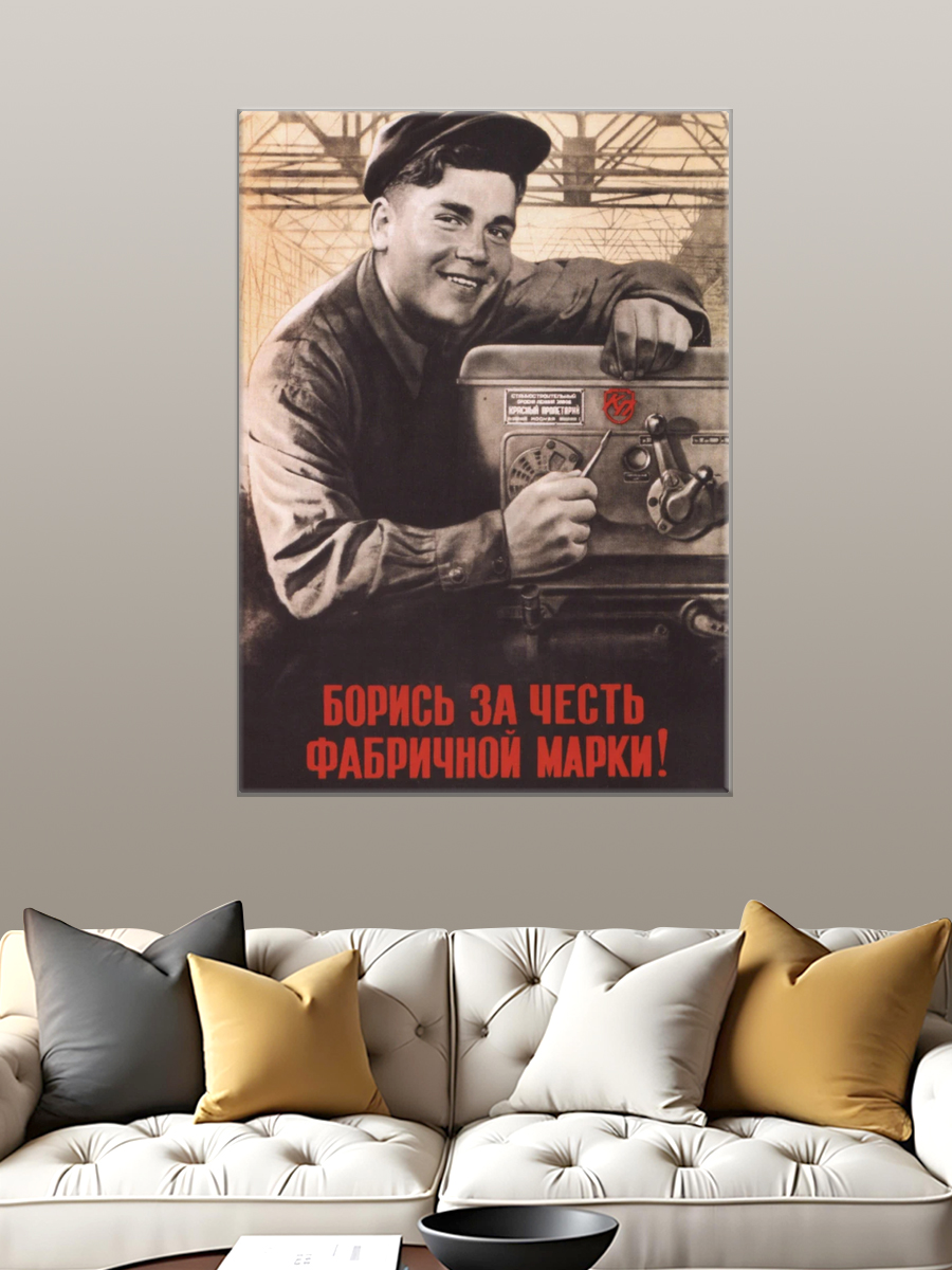 Описание: Картина 50 на 70 "Борись за честь фабричной марки!" изображает молодого рабочего, уверенно позирующего у станка, с улыбкой на лице. Это произведение искусства передает дух трудового энтузиазма и преданности делу, характерный для эпохи советского industrialизма. Основная идея картины заключается в отображении гордости и целеустремленности, которые вдохновляют людей на достижения в профессии. Уникальность этой картины в том, что она не только иллюстрирует трудовой процесс, но и вызывает воспоминания о времени, когда работа была неотъемлемой частью жизни, а достижения каждого были важны для общества. Смотря на эту картину, зритель может ощутить прилив вдохновения и мотивации, что делает её отличным дополнением для любого рабочего пространства или домашнего кабинета. Эмоции, которые она вызывает, — это уверенность, оптимизм и гордость за тяжелый труд. Эта картина отлично впишется в интерьер в стиле лофт, а также в индустриальные и винтажные пространства, подчеркивая характерные черты таких стилей. Она станет центром внимания в комнате, в которой проходят рабочие встречи или семинары, а также будет прекрасно смотреться в домашних условиях, напоминая о важности труда и упорства. Подвешенная на стене, она будет вдохновлять всех, кто её видит, на новые достижения и свершения.