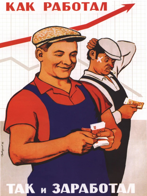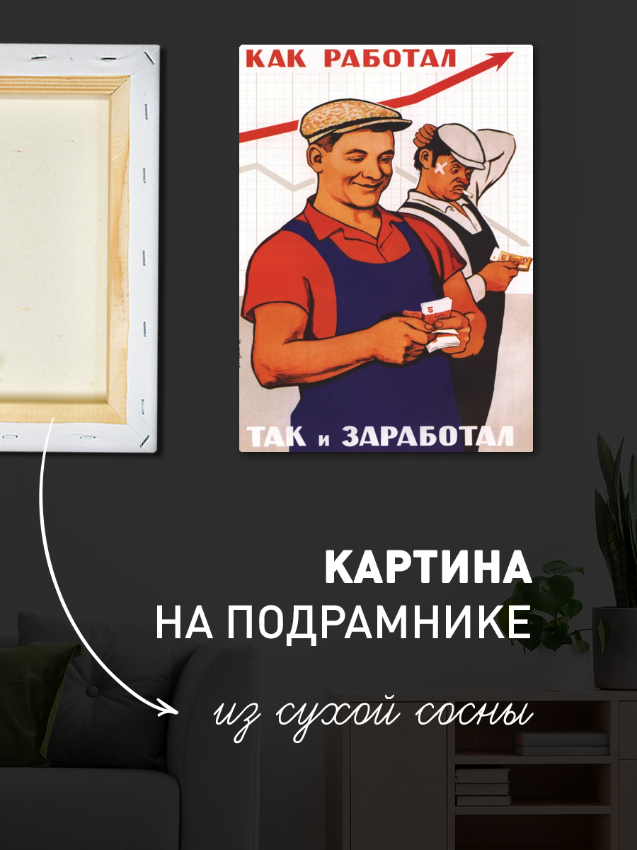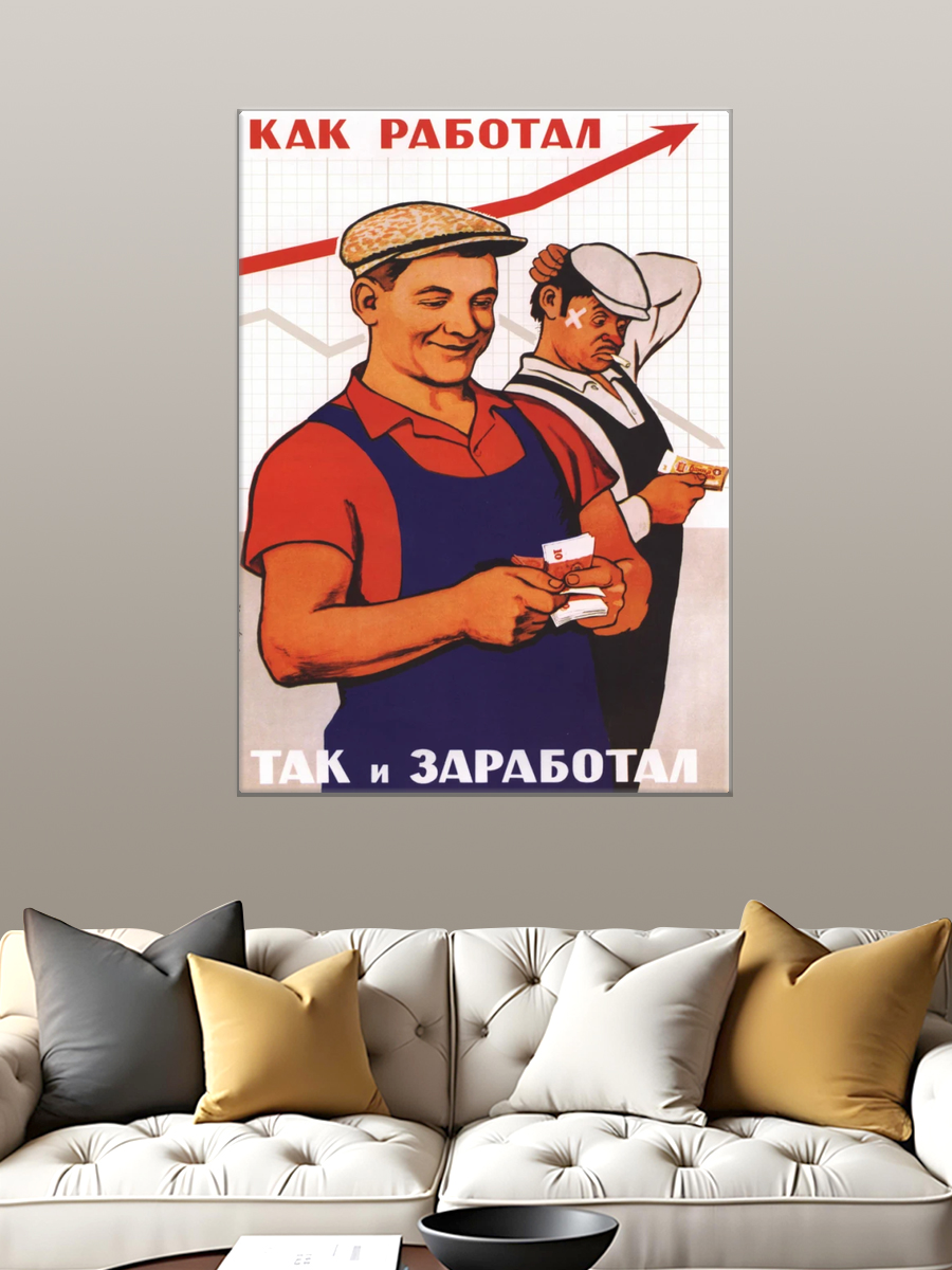 Описание: Картина 50 на 70 "Как работал, так и заработал" является ярким примером советского плаката, который передает идеи труда и вознаграждения. На изображении два рабочих: один с улыбкой держит деньги, а другой, с серьезным выражением лица, также подсчитывает свои средства. Картина символизирует достижения и трудолюбие, что делает её уникальной и привлекательной для любого ценителя искусства. Эта работа вызывает чувство гордости за труд и стремление к успеху. Она вдохновляет на позитивные действия и напоминает о важности упорства и работы. Яркие цвета, такие как красный и бежевый, создают ощущение энергии и динамики, что делает картину живой и наполненной смыслом. Картина отлично впишется в интерьер офисов, кабинетов или рабочих пространств, где ценятся труд и достижение целей. Она также будет уместна в домашних условиях, добавляя акцент в гостиной или рабочем кабинете. Такой арт-объект станет не только элементом декора, но и источником вдохновения для всех, кто его увидит. Разместив её на стене, вы создадите атмосферу, способствующую работе и успеху.