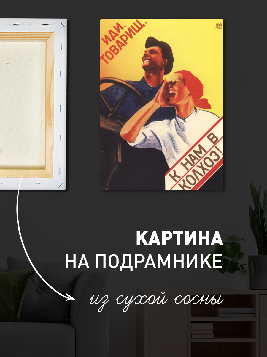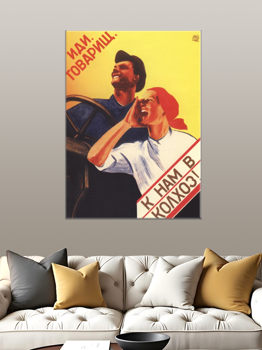 Описание: Картина 50 на 70 'Иди, товарищ, к нам в колхоз!' – это яркое произведение искусства, погружающее зрителя в атмосферу советской эпохи. На картине изображены два человека, один из которых взывает к действию, а другой с энтузиазмом отвечает. Эта работа символизирует коллективизм, труд и стремление к совместному развитию, что делает её уникальной в своем роде. Эмоции, которые вызывает данное произведение, могут варьироваться от ностальгии до вдохновения. Яркие цвета, такие как желтый и красный, создают ощущение энергии и оптимизма, в то время как черные акценты добавляют глубины и контраста. Эта картина способна пробуждать в зрителе желание действовать, поддерживать дух единства и работать на общее благо. Картина будет прекрасно смотреться в интерьере, оформленном в стиле ретро или модерн. Она идеально подойдет для офисных пространств, образовательных учреждений или домашних кабинетов, где важен дух сотрудничества и творчества. Также это отличный элемент для выставок или галерей, подчеркивающий культурные и исторические аспекты. Разместив её на видном месте, вы не только украсите пространство, но и создадите атмосферу, вдохновляющую на новые свершения.