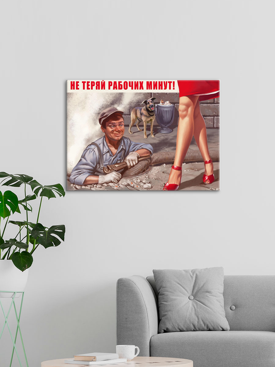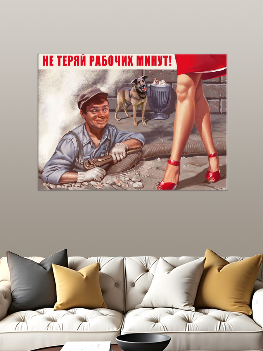 Описание: Картина 50 на 70 'Не теряй рабочих минут!' — это яркий и динамичный холст, на котором изображены рабочие моменты из жизни. На переднем плане мы видим улыбающегося рабочего, который с энтузиазмом занимается своим делом, а на фоне — энергичная женщина в красном платье, что символизирует сочетание труда и отдыха. Уникальность этой картины заключается в контрасте между усилиями труда и красотой жизни, что вдохновляет и мотивирует на достижения. Эта картина вызывает положительные эмоции: она наполняет пространство энергией, оптимизмом и жизненной силой. Человек, глядя на неё, ощущает прилив бодрости и желания действовать. Яркие цвета и выразительные детали создают атмосферу, в которой хочется находиться. Картина отлично подходит для интерьеров, оформленных в стилях модерн и поп-арт, а также для офисных пространств, где необходима мотивация и креативный подход. Она станет акцентом в любом помещении: в гостиной, кабинете или даже в кухне, добавляя изюминку и поднимая настроение. Повесьте её на видном месте, и она будет вдохновлять вас и ваших гостей каждый день.