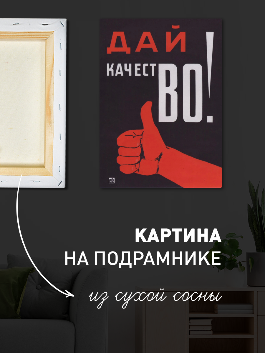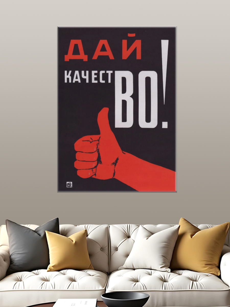 Описание: Картина 50 на 70 "ДАЙ КАЧЕСТВО!" является ярким примером советского плаката, который сочетает в себе силу и энергетику. На фоне черного цвета выделяются красный и белый, формируя мощный визуальный контраст. Изображение большой руки с поднятым большим пальцем символизирует одобрение и стремление к качеству, вдохновляя зрителей на активные действия и достижения. Эта картина наполнена позитивом и мотивацией, способствуя созданию атмосферы уверенности и настойчивости. Эта работа способна вызывать у зрителя чувства оптимизма и стремления к совершенству. Яркие цвета и четкие формы привлекают внимание, вызывая желание действовать и преуспевать. Картина станет отличным акцентом в любом интерьере, добавляя в него динамику и жизненную энергию. Она идеально впишется в офисные пространства, где необходим позитивный настрой и мотивация, а также в креативные студии или рабочие кабинеты. Картина может стать ярким акцентом в домашнем интерьере, привнося в него элемент искусства и вдохновения. Разместите её на стене в гостиной, кабинете или даже на кухне, и она будет напоминать о важности качества и стремления к лучшему каждый день.