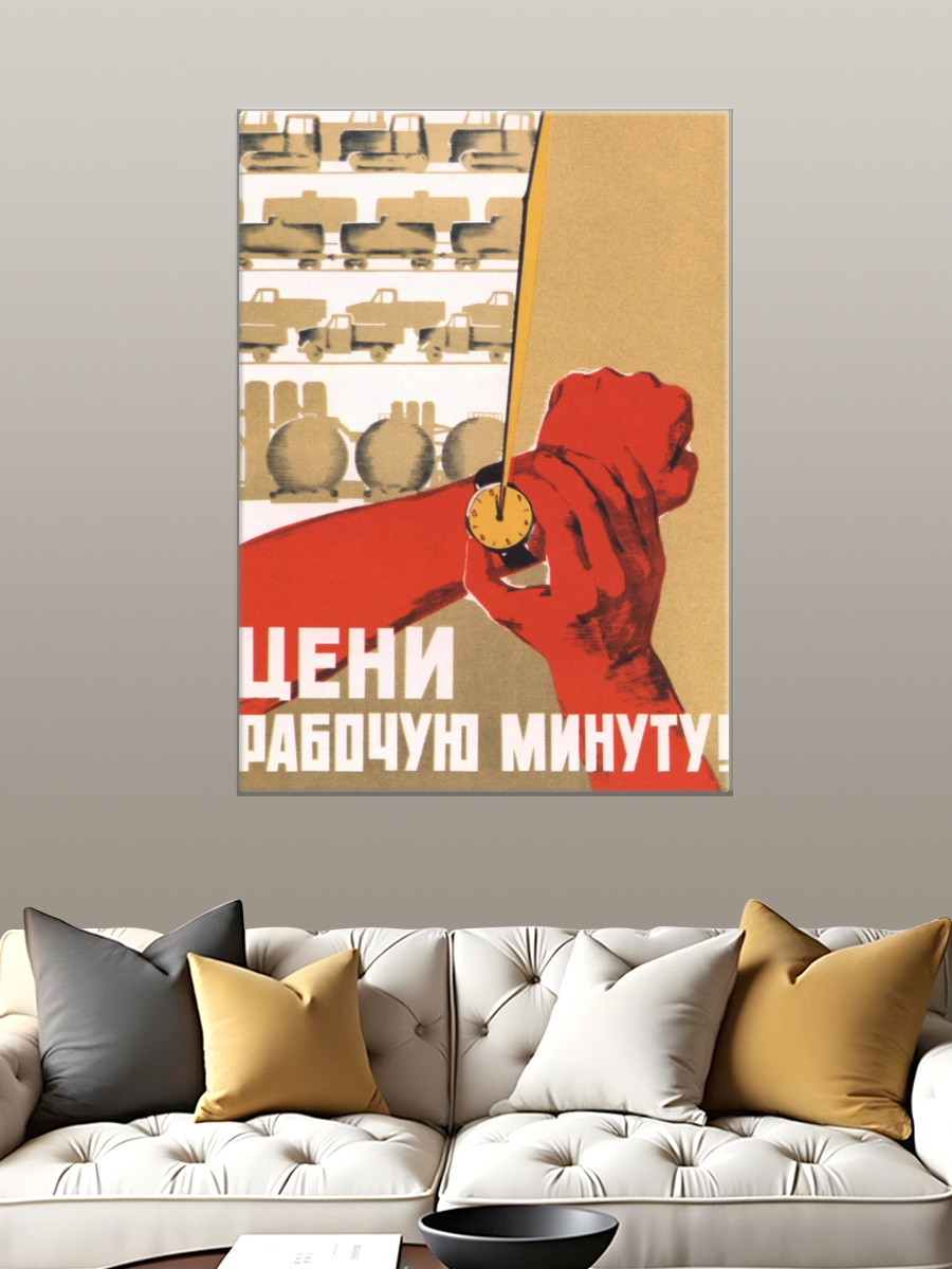 Описание: Картина 50 на 70 "Цени рабочую минуту" представляет собой яркий и выразительный плакат, который передает мощное послание о значимости времени и труда. На картине изображена рука, держащая часы, что символизирует ценность каждой минуты. Фон состоит из стилизованных изображений грузовиков и промышленных объектов, что подчеркивает тему работы и производства. Эта картина вызывает широкий спектр эмоций: от вдохновения до мотивации действовать и ценить каждое мгновение. Яркие красные и бежевые цвета создают контраст, привлекая внимание и создавая атмосферу энергичности и активности. Она может стать источником вдохновения в вашем рабочем пространстве или уютной атмосферы в домашнем интерьере. Картина отлично впишется в различные стили интерьера: от индустриального до модерн. Ее можно повесить в офисе, кабинете, на кухне или в студии, где она будет напоминать о важности времени и труда. Благодаря своему выразительному дизайну и актуальному посланию, она станет не только элементом декора, но и стимулом к действию для вас и ваших гостей.